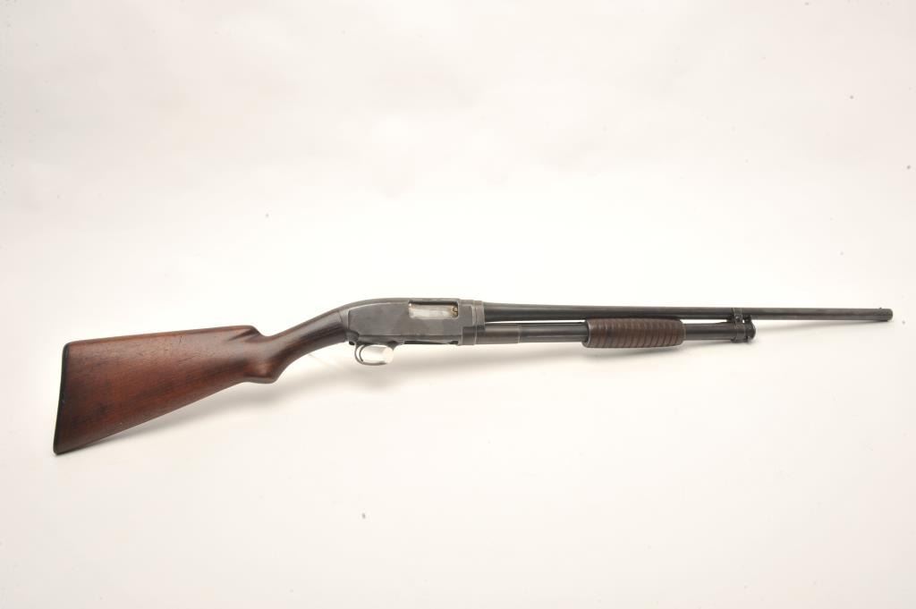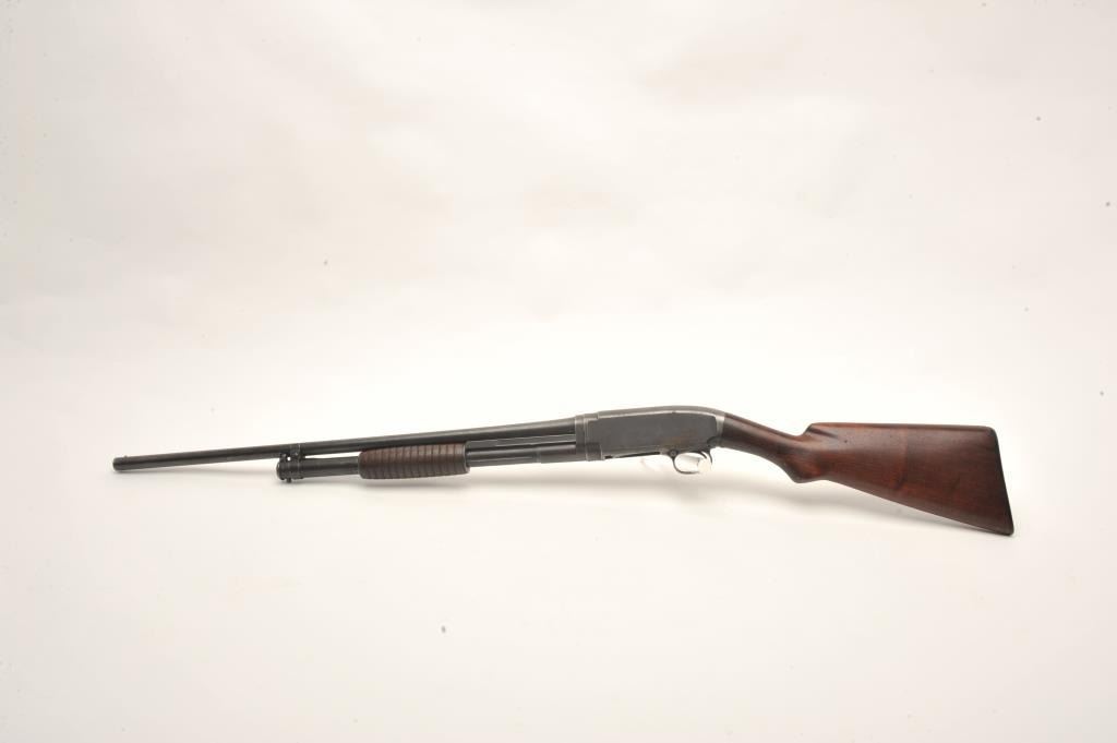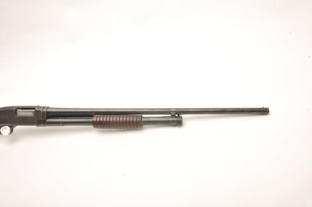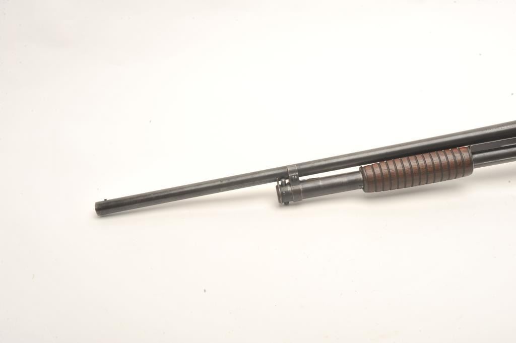Winchester Model 1912 pump shotgun, 20 gauge, serial #11869. The shotgun is in good overall condition with a 25” barrel with a steel bead front sight. The barrel and magazine retain a significant amount of their muted blue finish with light surface erosion. The receiver has gone primarily to patina with some light surface rust on the right side of the action. The smooth wood stocks are in good condition showing smallmars and compressions. The butt stock ends with a hard rubber Winchester marked butt plate and a 13 ½” LOP. The bore is dirty but should clean to good, the action crisp and markings are sharp. (C+R) Est.: $250-$500.