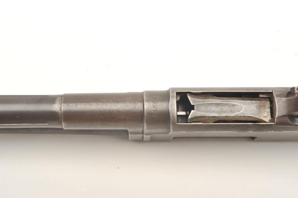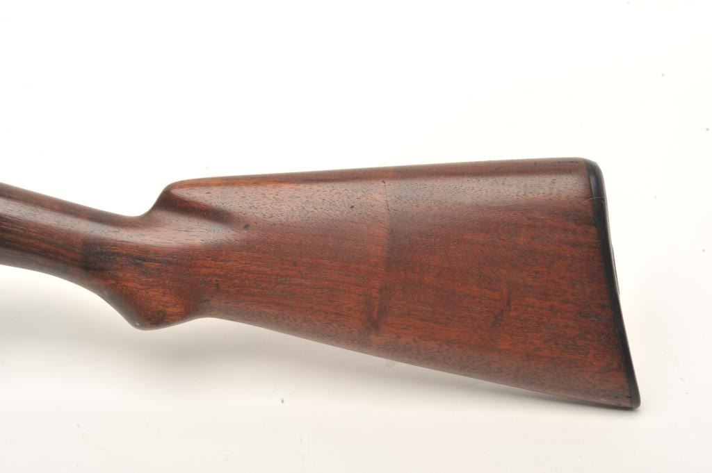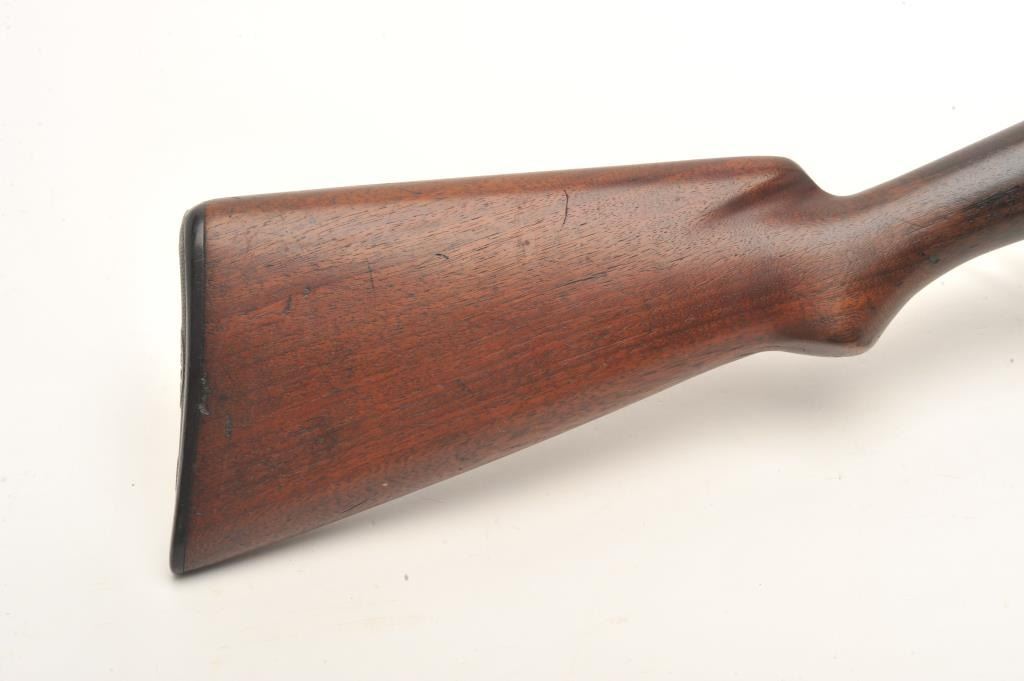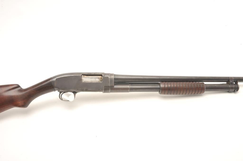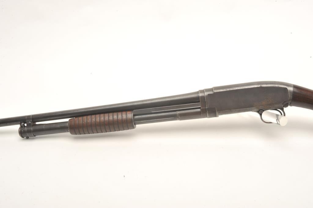 Winchester Model 1912 pump shotgun, 20 gauge, serial #11869. The shotgun is in good overall condition with a 25” barrel with a steel bead front sight. The barrel and magazine retain a significant amount of their muted blue finish with light surface erosion. The receiver has gone primarily to patina with some light surface rust on the right side of the action. The smooth wood stocks are in good condition showing smallmars and compressions. The butt stock ends with a hard rubber Winchester marked butt plate and a 13 ½” LOP. The bore is dirty but should clean to good, the action crisp and markings are sharp. (C+R) Est.: $250-$500.