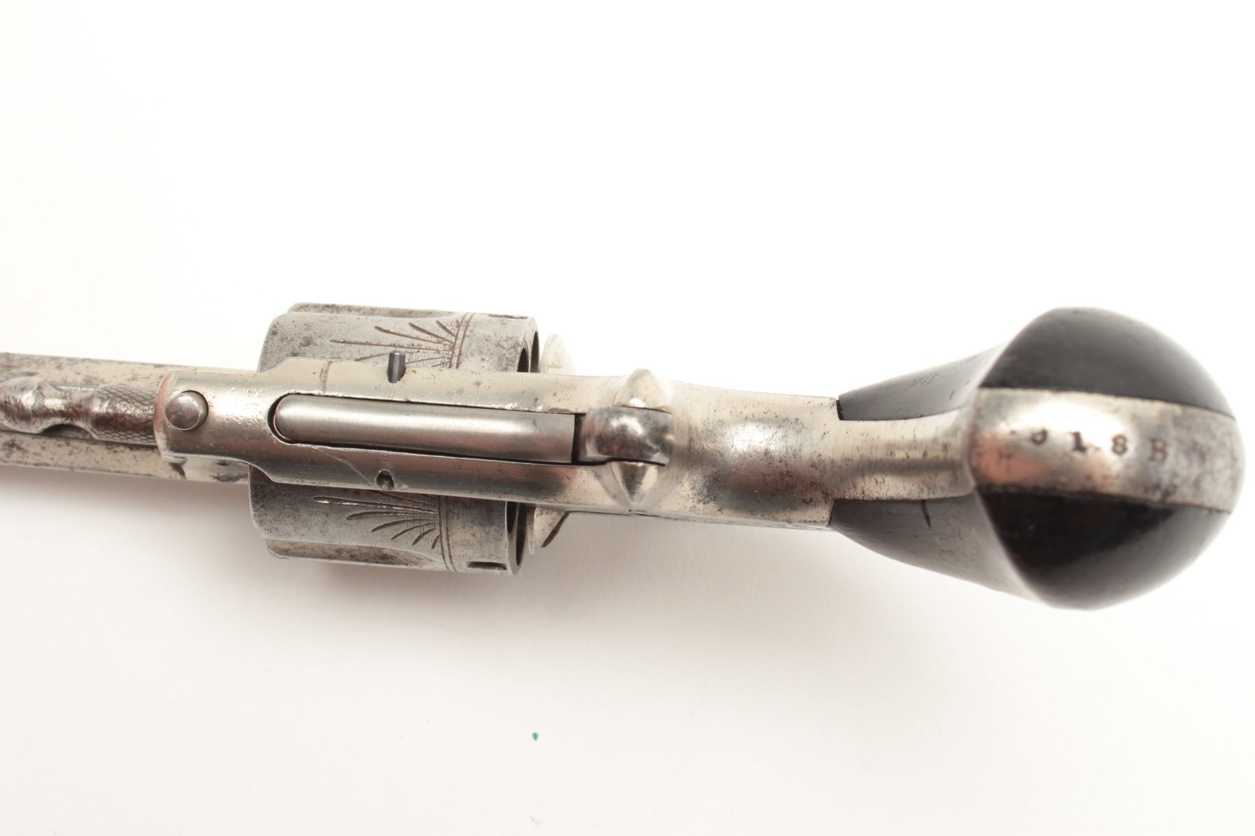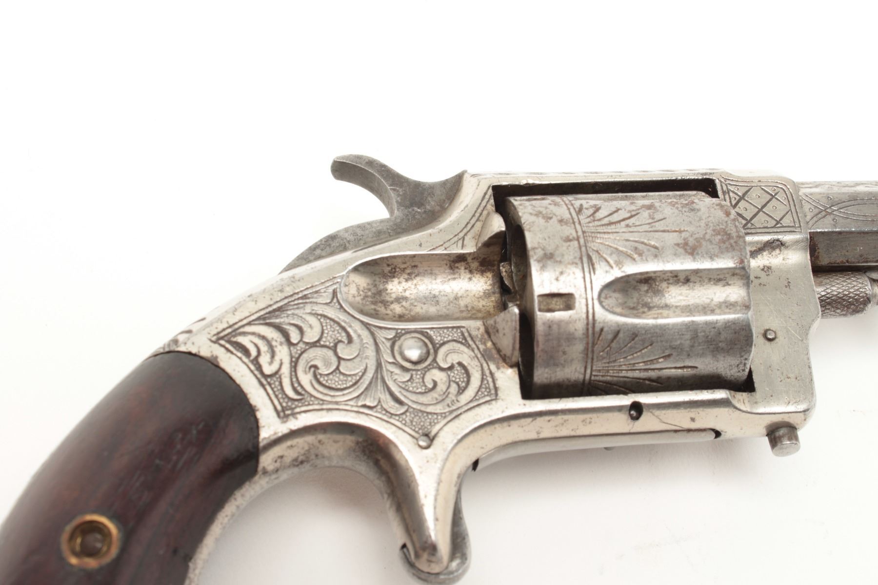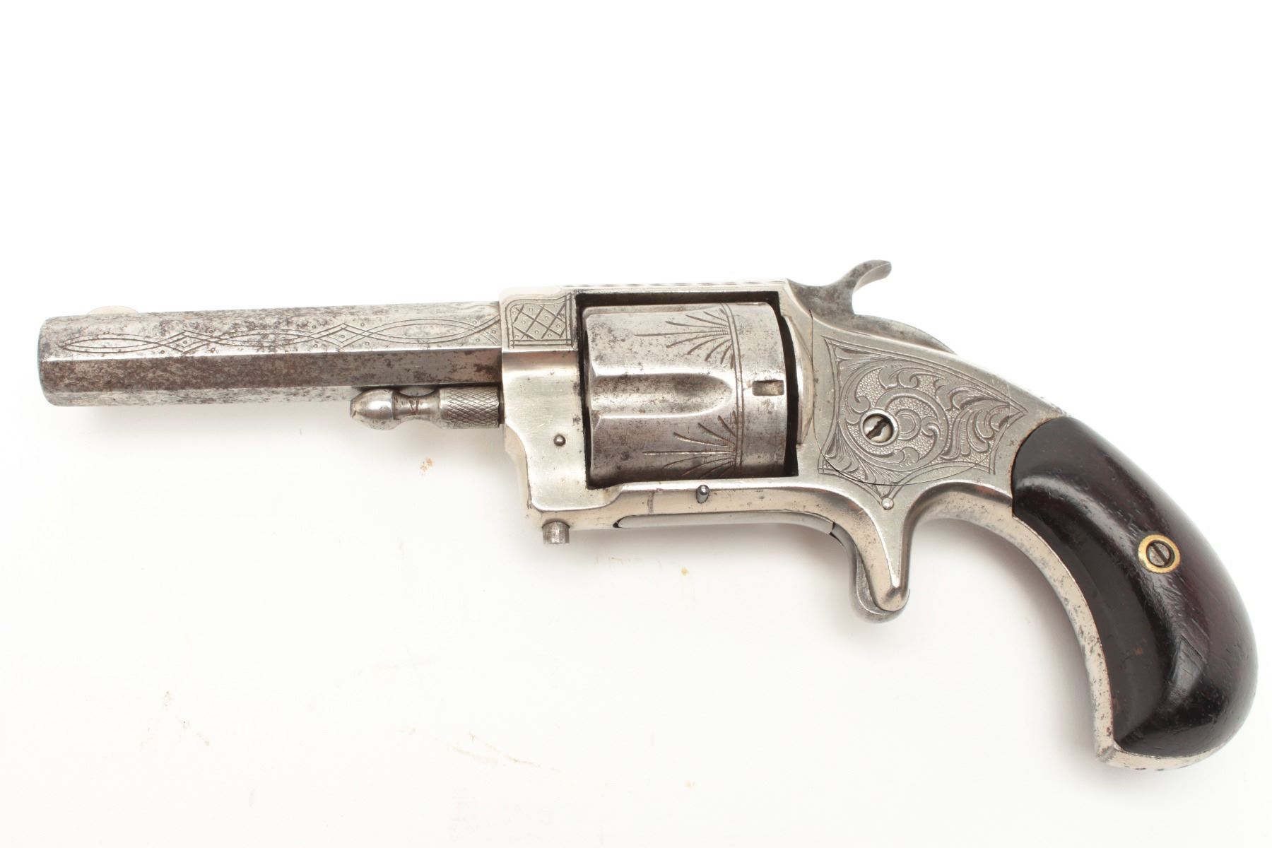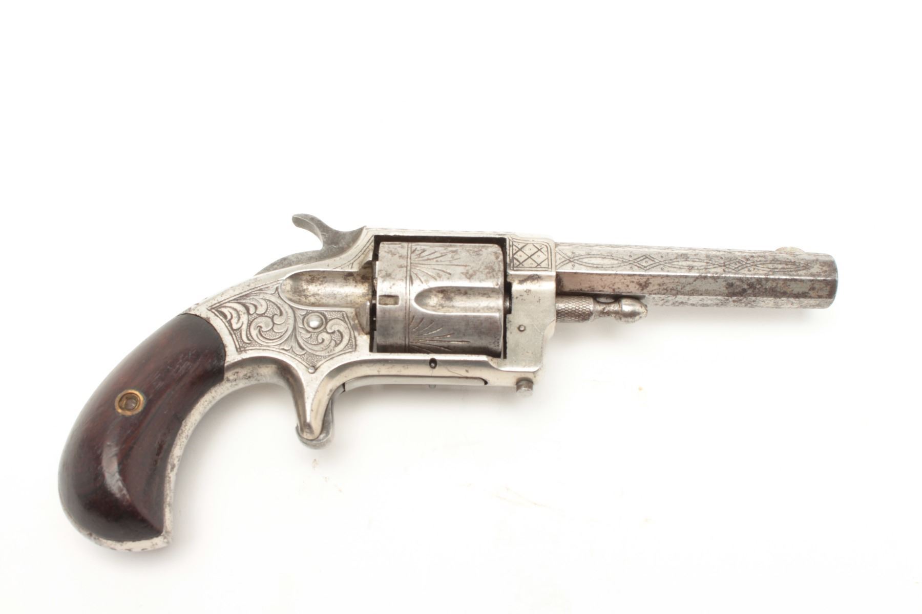 Lot 1154 Whitneyville .38RF caliber spur trigger revolver, nickel finished, engraved with 3.5” long barrel,
