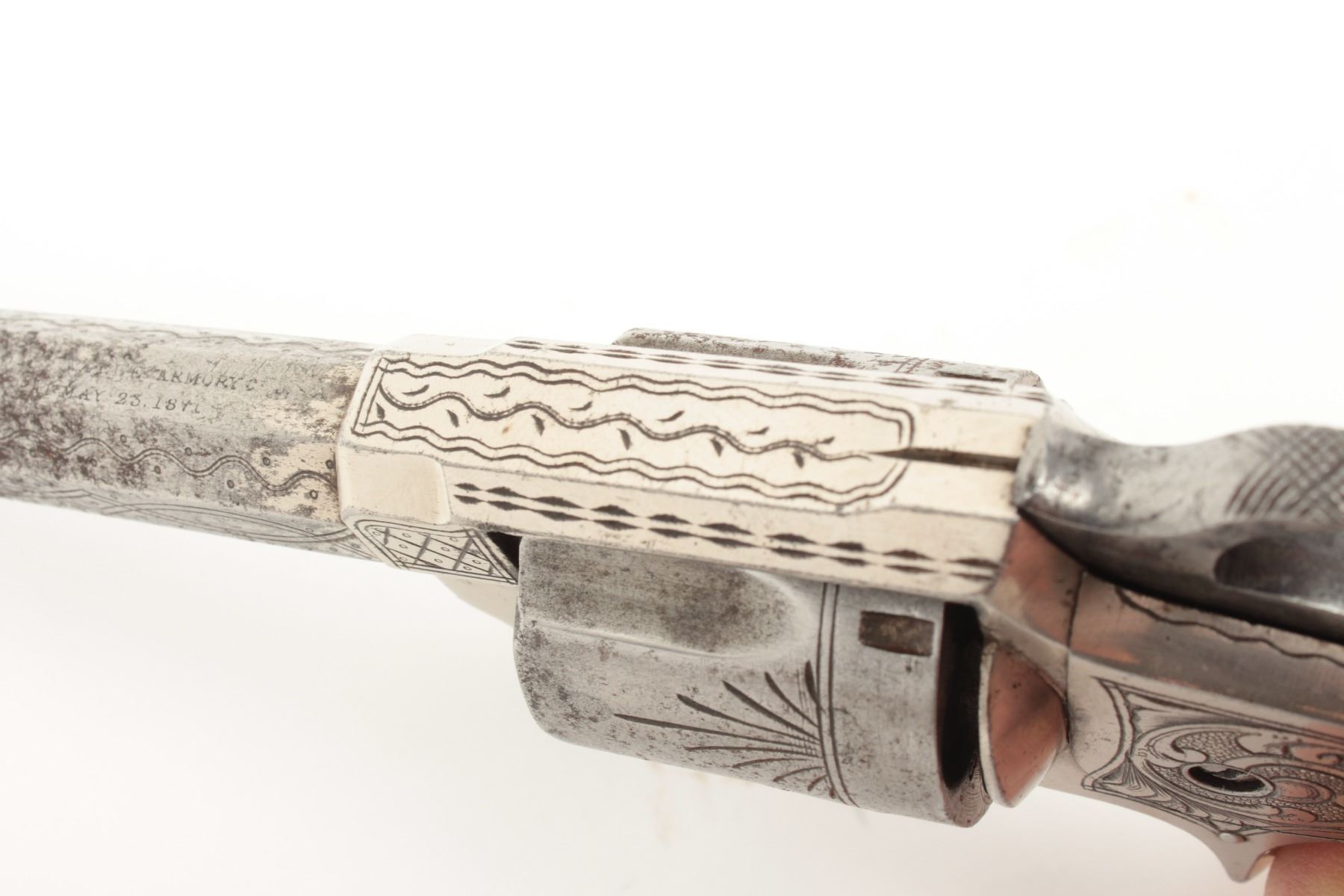 Whitneyville .38RF caliber spur trigger revolver, nickel finished, engraved with 3.5” long barrel, rosewood grips, S/N 918B, in overall very good condition. (Antique). From the Whitney family collection. Est.: $400-$800.