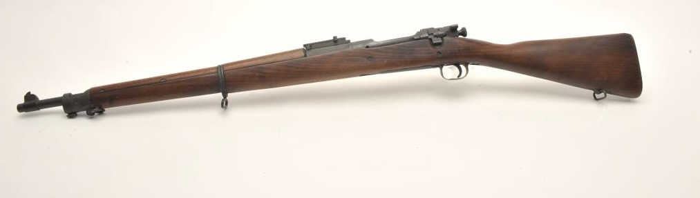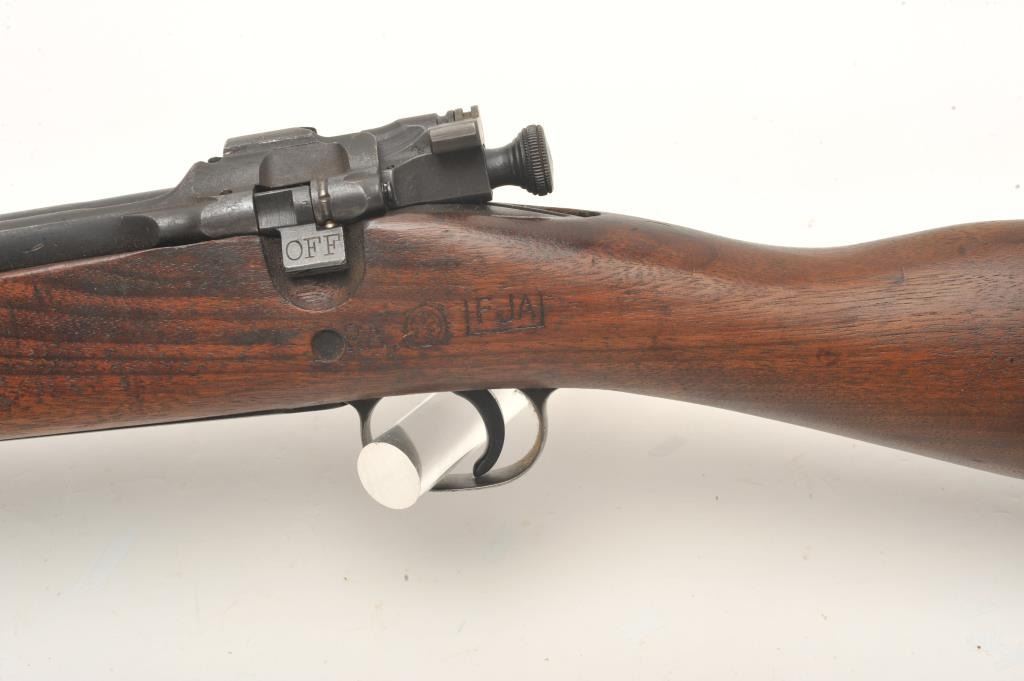 Springfield U.S. Model 1903 bolt action rifle, .30 caliber, serial #955083. The rifle is in good overall condition with a 24” barrel with a blade front and military ladder style rear sights. The barrel andreceiver retain the majority of their military finish with wear at the muzzle and light surface rust on the trigger guard. The barrel is Springfield and USMC marked and dated 9-43. The smooth wood stock is in good overall condition with mars and compressions consistent with service use. The stock has numerous cartouches including a P behind the trigger guard and “FJA” on the left side below the tang. The stock includes slingswivels, canvas military style sling and ends with a smooth metal butt plate with trap. The bore is fair, the action is crisp and markings are sharp. (C+R) Est.: $300-$600.
