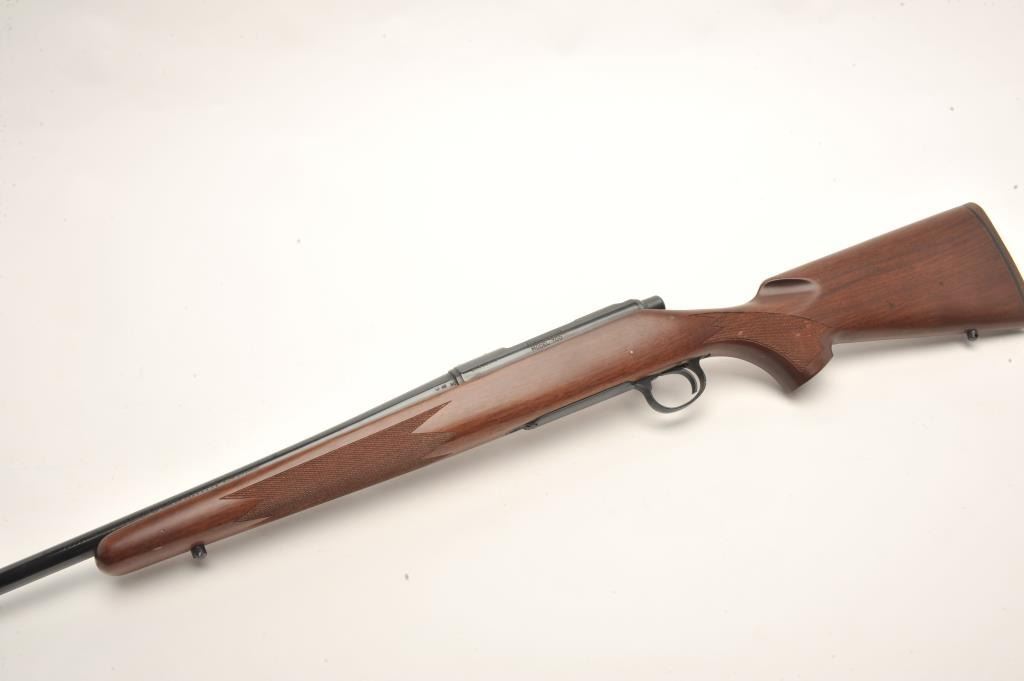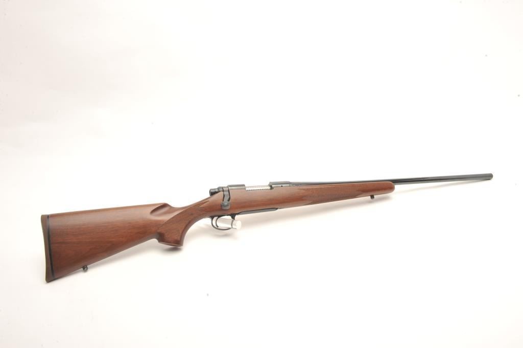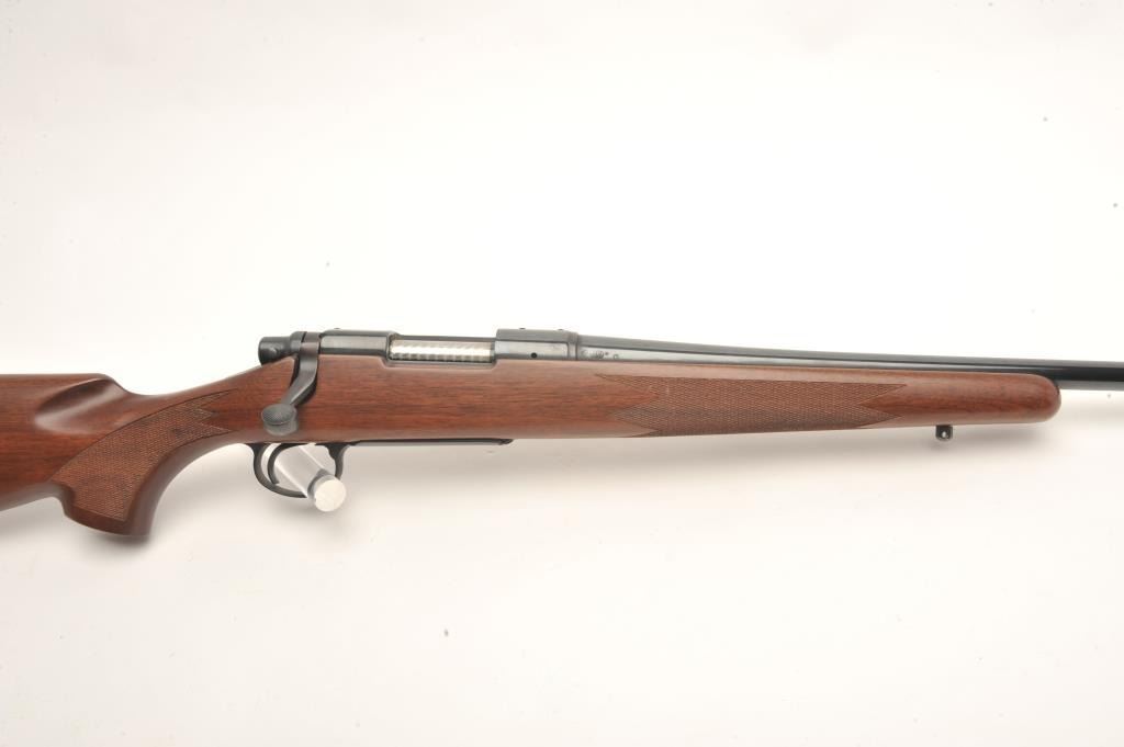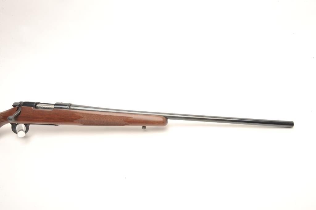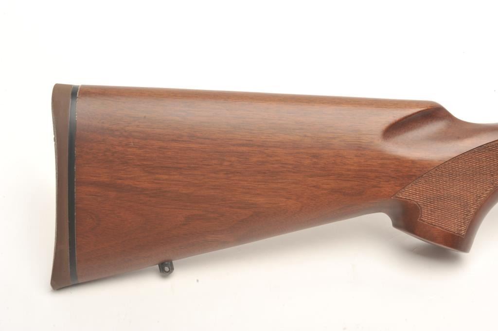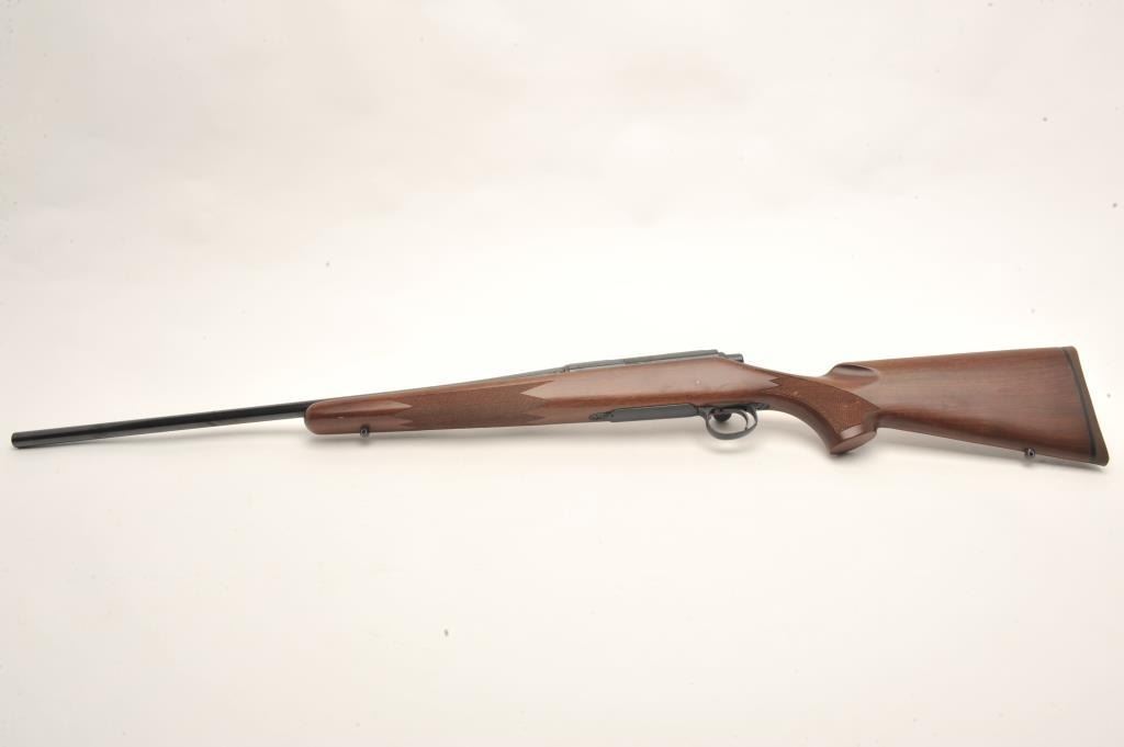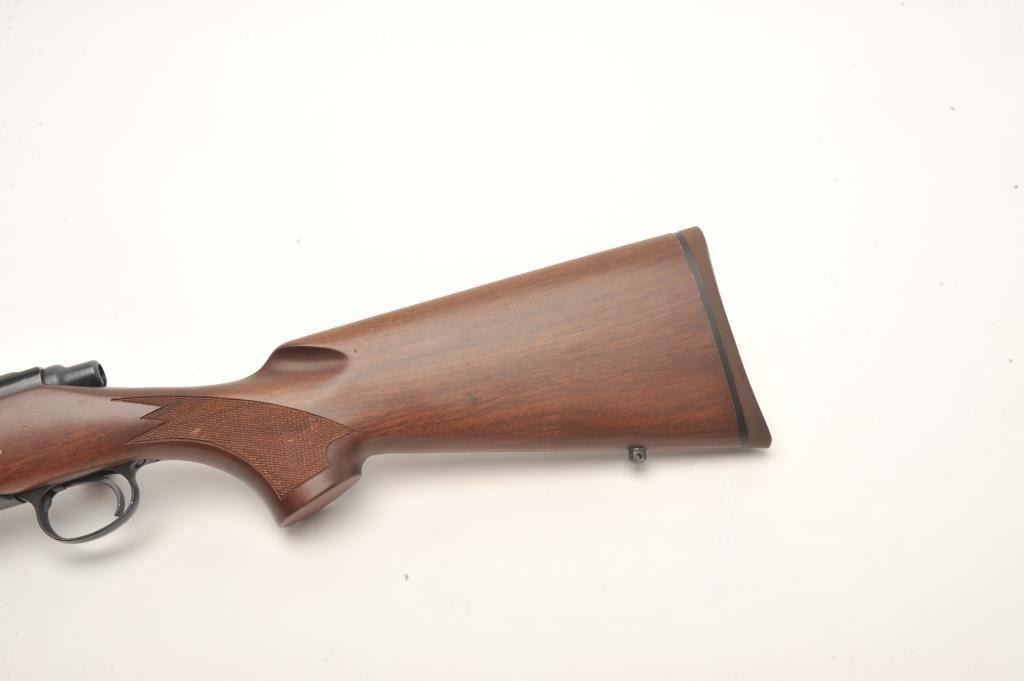 Remington Model 700 bolt action rifle, .250 Savage caliber, serial #B6579574. The rifle is in very good overall condition with a 24” barrel. The barrel and receiver retain nearly all of their polished blue finish with the top of the receiver having been drilled and tapped for a scope mount and the bolt engine turned. The checkered wood stock is in very good condition with a couple of small mars and some flattening of checkering. The butt stock ends with a Remington marked rubber butt pad. The bore is dirty but will clean to good, the action crisp and markings are sharp on this desirable Remington in a great chambering. (Modern) Est.: $400-$800.
