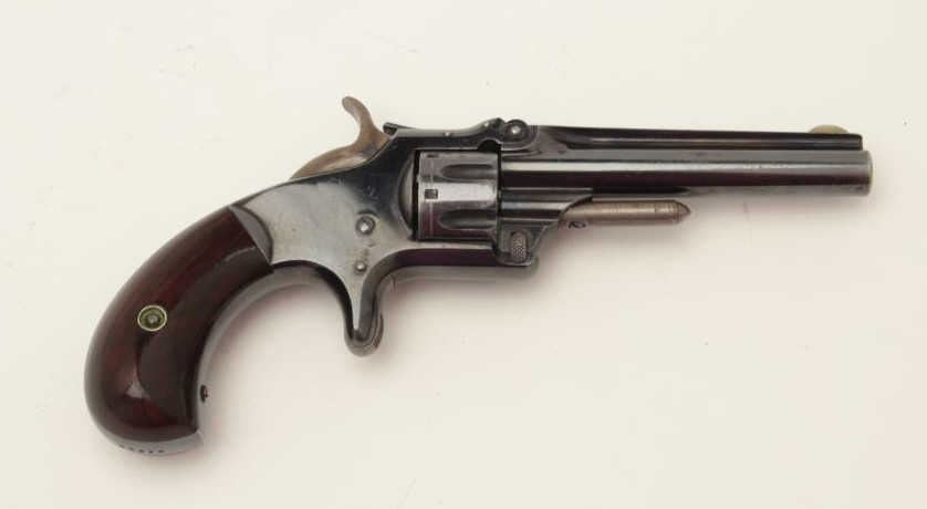 Smith & Wesson Model 1 3rd Issue spur trigger revolver, .22 caliber, 3.25” barrel, blued finish, rosewood grips, S/N 54074, in overall fine to near excellent condition showing the majority of its original bright blue finishwith original case colors on hammer and drifted colors on the shell ejector rod beneath the barrel; crisp action and markings, fine bore and fine grips. (Antique). Est.: $400-$800.