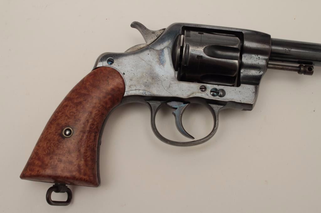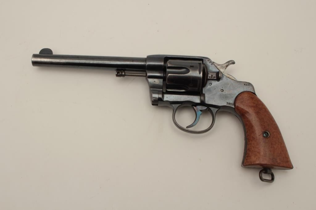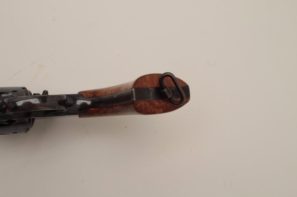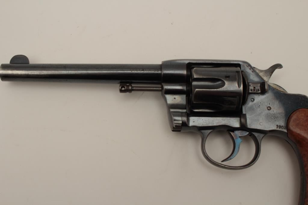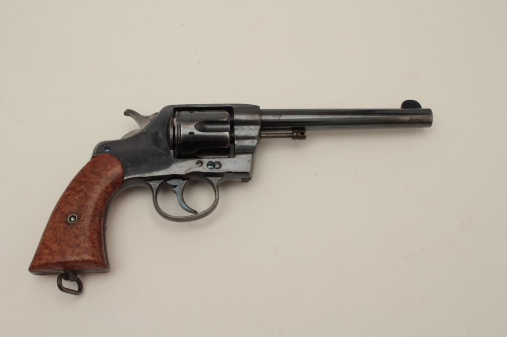 Colt Model 1901 U.S. Military issue .38 L.C. caliber revolver, S/N 198316. Inspected by Rinaldo A. Carr and John T. Thomson showing their initials along with 1903 date. 80%-90% commercial quality high polish originalfactory finish remains with minor aging and even loss at holstering and hand contact areas. Well marked. The grips have been period changed to birdseye maple retaining Colt escutcheon and fire blue screw. Thesegrips are expertly made and beautifully fit upgrading the plain wood military style possibly for the officer who carried the piece on custom order. The action is tight an d the bore is bright. A very nice example.(C&R/NO PPT) Est.: $400-$800
