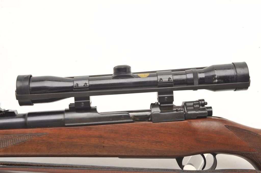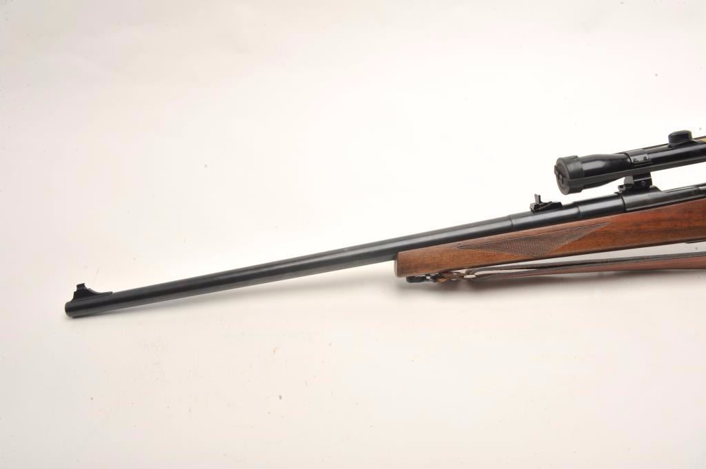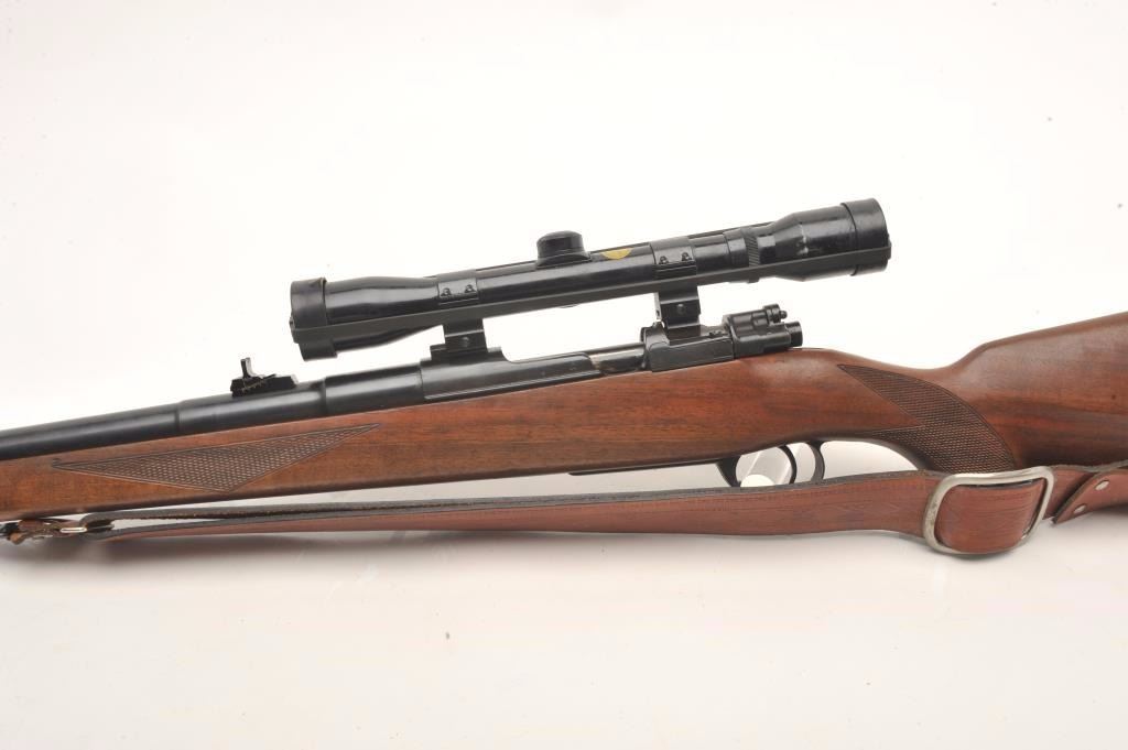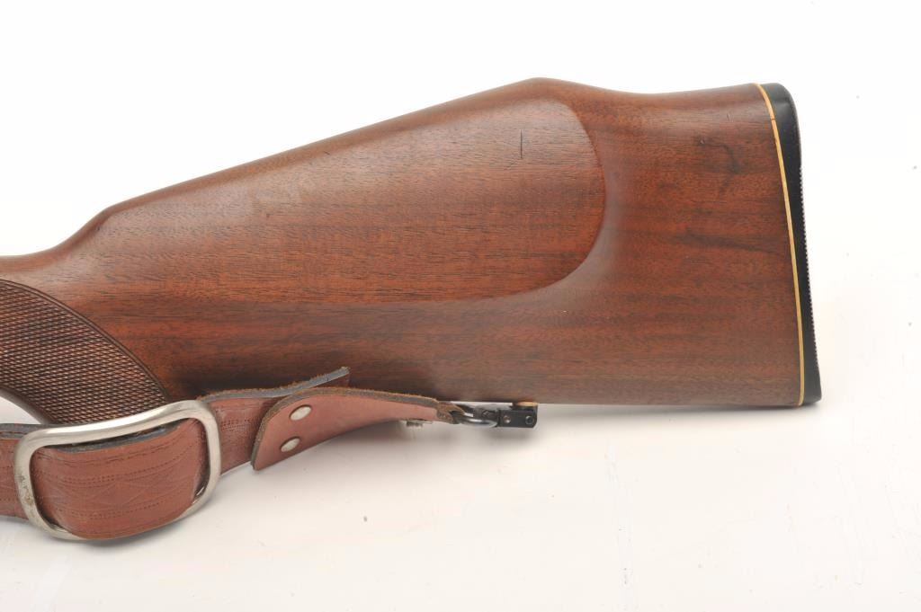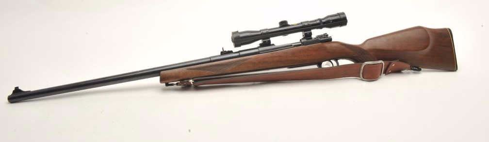 Sporterized Siamese Mauser bolt action rifle with Navy Arms 26.5” heavy round barrel, .45-70 caliber, blued finish, checkered wood stock, leather sling, no visible S/N, mounted with an All-Pro scope displaying crispoptics, in overall very good + condition as customized; crisp action, fine bore, very good wood. (Modern). Est.: $300-$600.