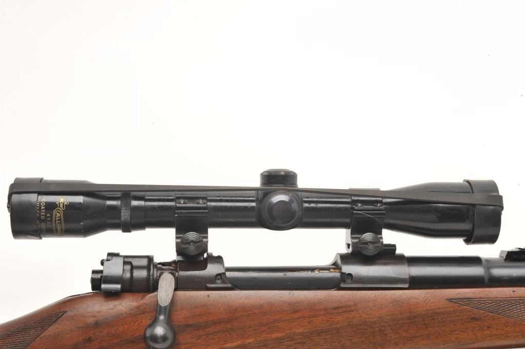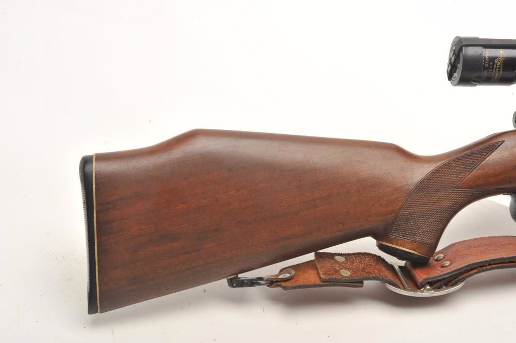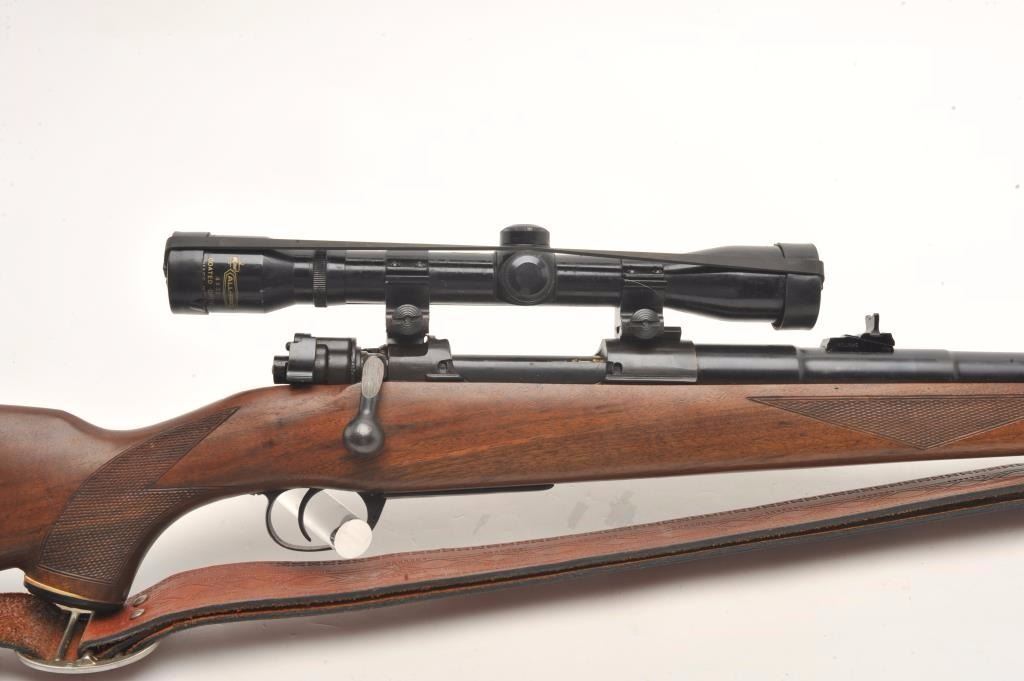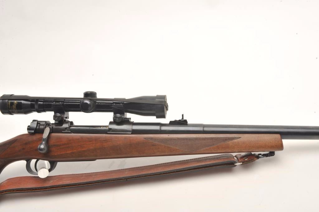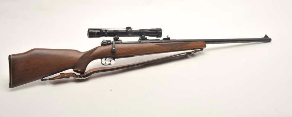 Sporterized Siamese Mauser bolt action rifle with Navy Arms 26.5” heavy round barrel, .45-70 caliber, blued finish, checkered wood stock, leather sling, no visible S/N, mounted with an All-Pro scope displaying crispoptics, in overall very good + condition as customized; crisp action, fine bore, very good wood. (Modern). Est.: $300-$600.