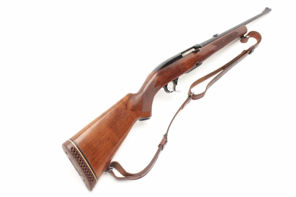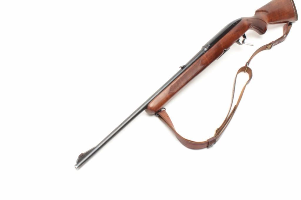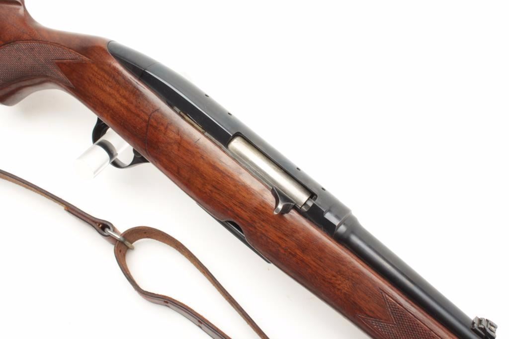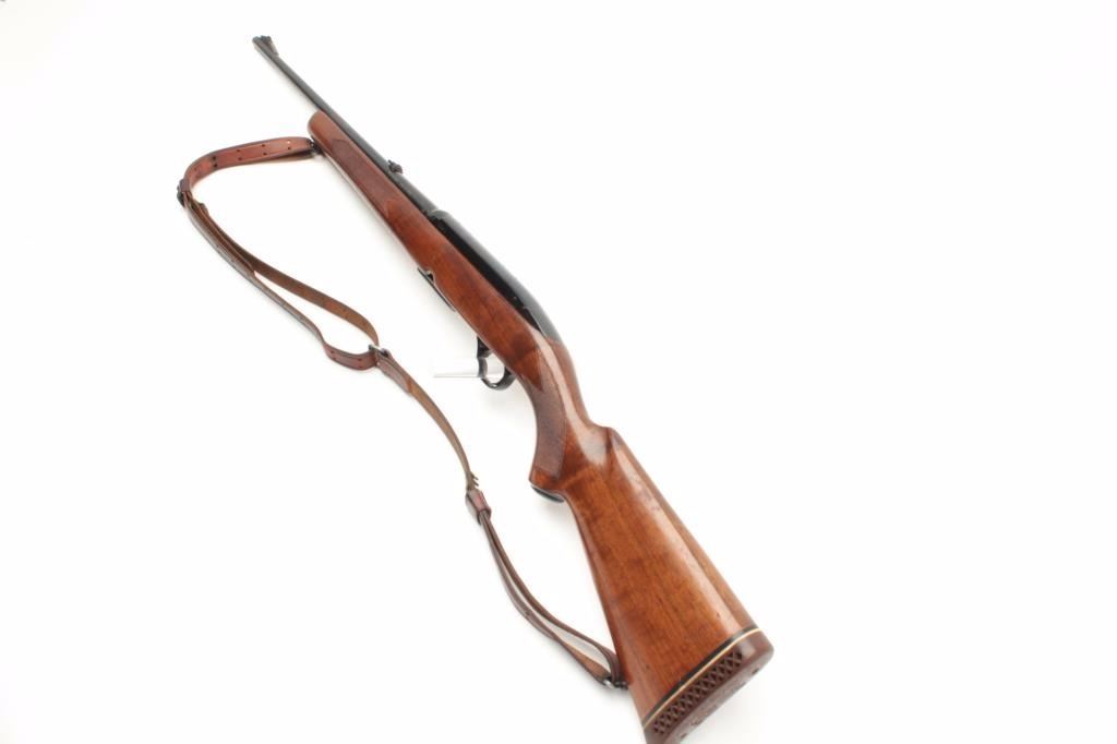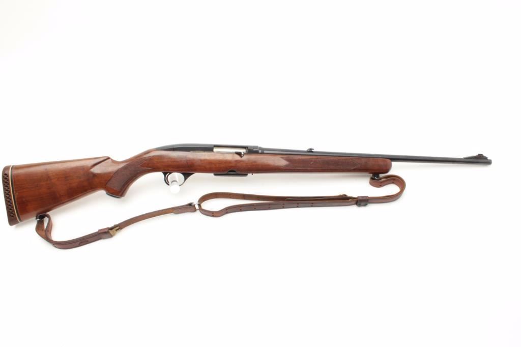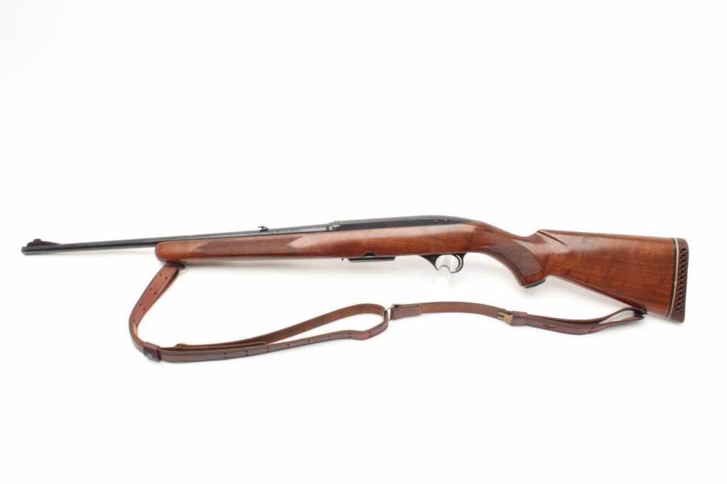 Winchester Model 100 semi-automatic rifle, .284 Win. caliber, 22” barrel, blued finish, checkered wood stock with leather sling, S/N 70391, top of receiver tapped for mounts; in overall very good to near fine conditiondisplaying majority of original finish, very good to fine bore, crisp action and markings, generally good wood with some old mars from storage; added White Line hard rubber butt pad. (C&R). Est.: $300-$600.