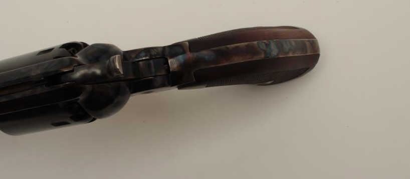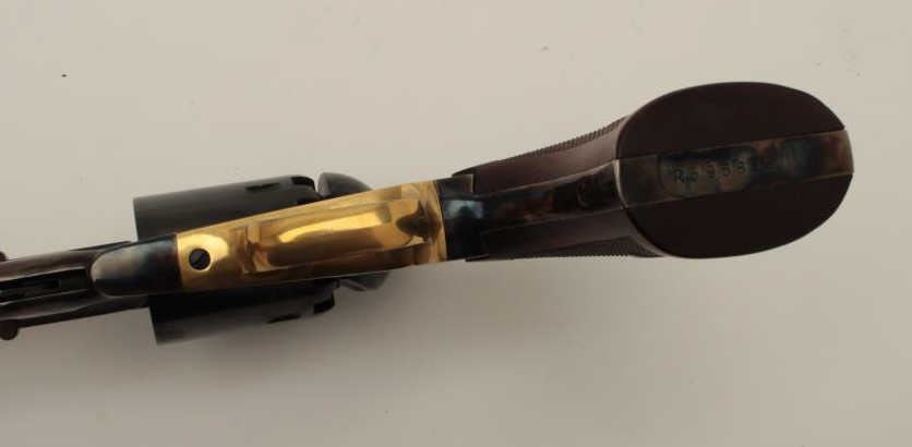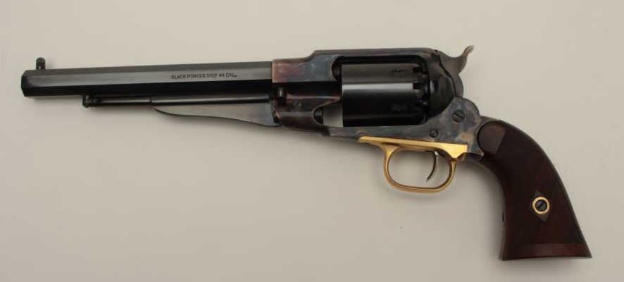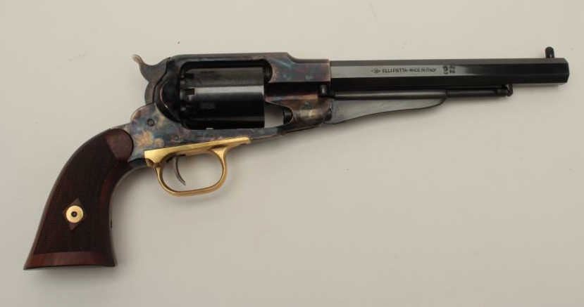 Pietta made reproduction of 1858 Remington .44 caliber percussion revolver, blue and case colored with checkered wood grips showing an 8” barrel. Like new in box. 99% plus with no evidence of firing, S/N 606238and listed by Cabela’s as Confederate Navy CFT 36. Est.: $300-$600
