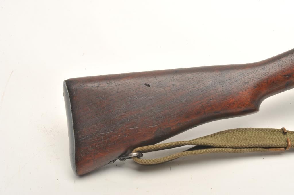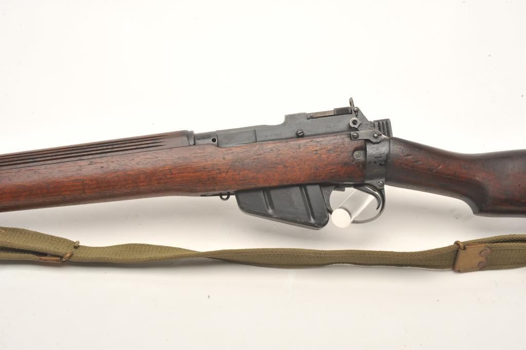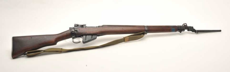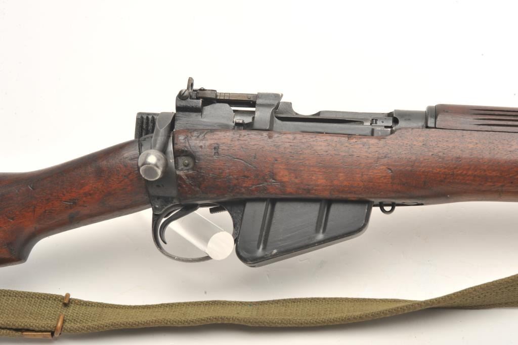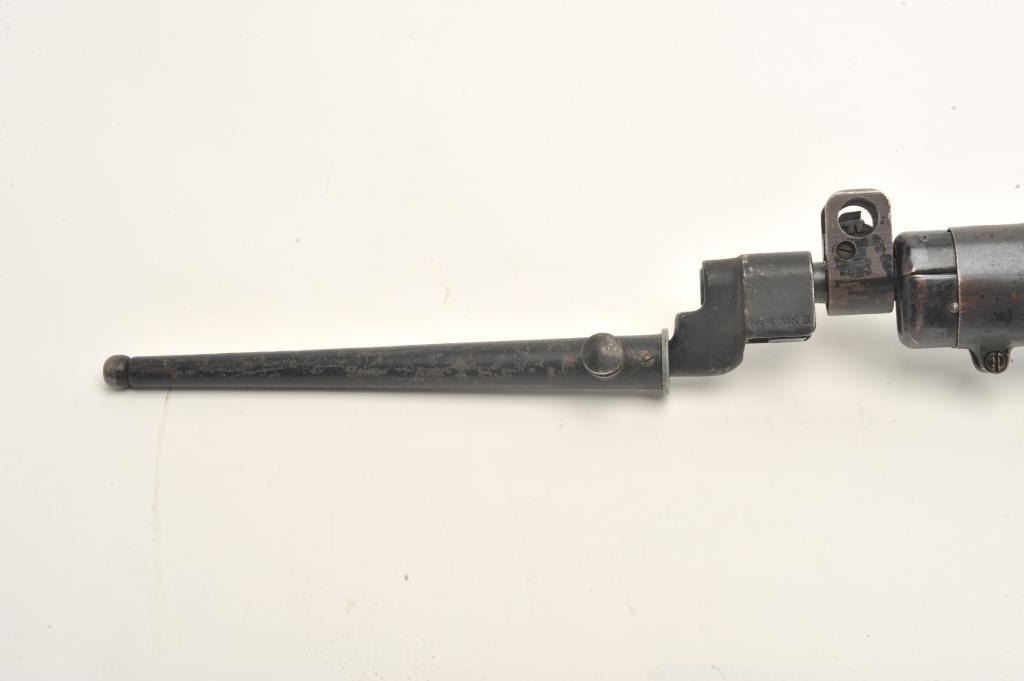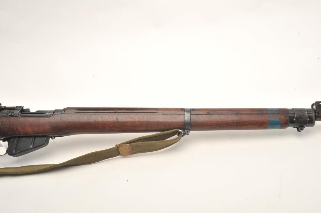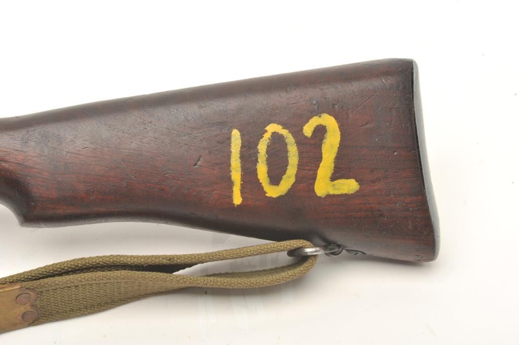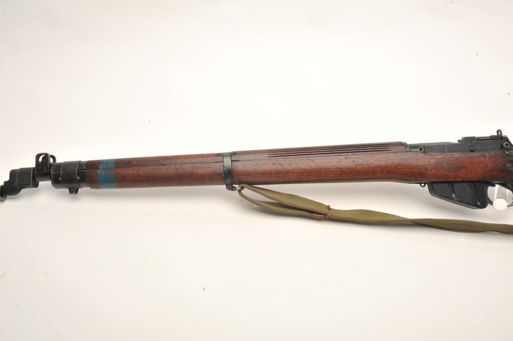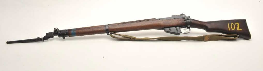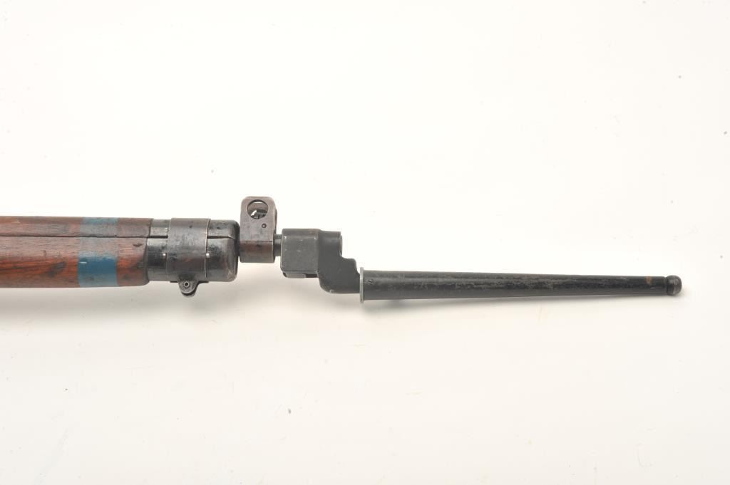 Enfield Model No. 4 MK I bolt action rifle with bayonet, sheath and green woven sling, .303 caliber, 25” barrel, wood stock, S/N AR12538, in overall good to very good condition with crisp action, very good bore,good markings and good to very good wood showing old blue paint stripe on front of stock and “102” painted in yellow on the left side of butt stock. (C&R). Est.: $250-$500.