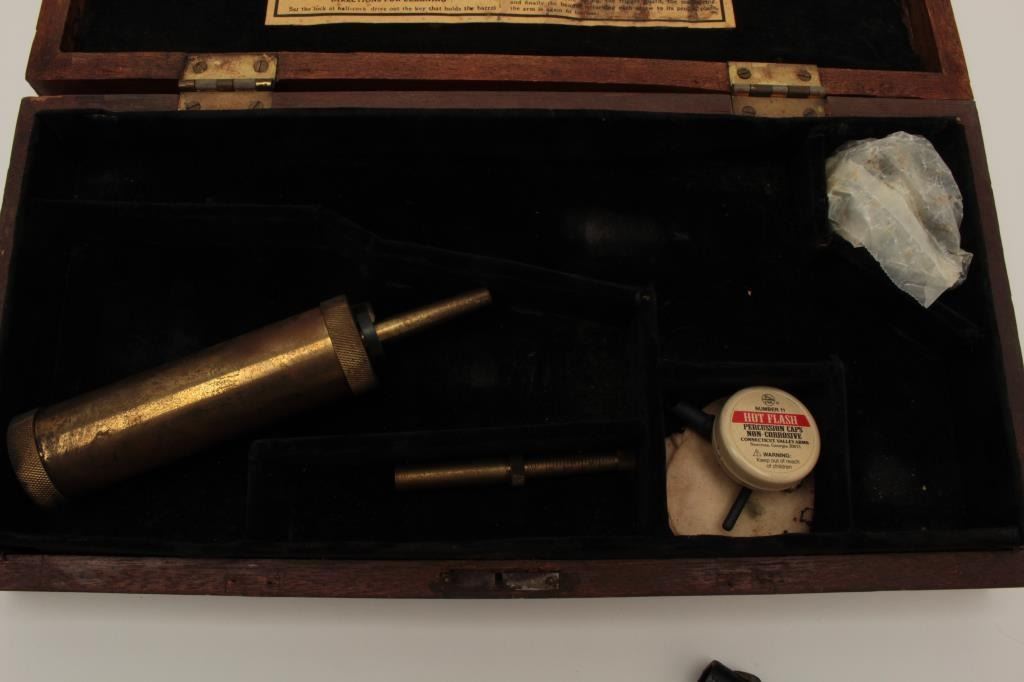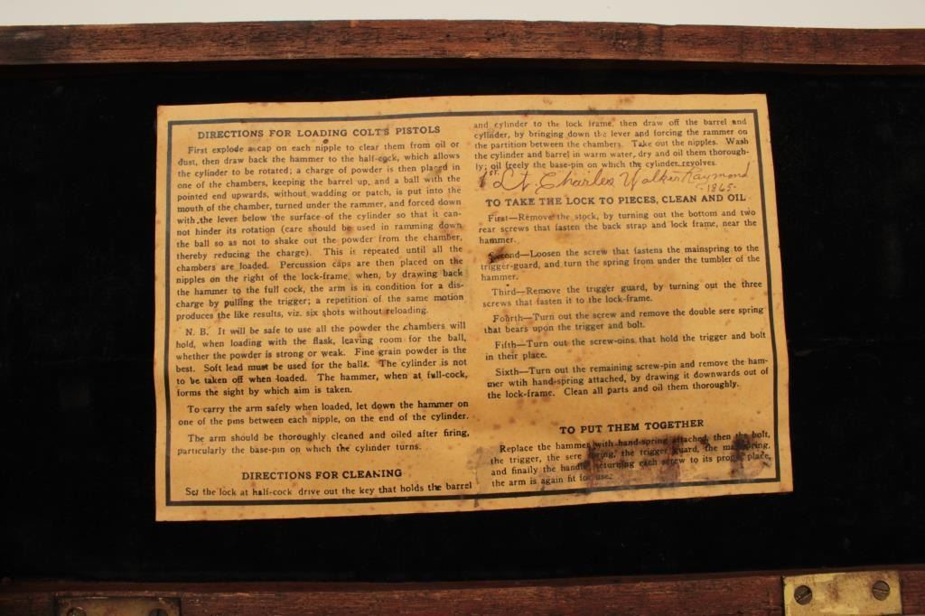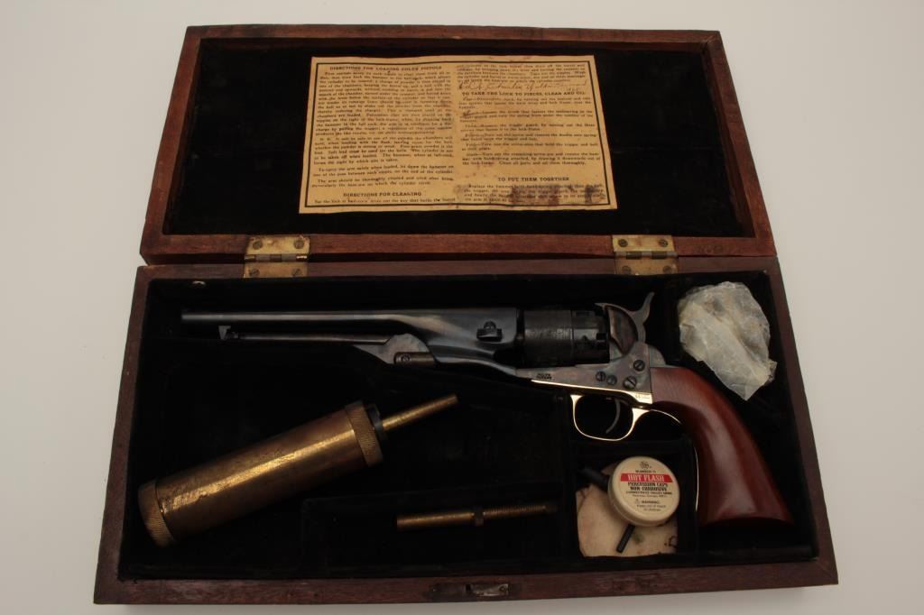 Colt New Blackpowder Series 1860 Army four screw cut for shoulder stock, S/N 218299. This revolver is in excellent condition with 99% plus original finishes and no apparent use. Included is a partition style case lined in dark velvet with modern tools. The case is old with false Colt label in the lid of the type handmade 1950’s-60’s. The case is good with some wear, aging, scrapes and scratches. Est.: $250-$500