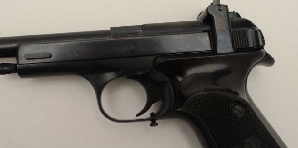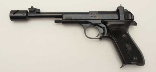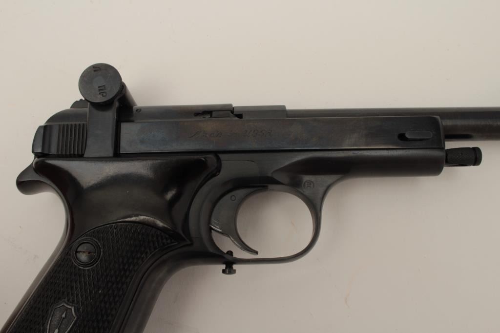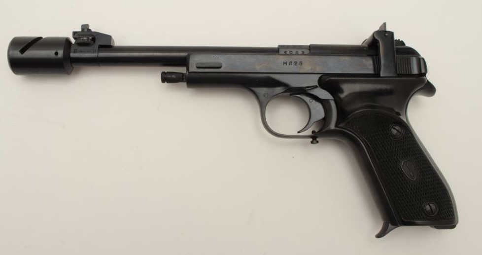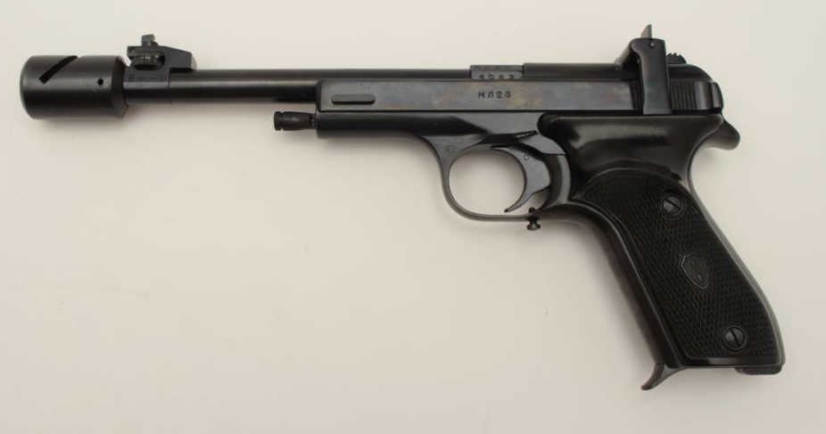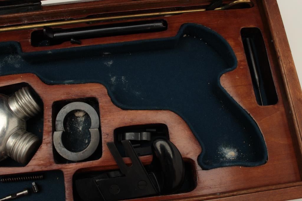U.S.S.R. Margolin semi-automatic target pistol, .22 caliber, 7.5” barrel, blued finish, checkered black grips, S/N MN 26, accompanied by a wood carry case, one extra magazine, cleaning rod, oiler, screwdriverand misc. extra parts. This gun is in overall fine condition with the majority of its original finish remaining, fine bore, crisp action, sharp markings and very good to fine grips. (C&R/PPT). Est.:$700-$1,400.