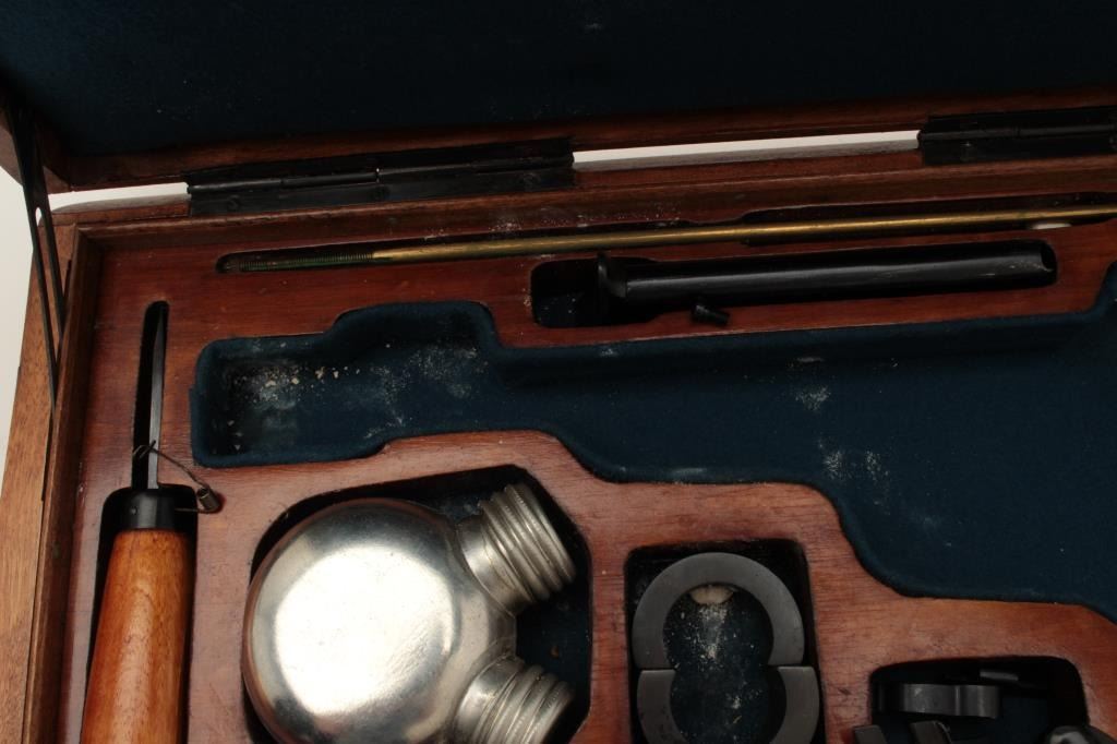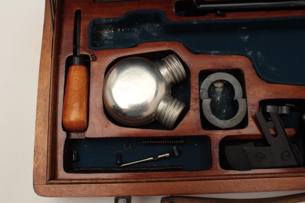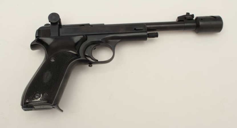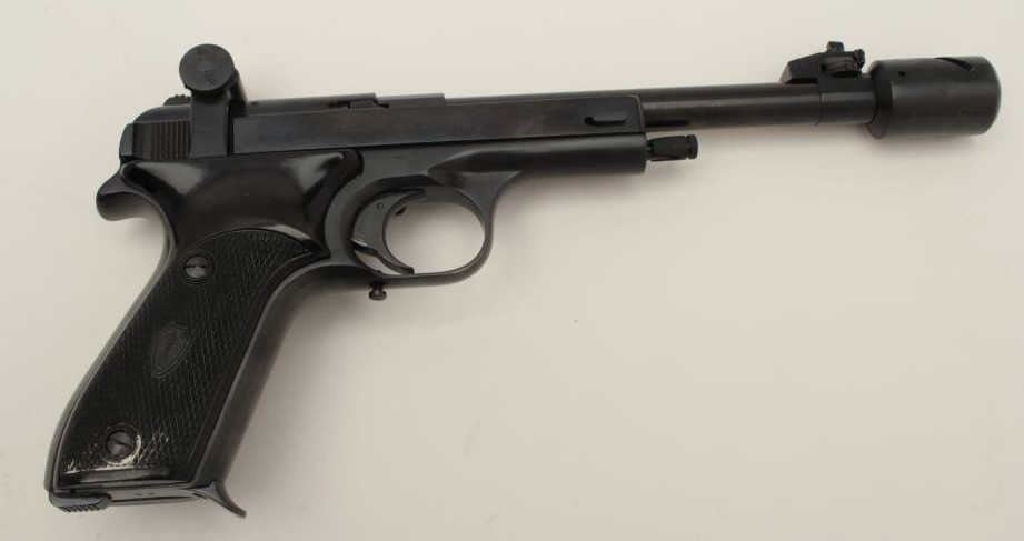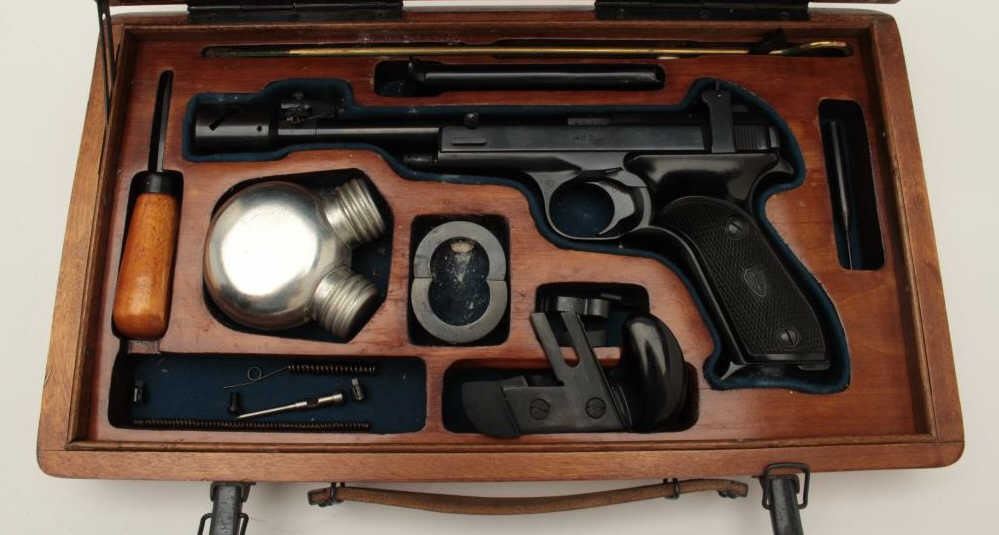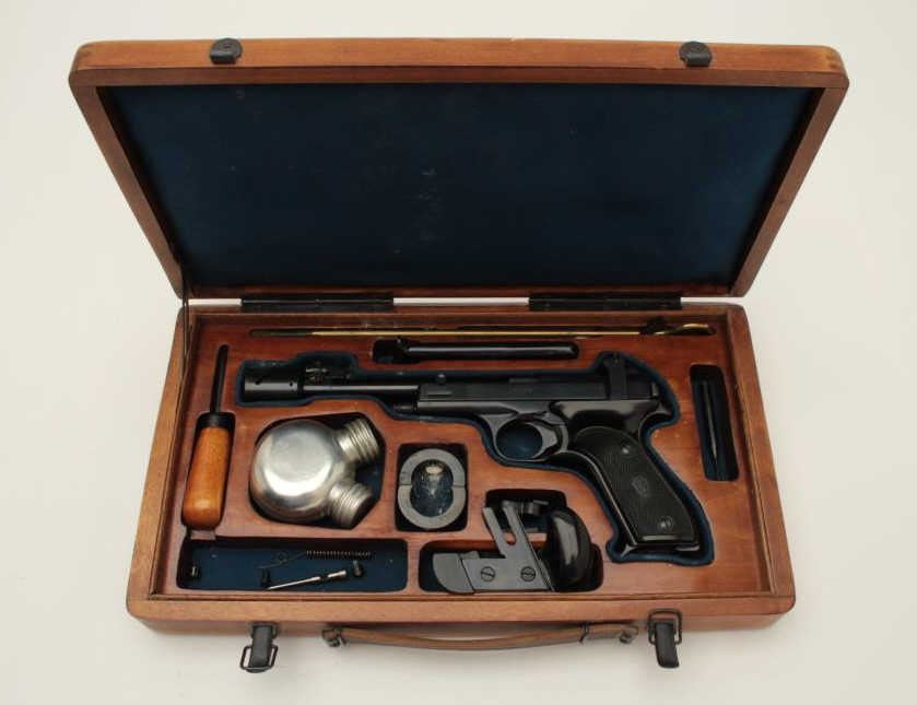 U.S.S.R. Margolin semi-automatic target pistol, .22 caliber, 7.5” barrel, blued finish, checkered black grips, S/N MN 26, accompanied by a wood carry case, one extra magazine, cleaning rod, oiler, screwdriverand misc. extra parts. This gun is in overall fine condition with the majority of its original finish remaining, fine bore, crisp action, sharp markings and very good to fine grips. (C&R/PPT). Est.:$700-$1,400.