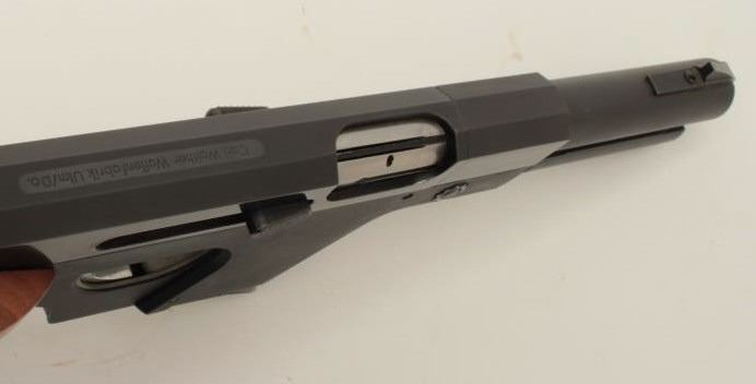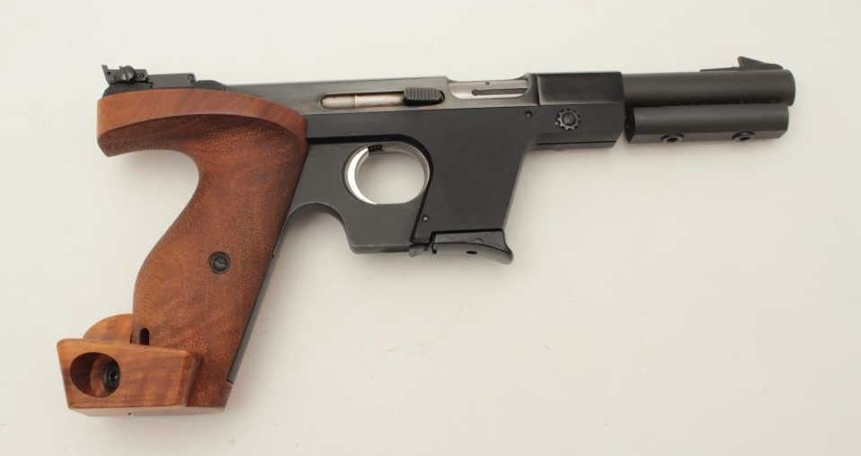 Lot 1202 Walther Model OSP semi-automatic target pistol, .22 short caliber, 6” barrel, blued finish, wood t