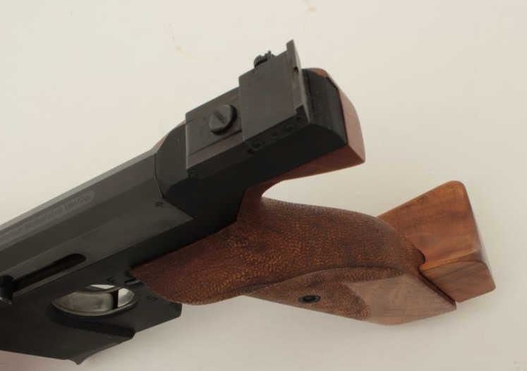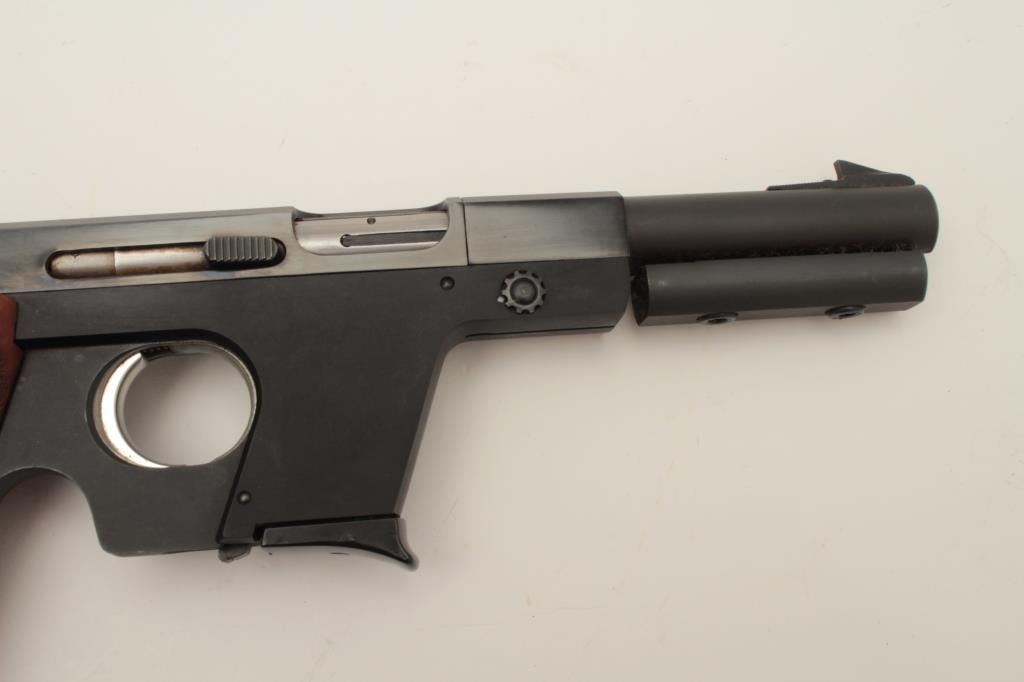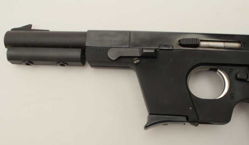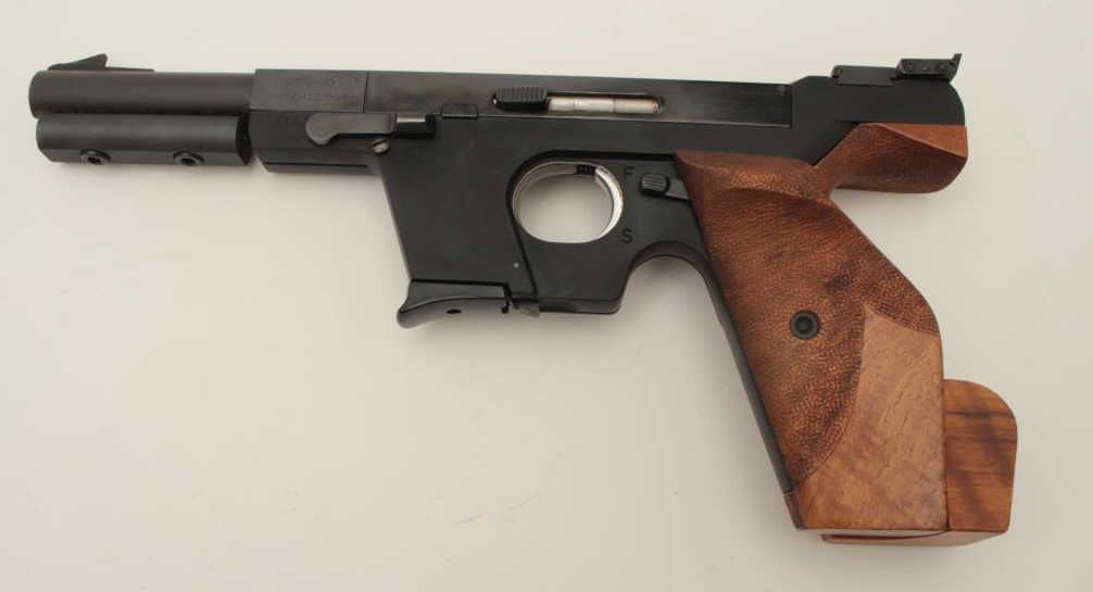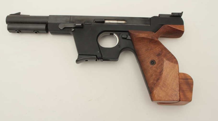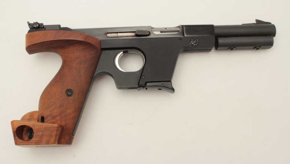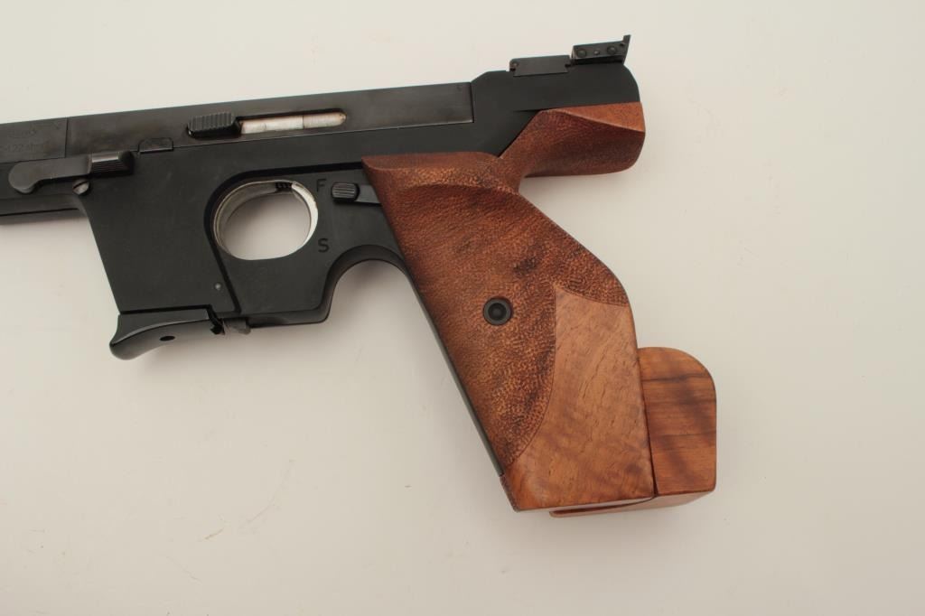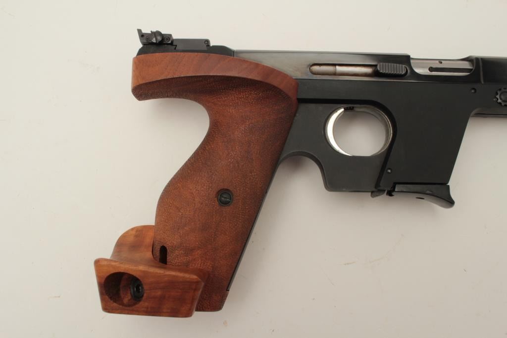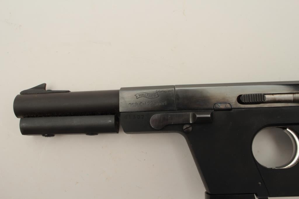 Walther Model OSP semi-automatic target pistol, .22 short caliber, 6” barrel, blued finish, wood target thumb rest grip, S/N 01302, in overall fine condition showing the majority of its original finish, fine bore,crisp action, sharp markings and fine target grips. (Modern/PPT). Est.: $750-$1,500.