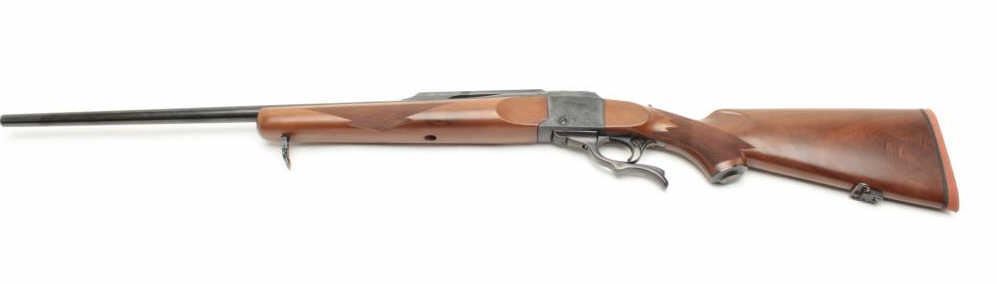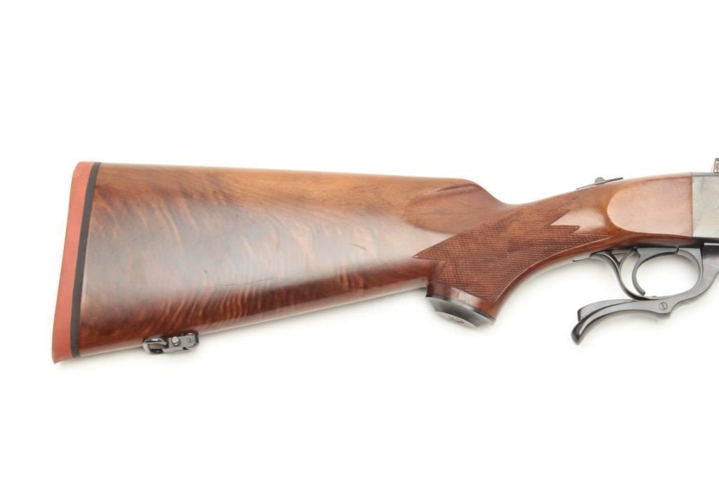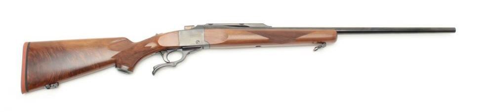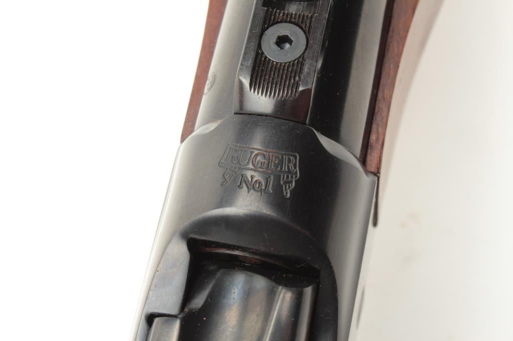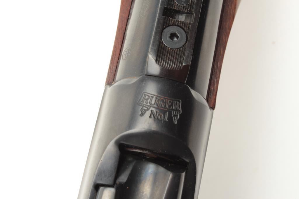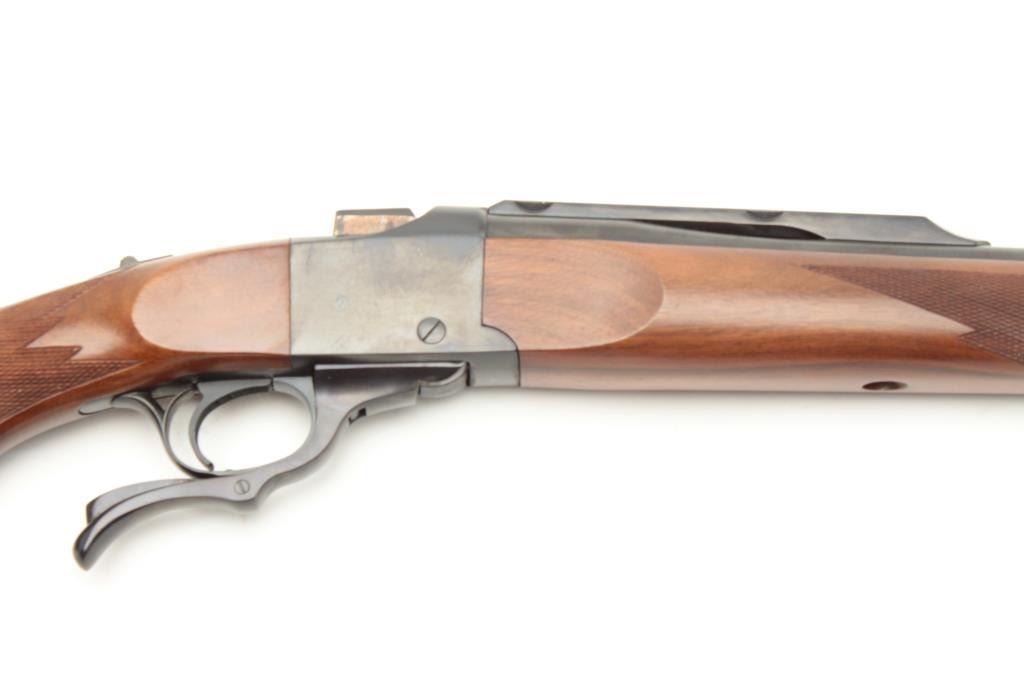 Ruger No. 1 rifle, 22-250 caliber, blued finish, wood stock, S/N 130-29535, in overall fine condition displaying the majority of its original finish to metal surfaces, very good to fine bore, crisp action and markings, fine wood with flame graining to butt stock. (Modern/PPT). Est.: $350-$700.
