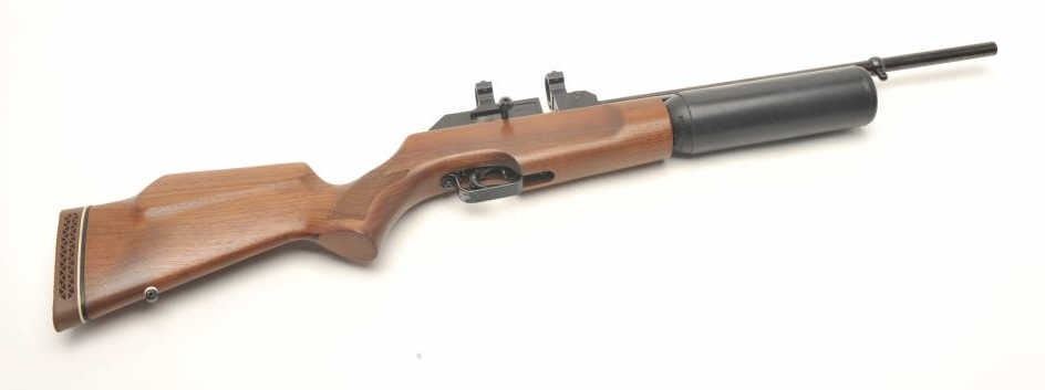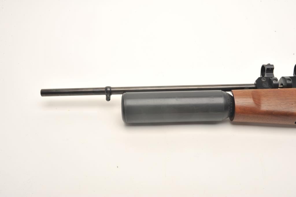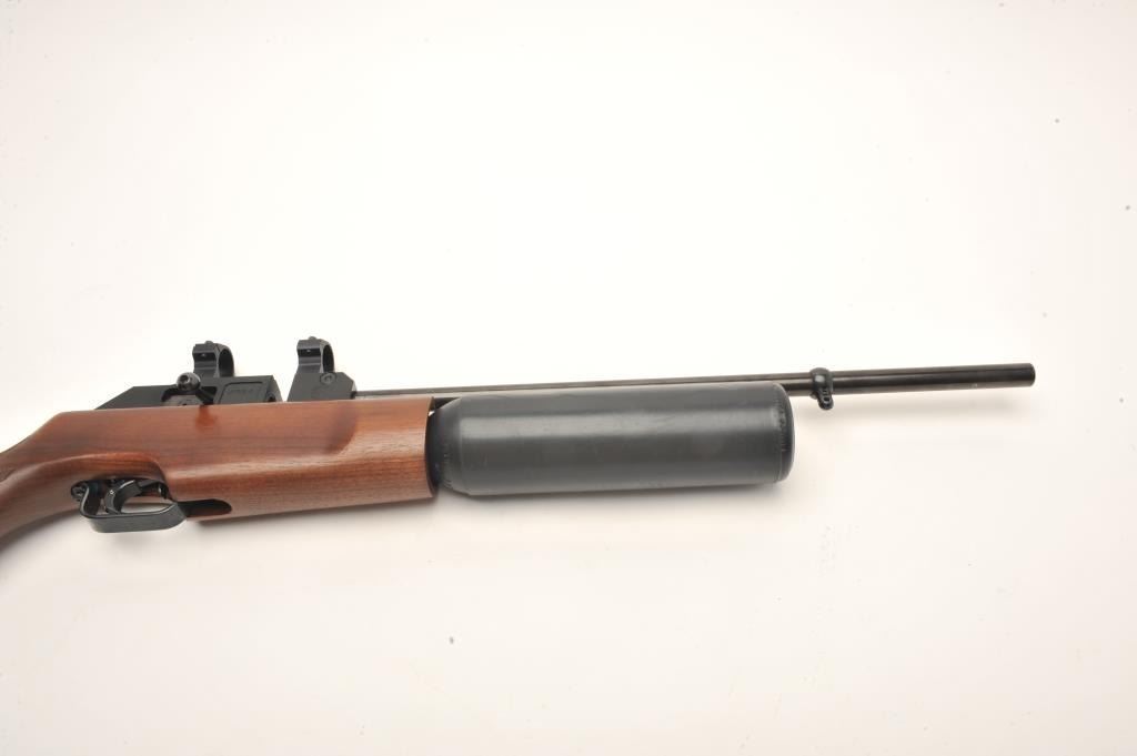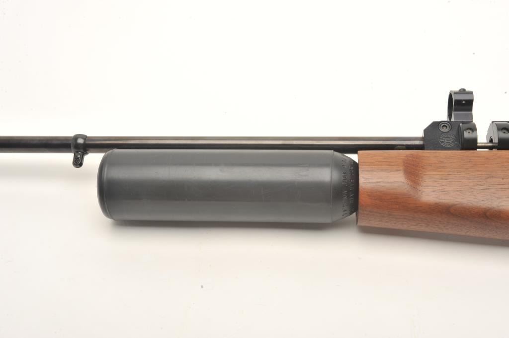 Beeman Model Super 7 pellet gun, .22 caliber, 19” barrel, black finish, checkered wood target half stock with forward cylindrical air reservoir, S/N 002005, in overall fine appearing condition with majority of original finish, action working at time of description, fine stock, mounted with scope rings (no scope). Est.: $100-$200.