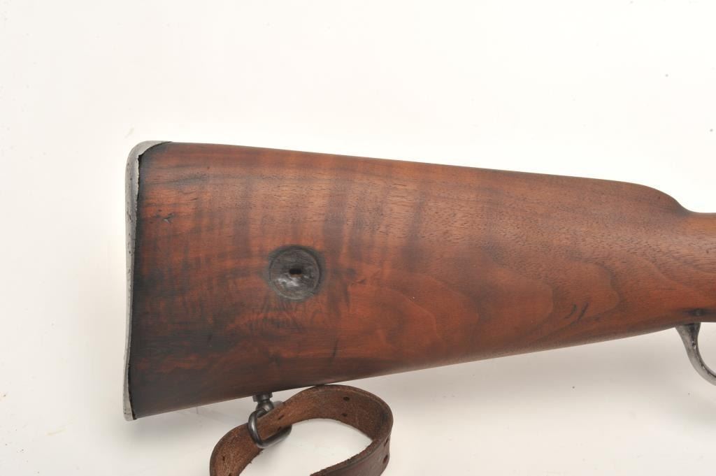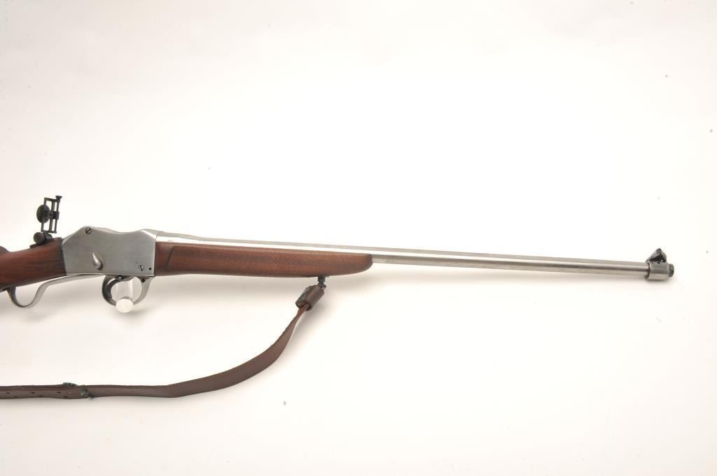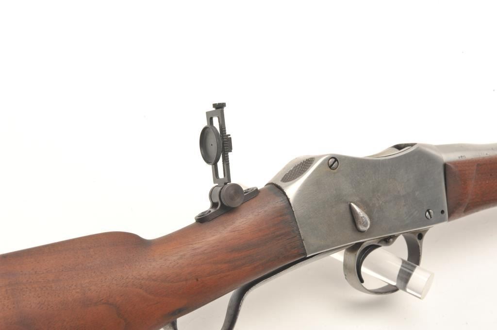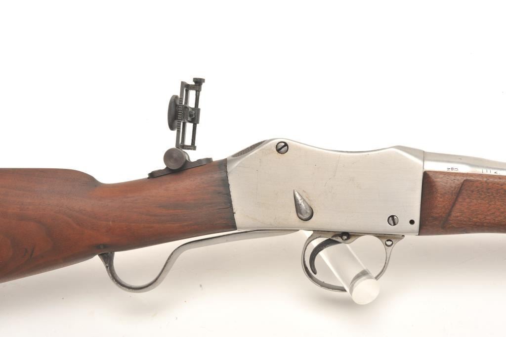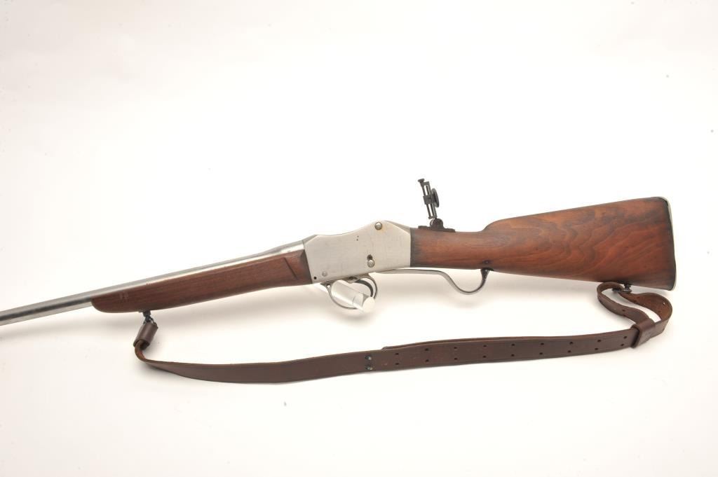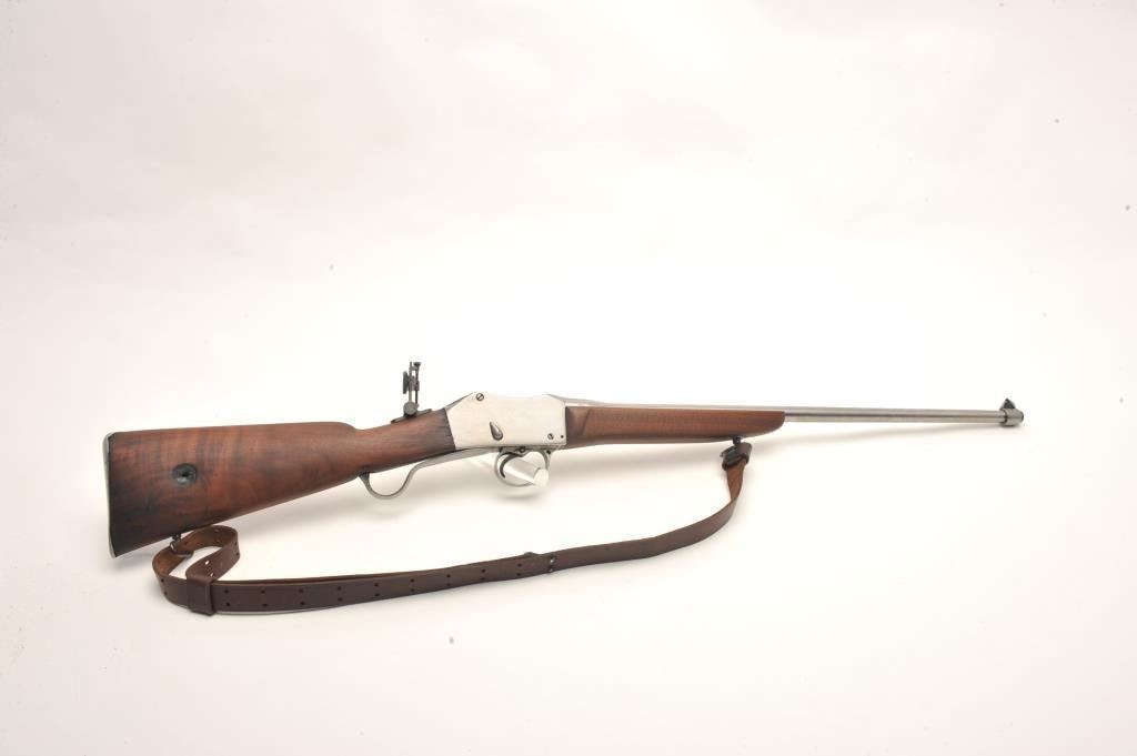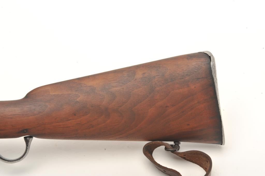 Sporterized Martini Henry rifle, .30 caliber, 23.5” barrel, wood stocks with forend modified, in overall fair to good condition as customized, with cleaned metal surfaces, good bore and action, fair to good wood,leather sling and added modern adjustable tang sight. (Antique). Est.: $150-$300.