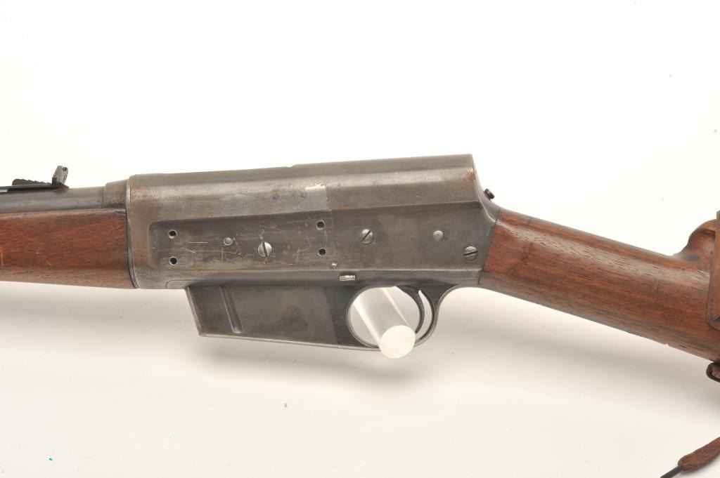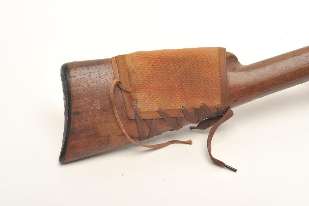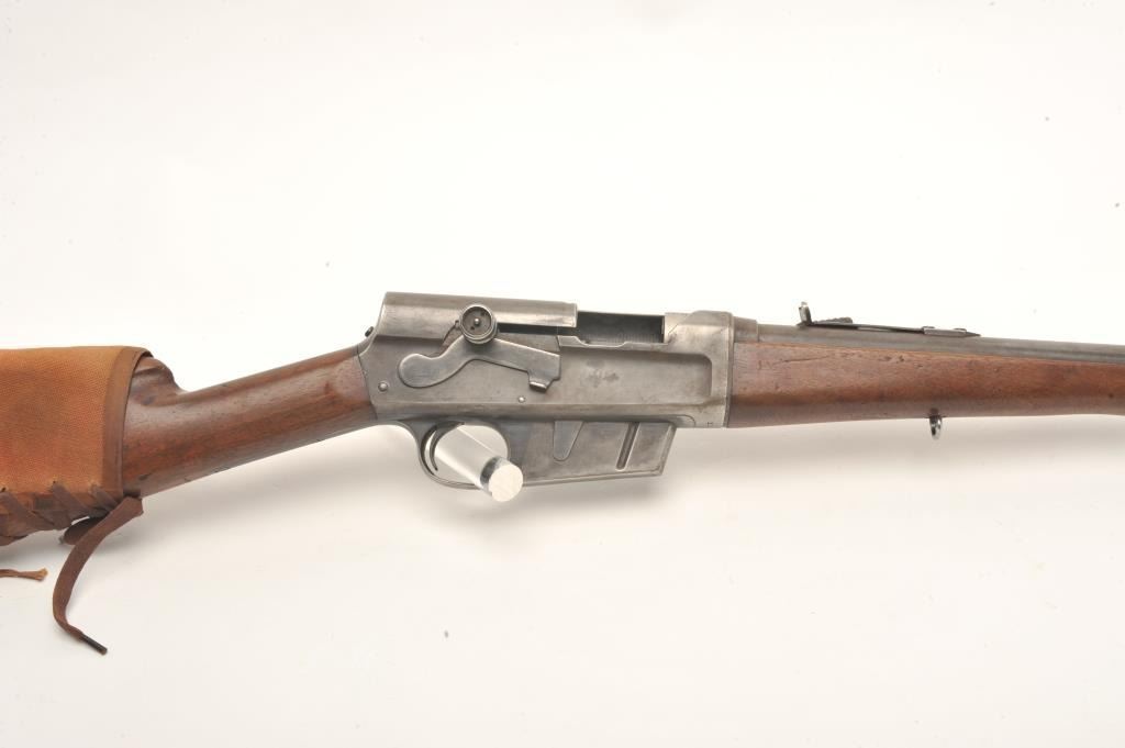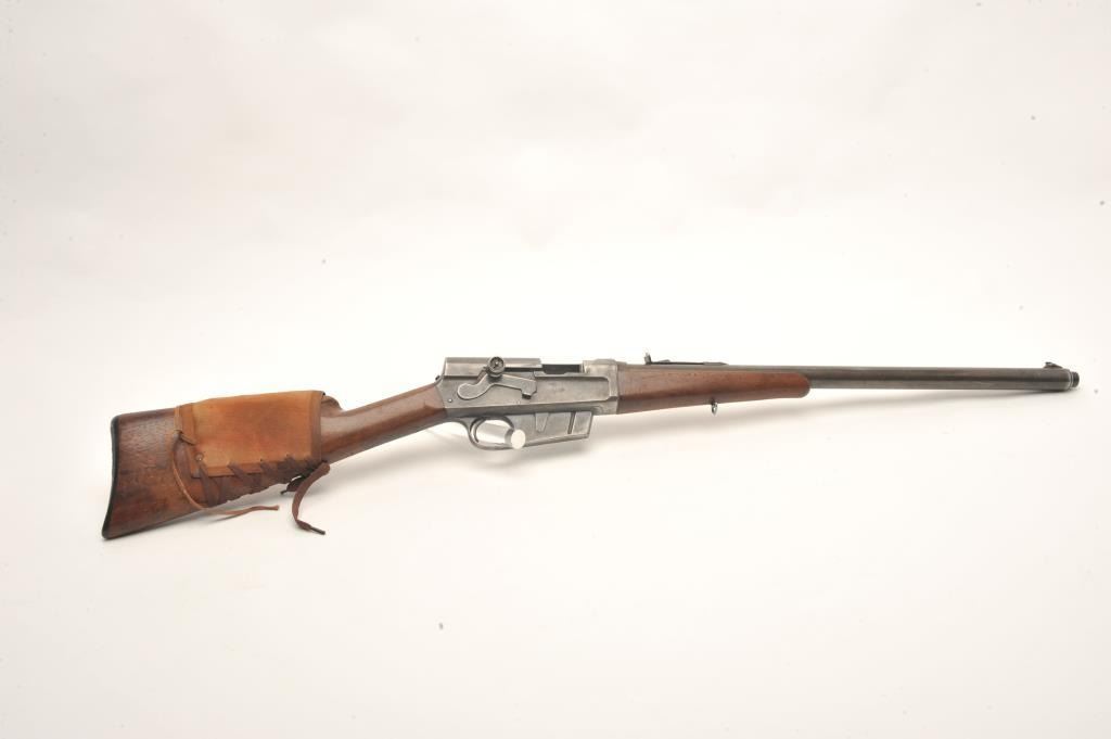 Remington Model 8 semi-auto rifle, .25/35 Remington caliber, serial #15039. The rifle is in fair overall condition with a 22” barrel. The barrel and magazine retain small amounts of their muted blued finish in theprotected areas with the balance going to grey patina. The left side of the receiver has four holes drilled for an old side mount. The smooth wood stock is in fair condition showing heavy use with mars and dents. Thebutt has a canvas lace-up cheek piece and ends with a Remington marked hard rubber butt plate. The bore is good, the action functions and the markings are legible. (C+R) Est.: $200-$400.