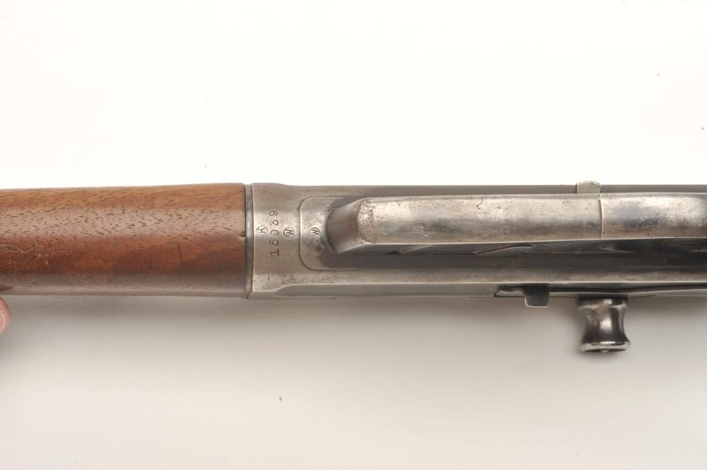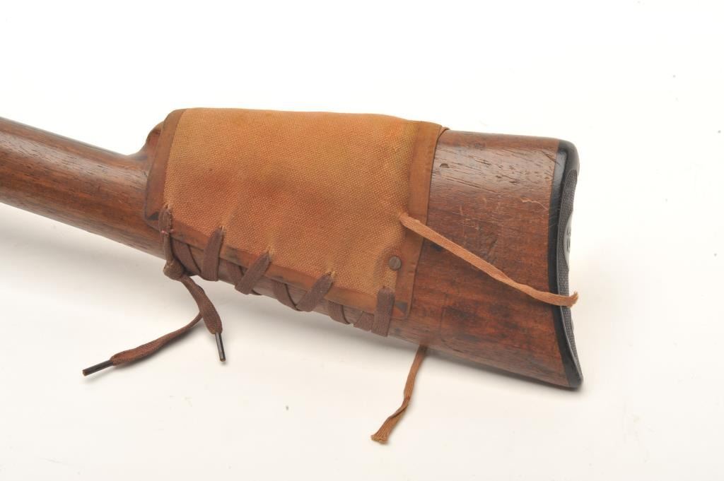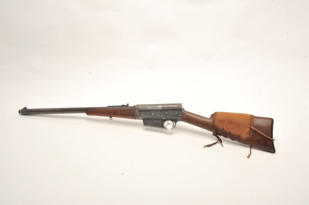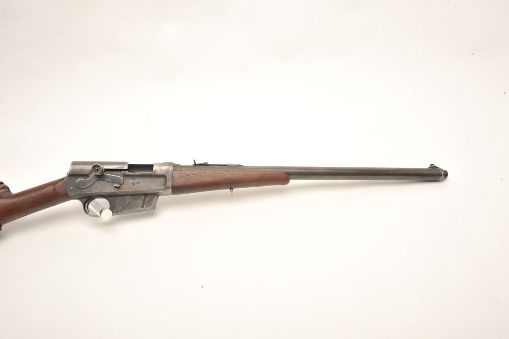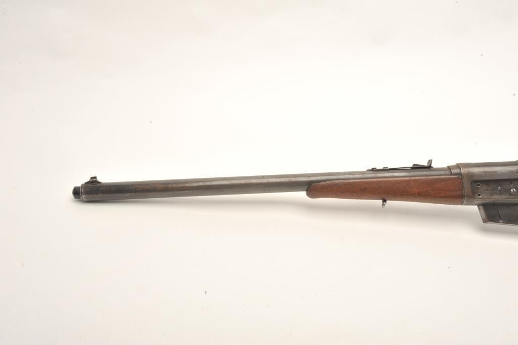 Remington Model 8 semi-auto rifle, .25/35 Remington caliber, serial #15039. The rifle is in fair overall condition with a 22” barrel. The barrel and magazine retain small amounts of their muted blued finish in theprotected areas with the balance going to grey patina. The left side of the receiver has four holes drilled for an old side mount. The smooth wood stock is in fair condition showing heavy use with mars and dents. Thebutt has a canvas lace-up cheek piece and ends with a Remington marked hard rubber butt plate. The bore is good, the action functions and the markings are legible. (C+R) Est.: $200-$400.