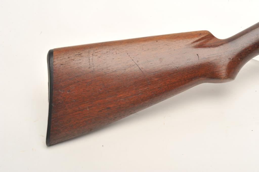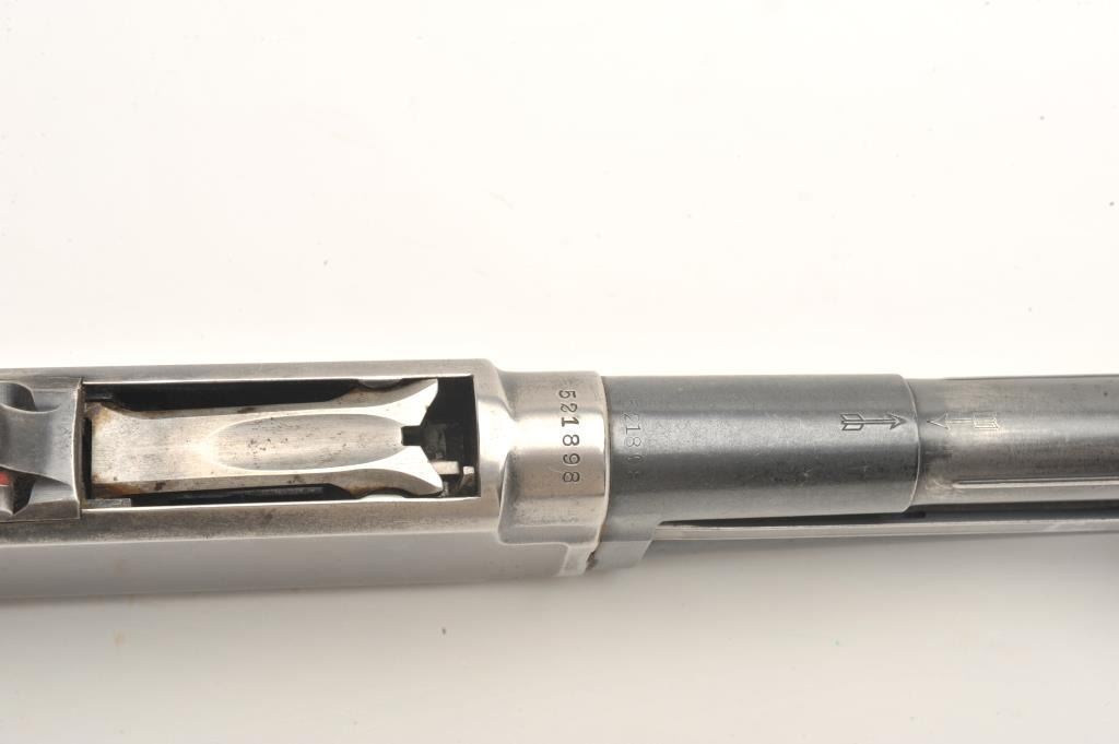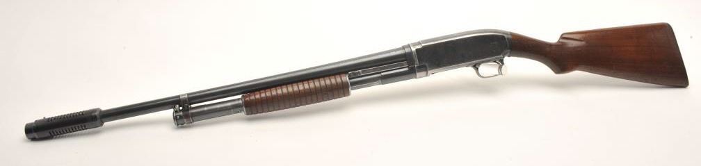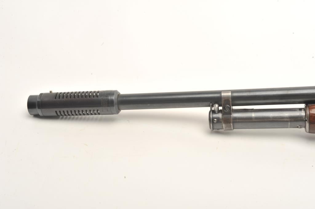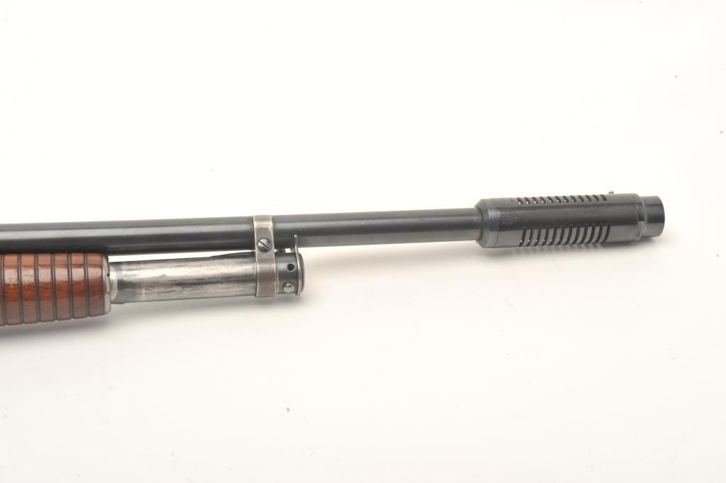 Winchester Model 12 pump shotgun, 12 gauge, serial #521898. The shotgun is in good overall condition with a 26” barrel with an added Cutts compensator. The barrel and receiver retain the majority of their flaking blued finish with small mars and scratches. The smooth wood stocks are in good condition showing honest wear from field use with small mars and scrapes. The butt ends with a Winchester marked hard rubber butt plateproviding a 14” LOP. The bore is good, the action crisp and markings are sharp. (Modern) Est.: $200-$400.