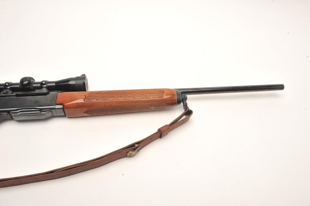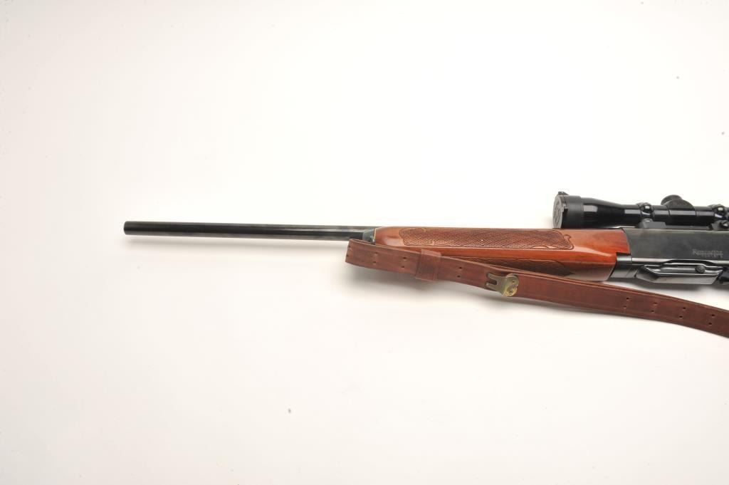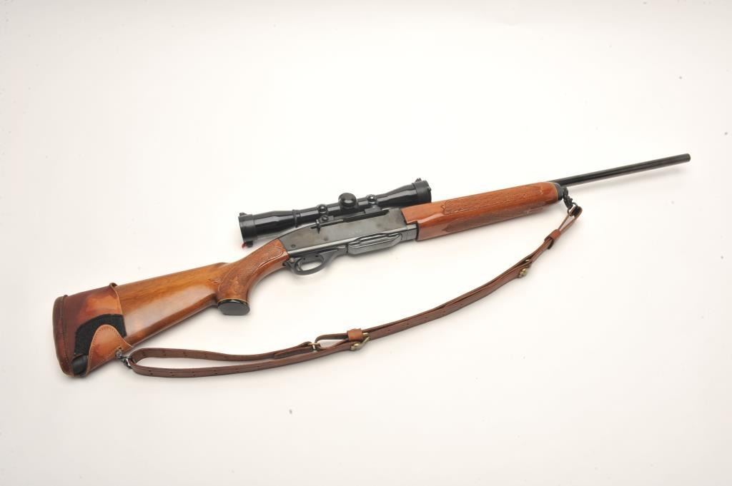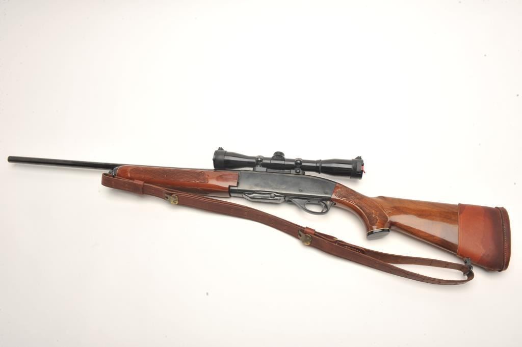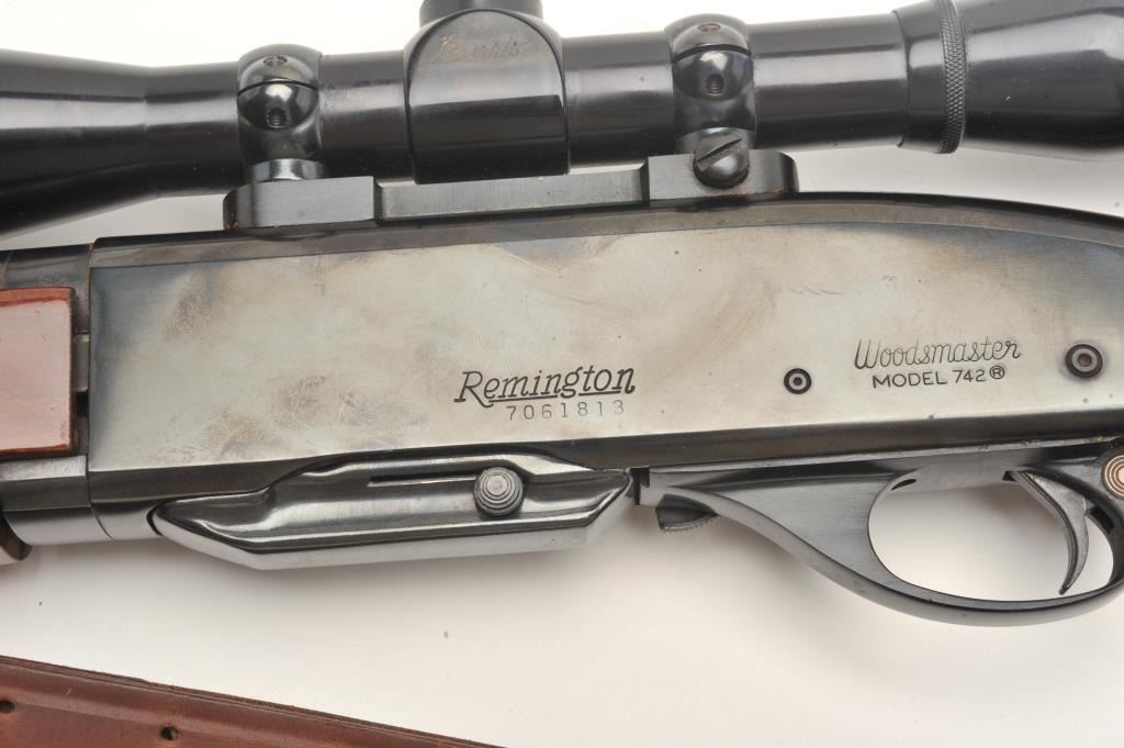 Remington Woodsmaster Model 742 .30-06 caliber semi-auto rifle, S/N 7061813 and mounted with Burris scope and mounts along with slip on leather pad. Quick detachable sling swivels and sling included and thefront sight ramp has been removed. Remains in near fine condition showing minor firing and use. (Modern) Est.: $250-$500