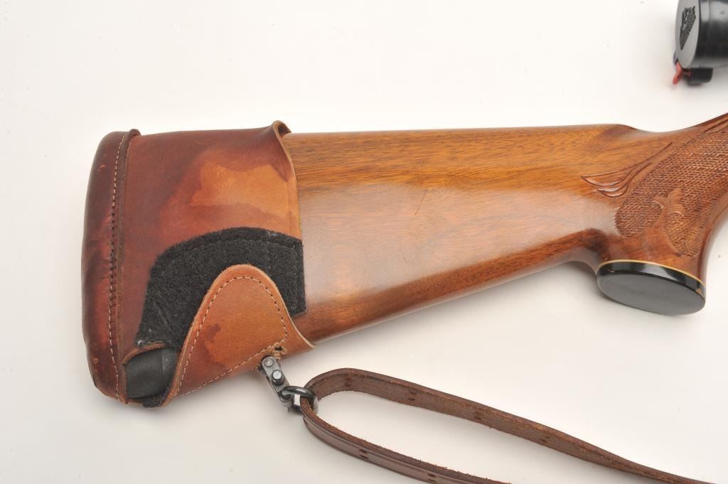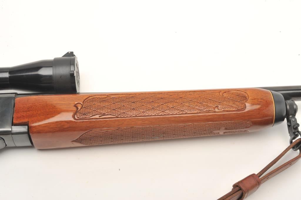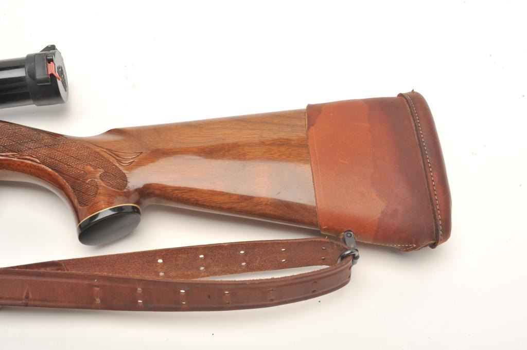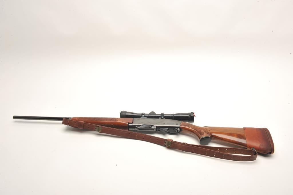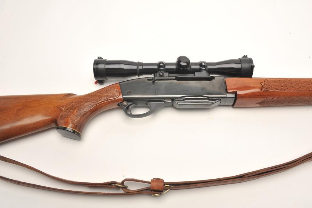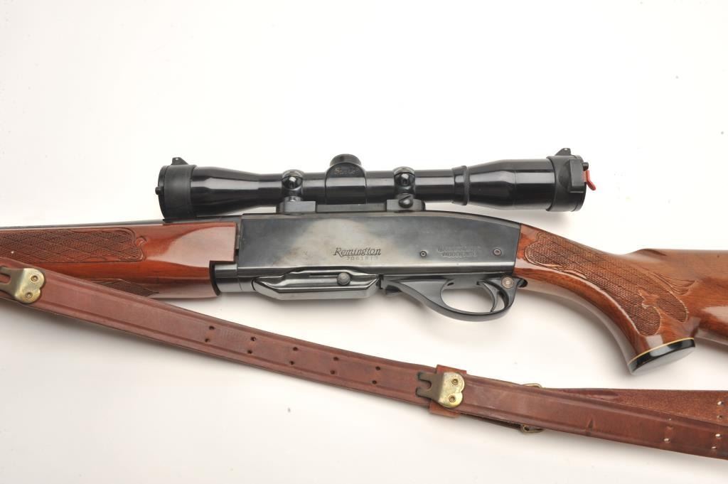 Remington Woodsmaster Model 742 .30-06 caliber semi-auto rifle, S/N 7061813 and mounted with Burris scope and mounts along with slip on leather pad. Quick detachable sling swivels and sling included and thefront sight ramp has been removed. Remains in near fine condition showing minor firing and use. (Modern) Est.: $250-$500