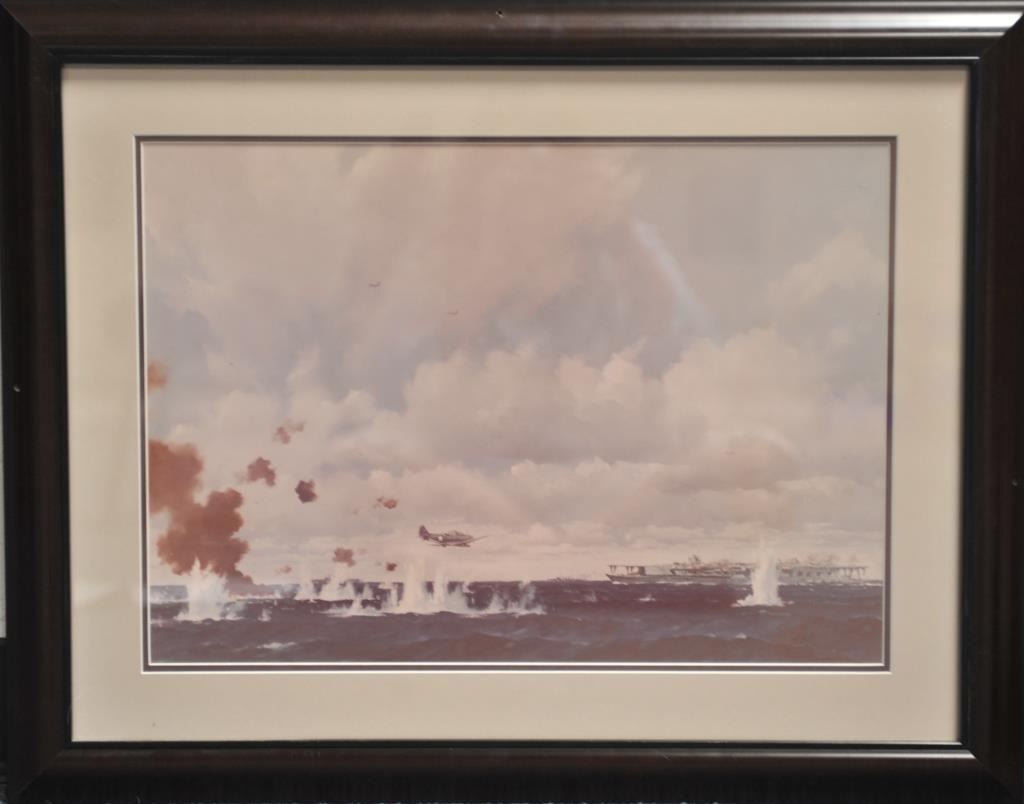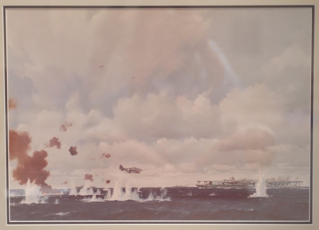 Lot 1236 Large framed and matted color print of a U.S. TBM plane in action flying toward a carrier; approxi