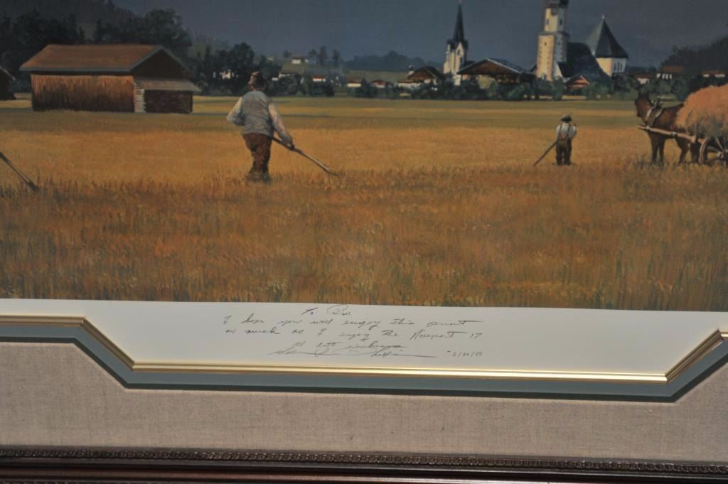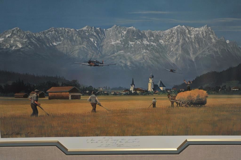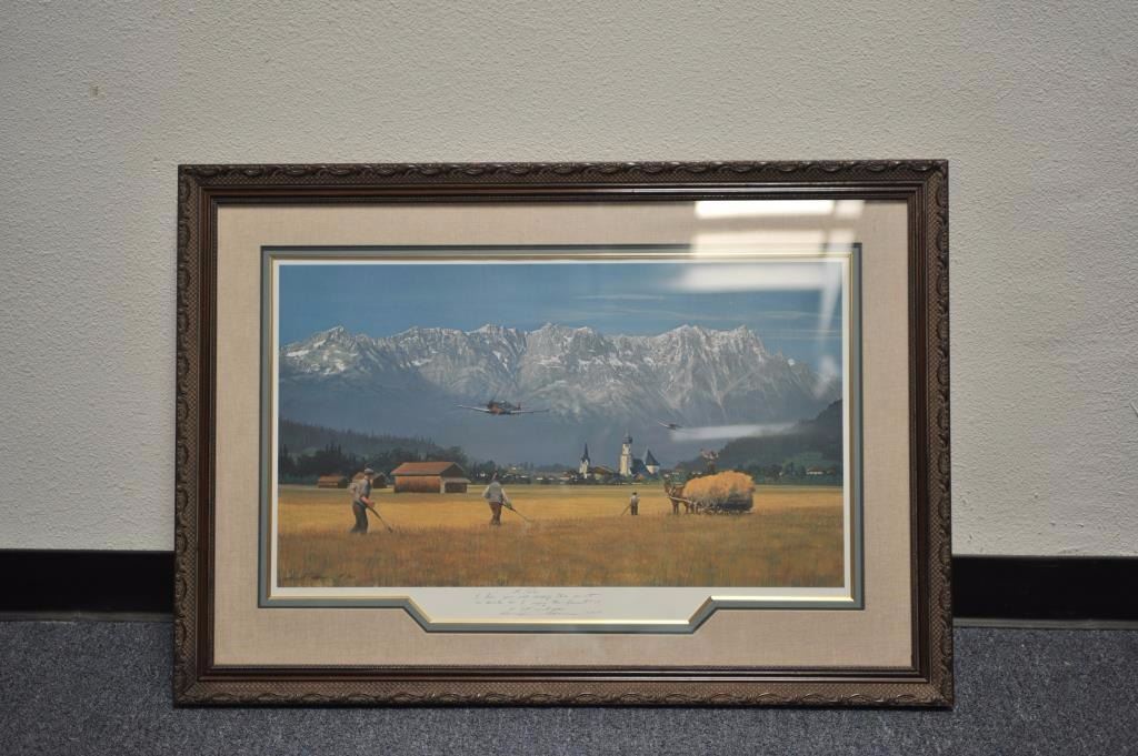 Framed and matted print of World War II P-51 Mustang fighters flying low over the European countryside. The print shows farmers working the fields as the fighters pass by. From the Bill Bettis Nieuport 17 Restaurantcollection, the 26” x 37” print is signed by the artist William S. Phillips and inscribed to Mr. Bettis dated 5/30/95. There is some damage to one corner of the frame. Est.: $100-$200.