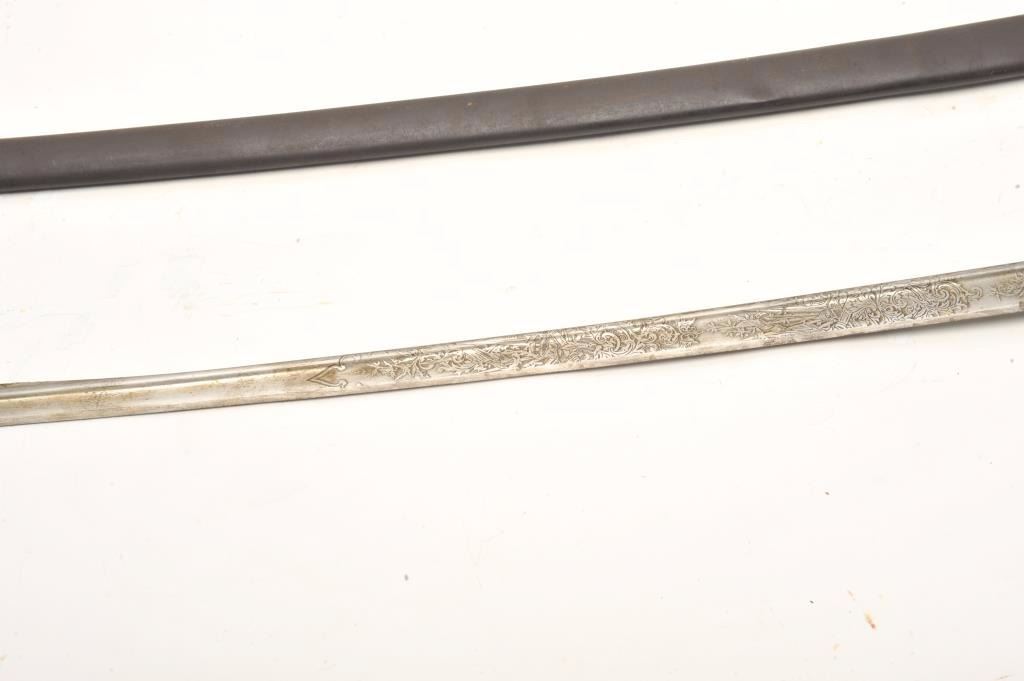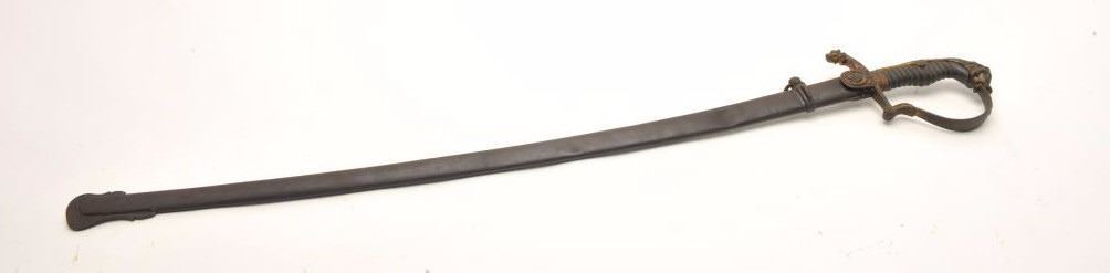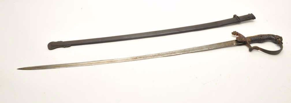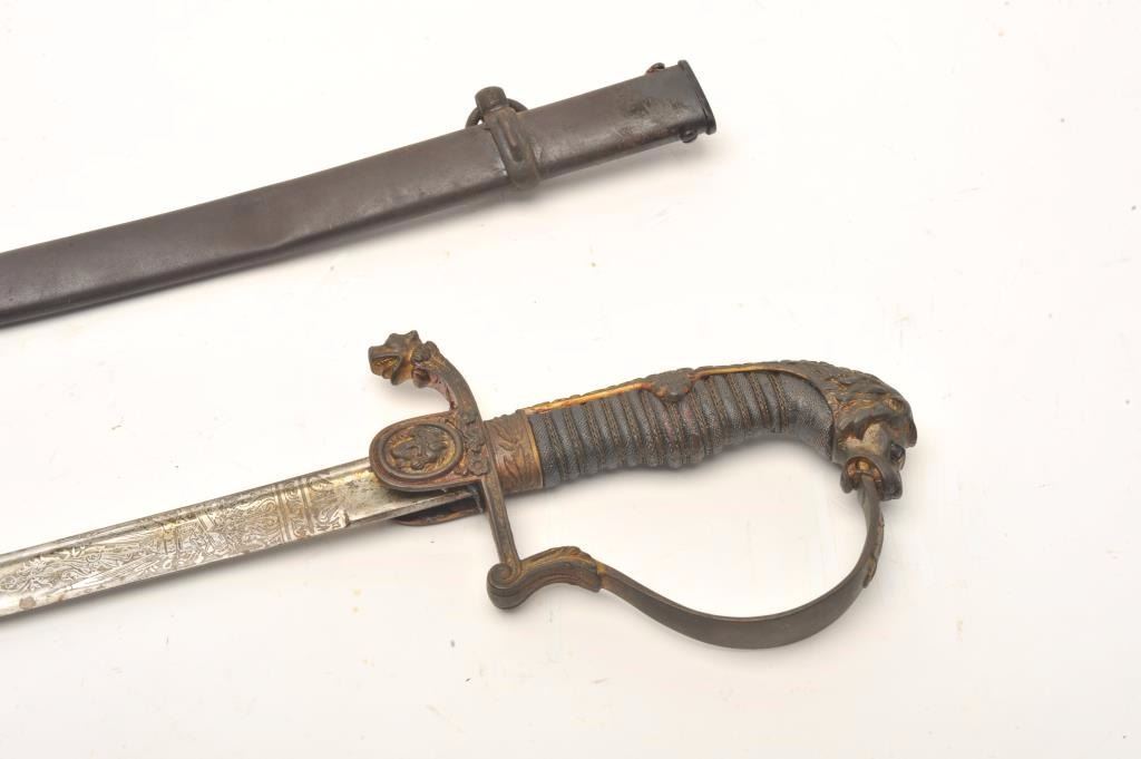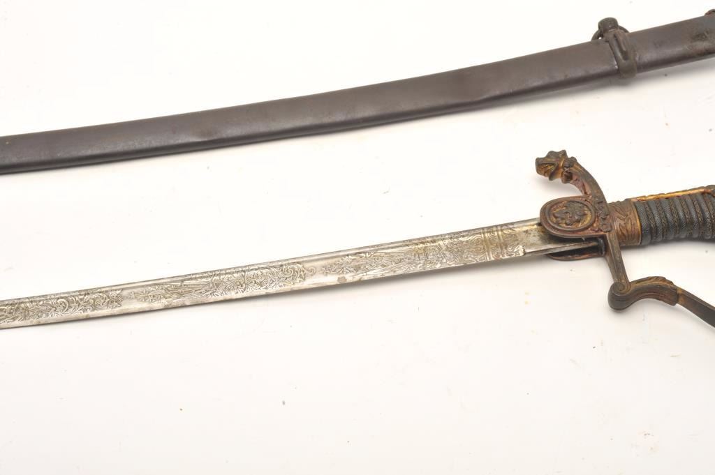 Imperial Austrian Officers sword with scabbard. The sword is in good overall condition with a 30 ½” blade and an overall length of 36”. The blade is marked, “EISENHAUER” and features significant reliefengraving. The blade has been sharpened and shows scabbard wear. The cast handguard features a wire wrapped ray skin grip with a lion’s head pommel. The steel scabbard has taken a dark patina with several small dentsand a total length of 31 ½”. Est.: $250-$500.