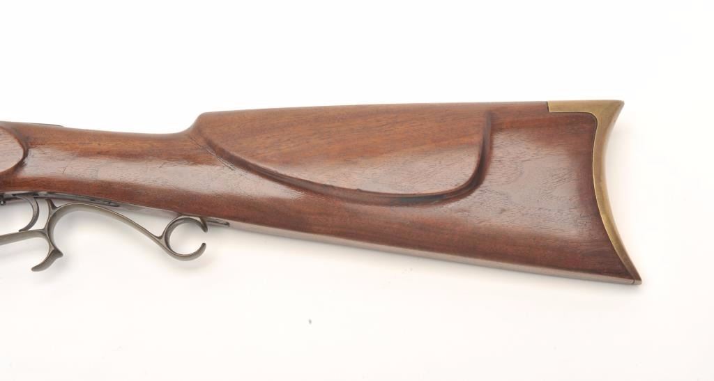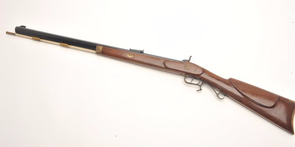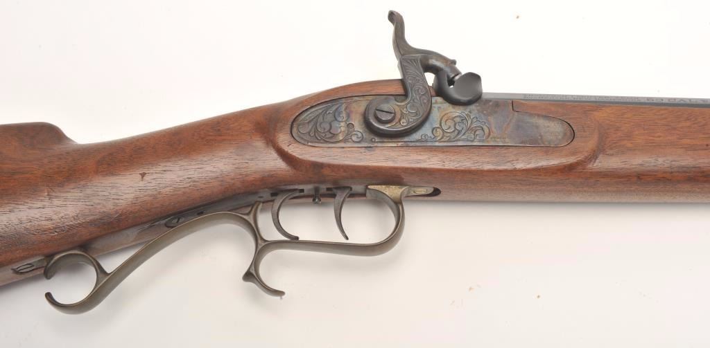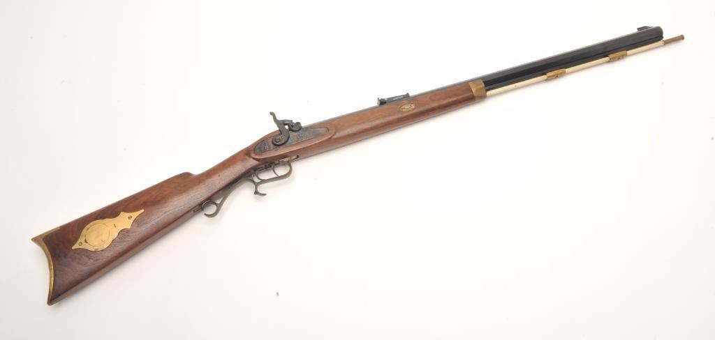 Thompson Center Arms reproduction Hawken black powder percussion rifle, .45 caliber, serial #527492. The rifle is in very good overall condition with a 28” octagon barrel with a blade front and adjustable rearsights. The barrel retains nearly all of its blued finish with only minor handling marks noted. The action is beautifully case colored with tasteful engraving and a brass tipped wooden ramrod. The smooth wood stockis in very good condition with a smooth, brass crescent butt plate. The rifle features all brass hardware, patch box and double set triggers. Est.: $200-$400.