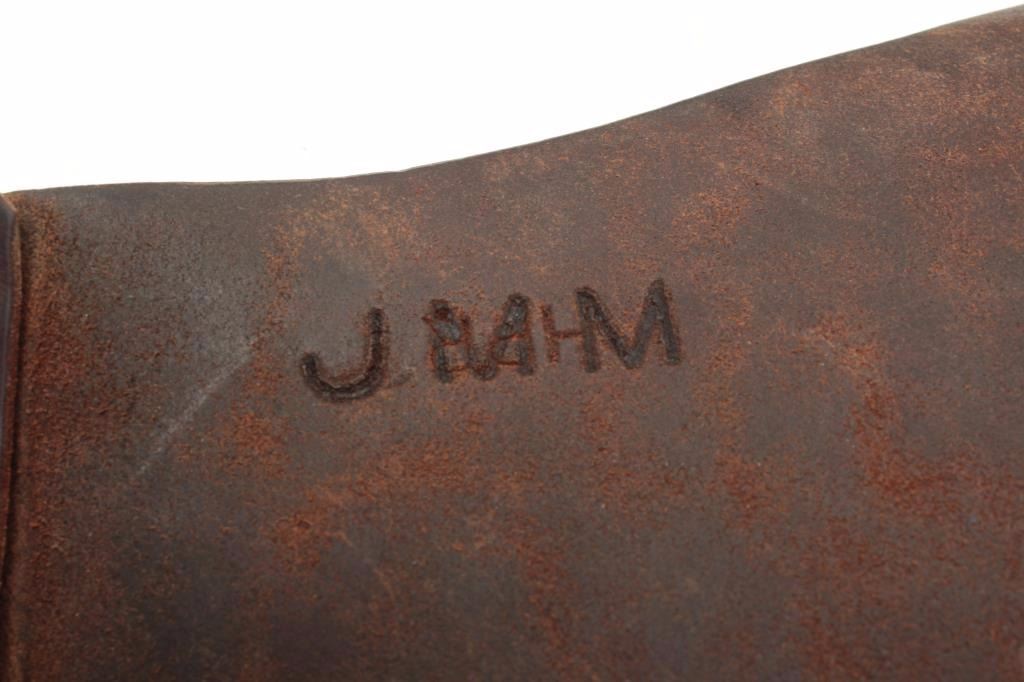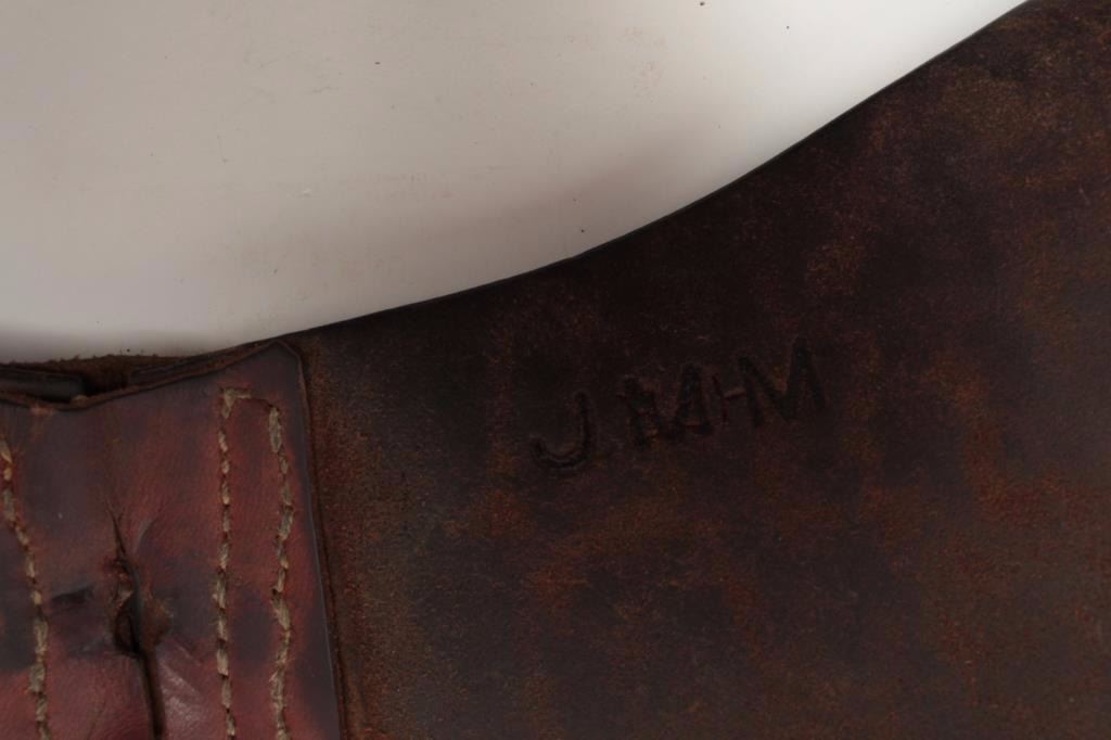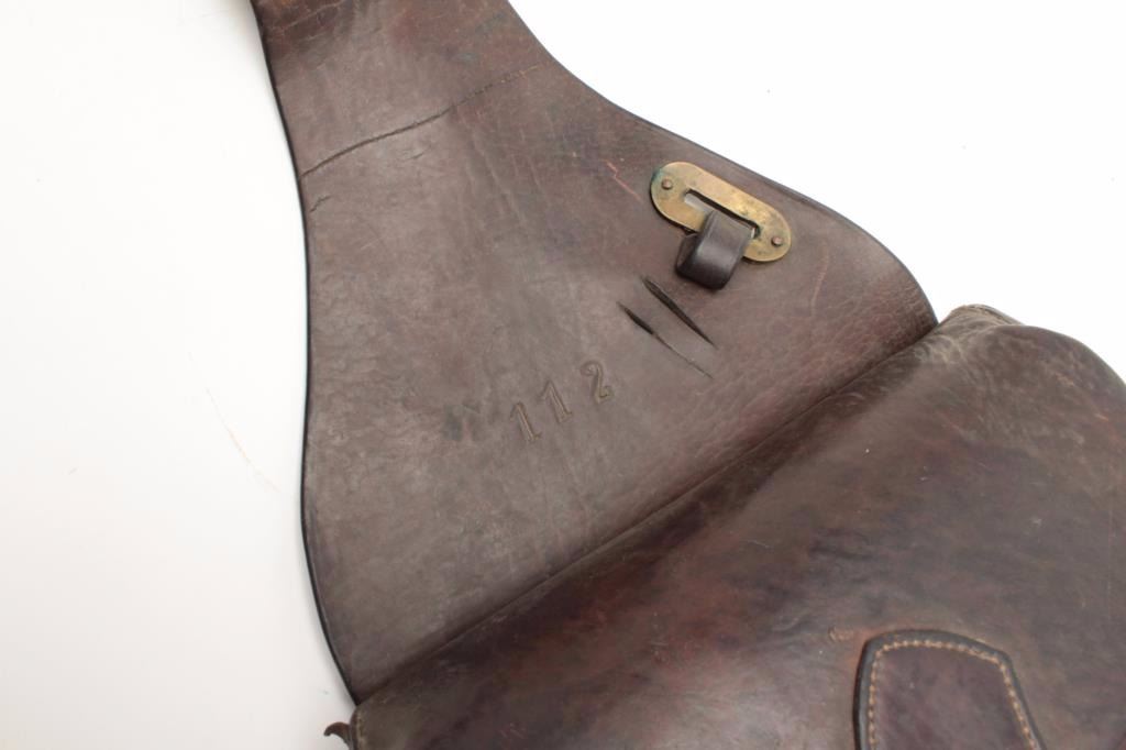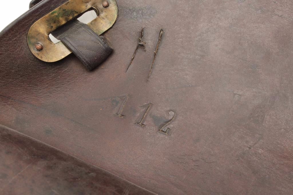 Pair of brown leather with brass mountings saddle bags; stamped #112; about 1900 vintage/WW I; very good overall condition; military style. Est.: $100-$200.