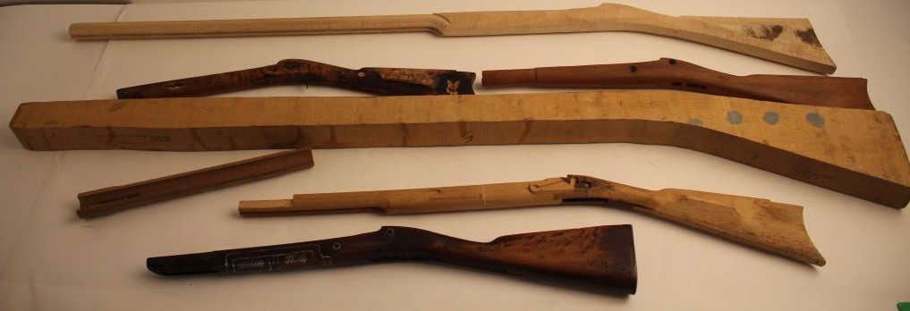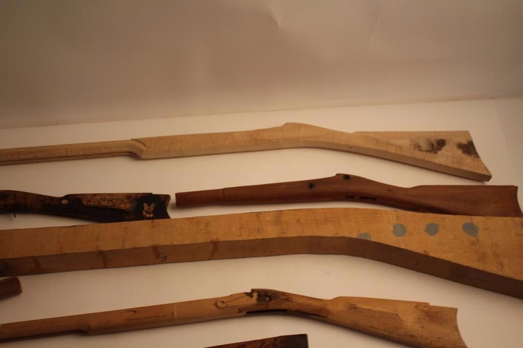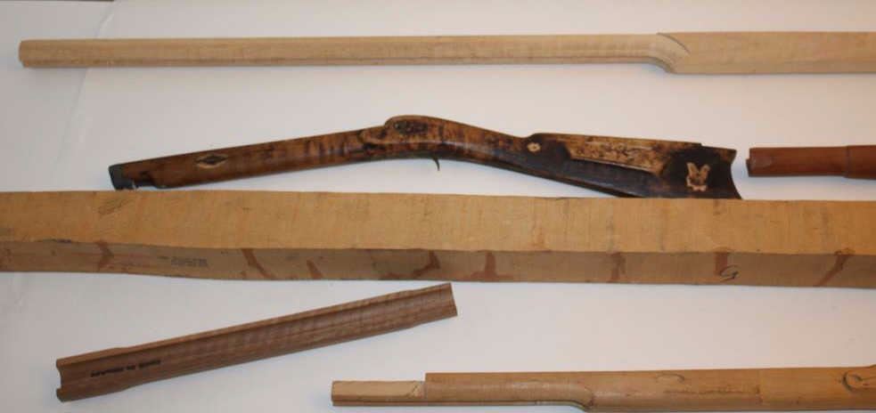 Bonanza lot for antique gunsmith or rifle maker; original Kentucky ½ stock wood; Northwest style carved trapdoor stock; two blanks for Kentucky long rifles (one already roughed out); plus two other stocks. Est.: $250-$500.