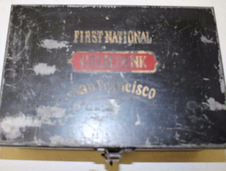 Japanned black metal cash box painted on lid “First Nation/Gold Bank/San Francisco”; about 50% paint remains; 20th century; approximately 9.5” x 6.5” x 4”. Est.: $100-$300.