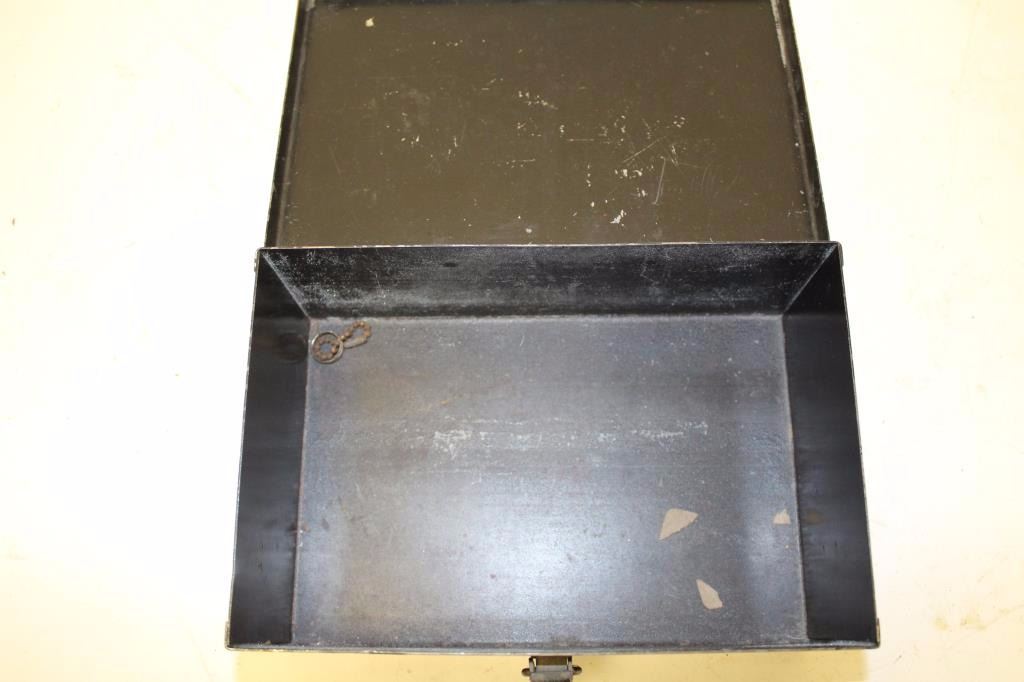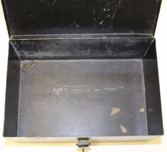 Lot 1258 Japanned black metal cash box painted on lid “First Nation/Gold Bank/San Francisco”; about 50% pai