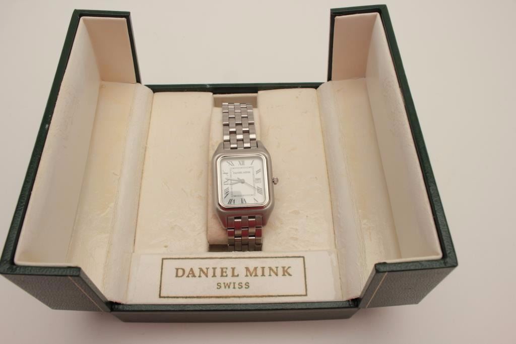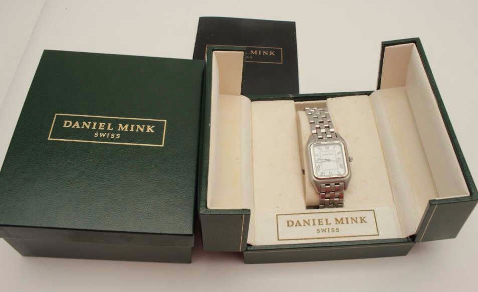 Daniel Mink (Swiss) tank watch in box with instructions, excellent condition and running at time of description. Est.: $200-$400.