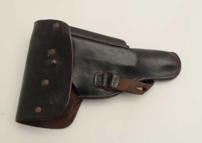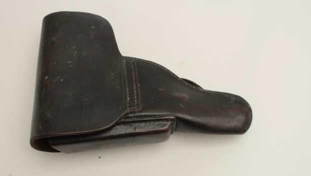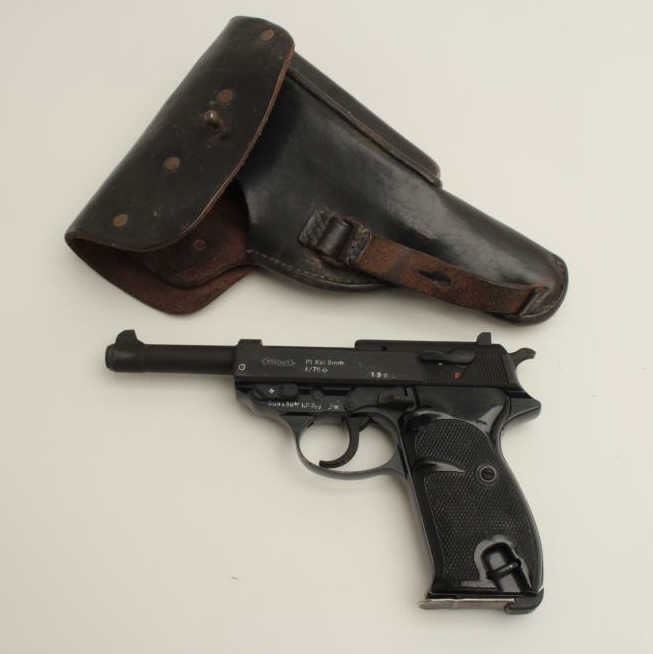 Walther Model P1 DA semi-automatic pistol, 9mm caliber, 5” barrel, black finish, checkered black grips, S/N 050136W, in overall fine condition with majority of finish remaining, fine bore, action, markings and grips. Accompanied by a military or police-style leather flap holster. (Modern/PPT). Est.: $250-$500.