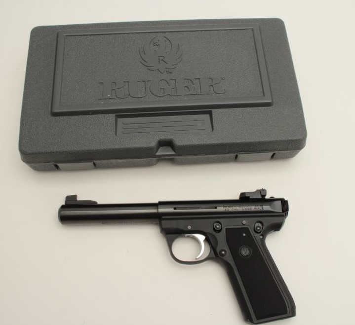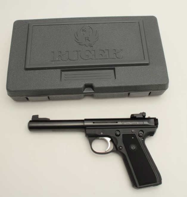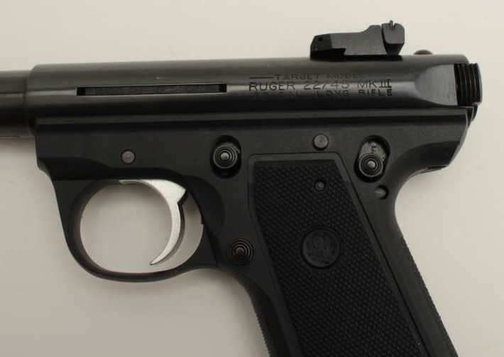 Ruger Model 22/45 MK III semi-automatic pistol, .22LR caliber, 5.5” barrel, black finish, checkered grips, loaded chamber indicator, S/N 272-03937, in overall like new condition, with instructions, hardcase, oneextra magazine and scope base. (Modern/PPT). Est.: $250-$500.