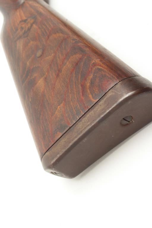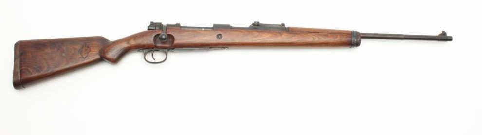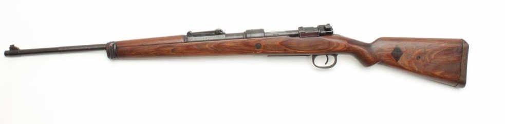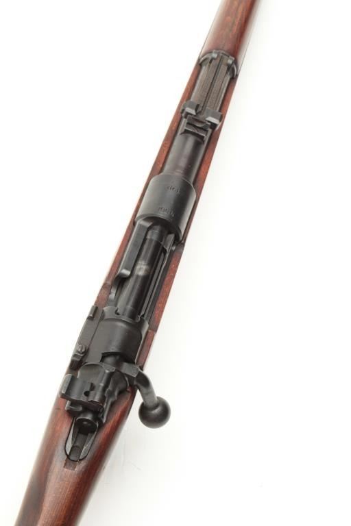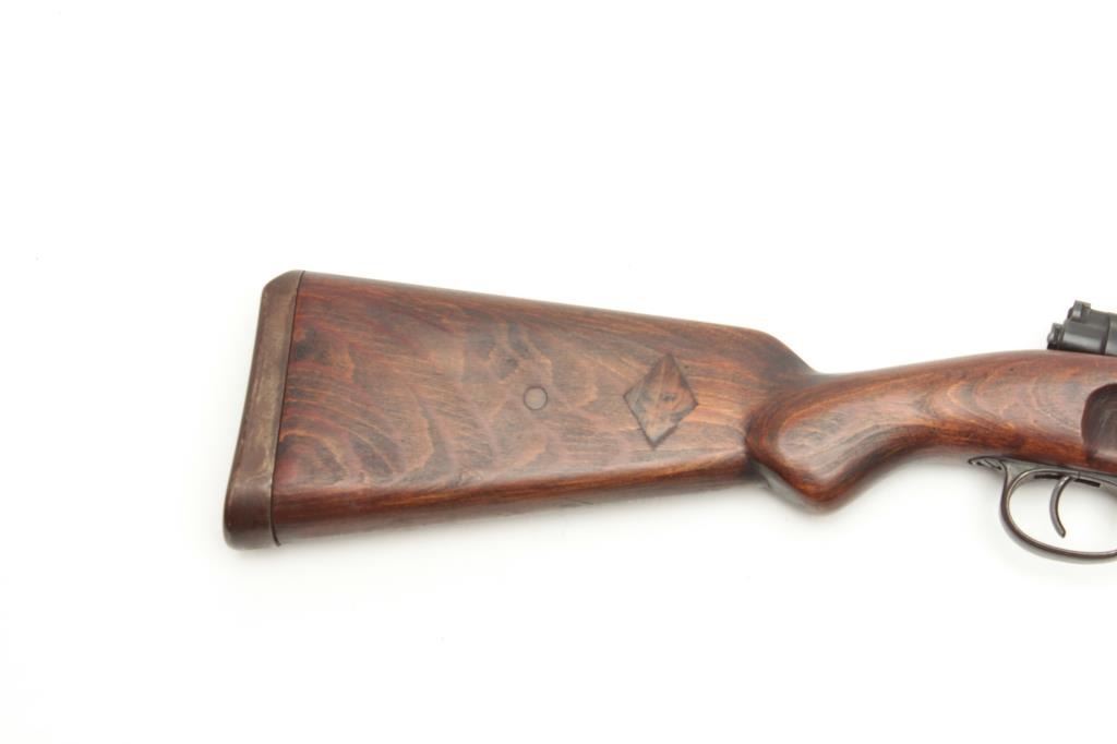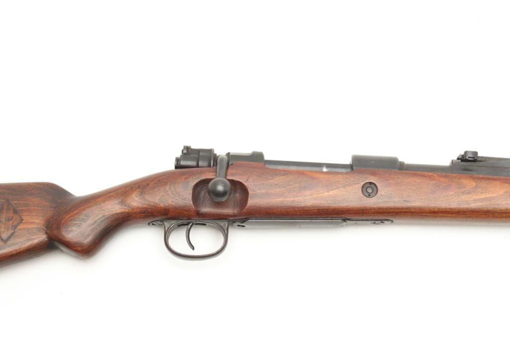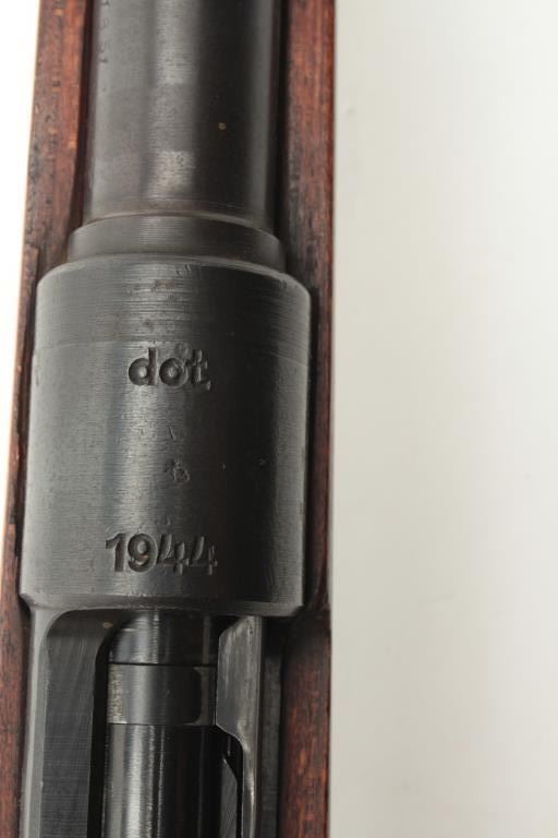 WWII German Model 98 Mauser bolt action rifle, 8 x 57 caliber, serial #NSNV. The rifle is in good overall condition with a 24” barrel with a ramp front and military style tangent rear sights. The barrel and receiver retain the majority of their military finish. The front ring is marked, “dot” and dated 1944, while there are numerous Nazi proofs on the receiver, barrel and magazine plate. The stock has been cut at thehandguard and re-finished during the period of use. The butt stock has had crude inlays done in a diamond shape on both sides and ends with a smooth steel butt plate. The bore is good, the action functions and themarkings are sharp. (C+R) Est.: $250-$500.