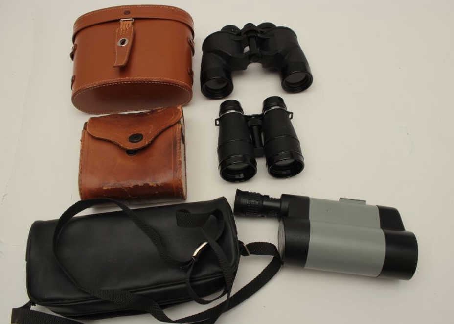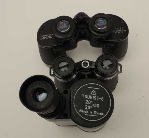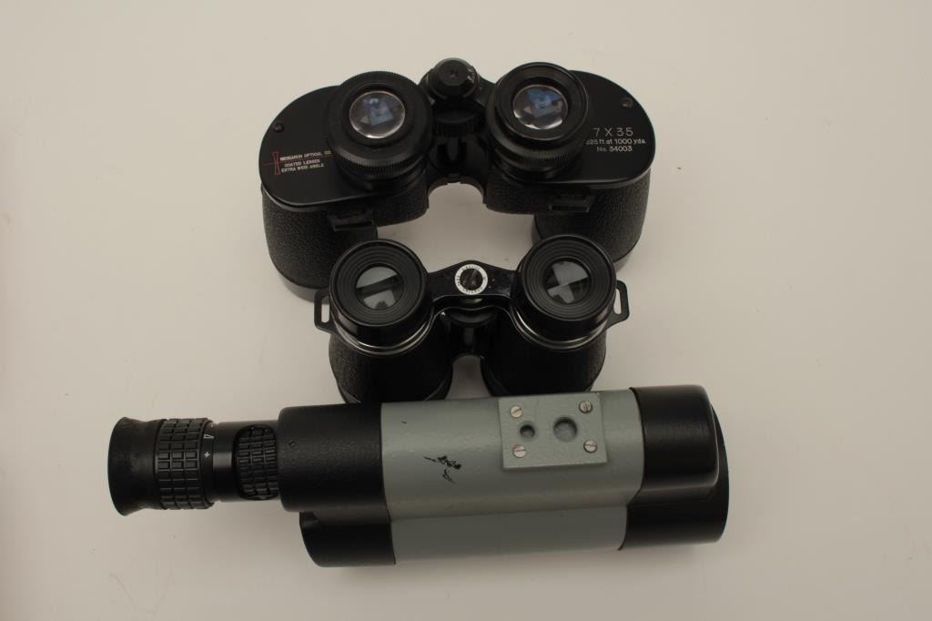 Lot of 2 binoculars and monocular as described: 1 4x40 air guide, Chicago in very good plus condition. The case is fair (leather) aged. 2. Research optical extra wide lens 7x35(525ft at 1000 yards) #34003. Excellent and clear. Made in Japan. 3. Monocular marked “tourist 6” 20x30x50. Made in Russia. Good condition. Est.: $100-$300