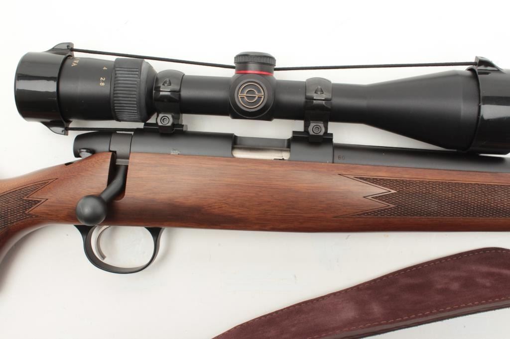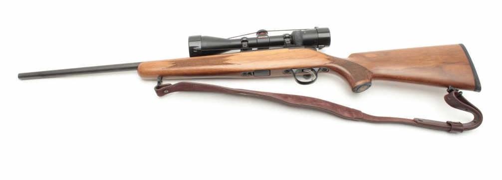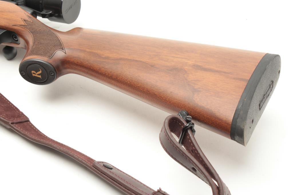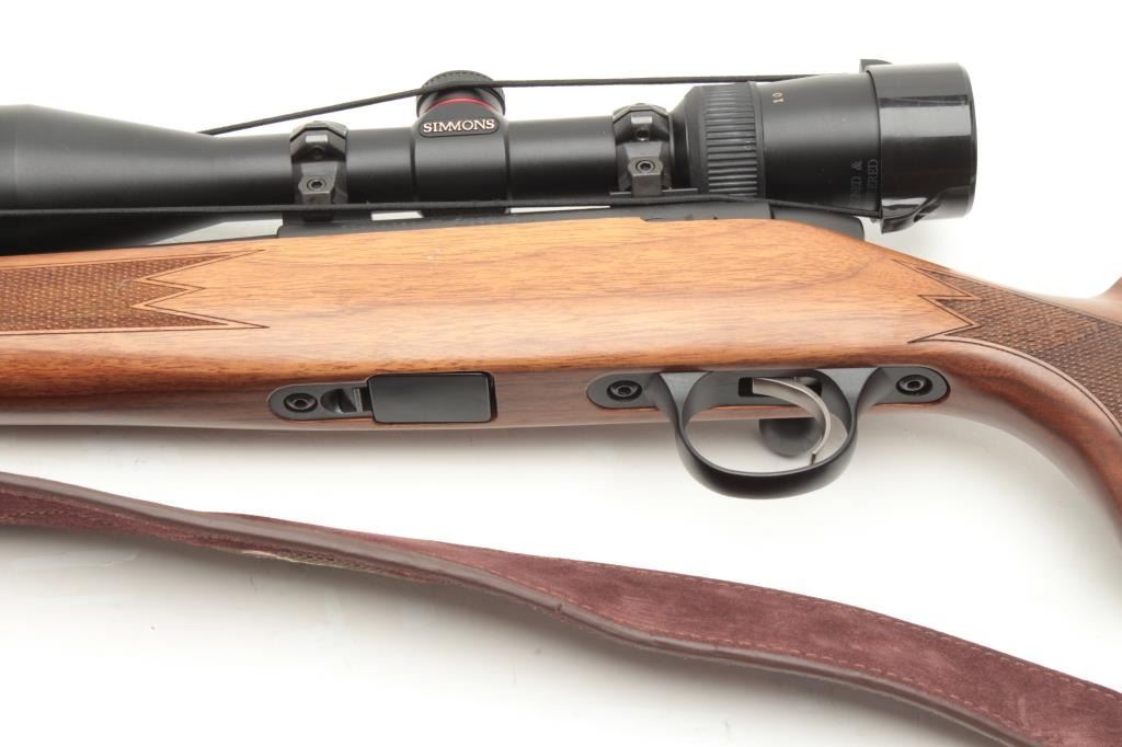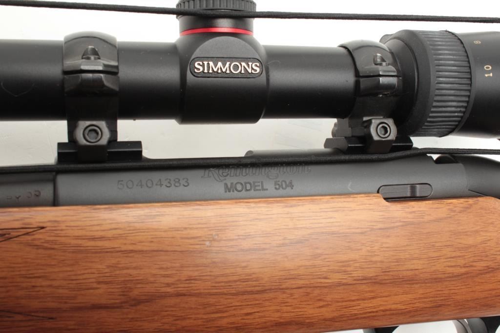 Remington Model 504 bolt action rifle, .22LR caliber, 20.5” barrel, blued finish, checkered wood stock, Allen leather sling, S/N 50404383, in overall fine to excellent condition and mounted with a Simmons scopedisplaying fine optics. (Modern/PPT). Est.: $250-$500.