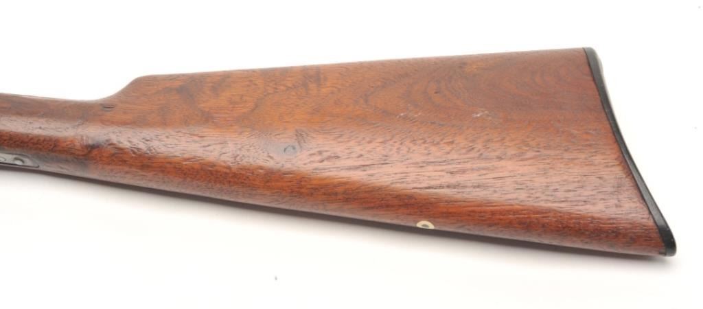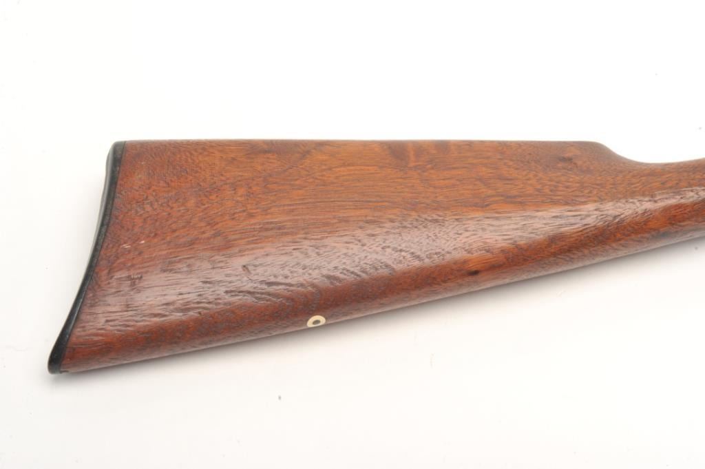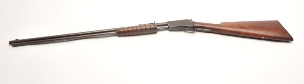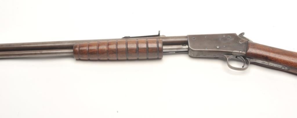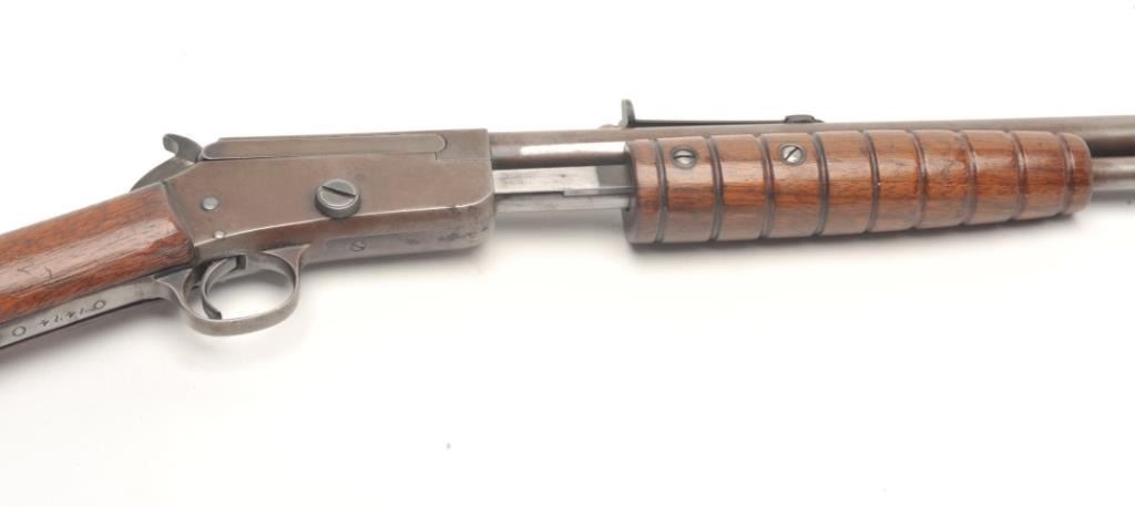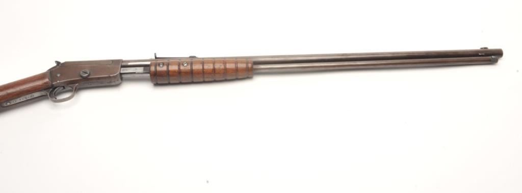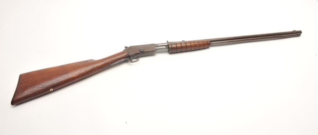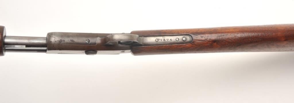 Marlin Model 37 takedown pump rifle, .22 S., L., and L.R. caliber, serial #7474. The rifle is in good overall condition with a 24” round barrel. The barrel, magazine and receiver have all gone entirely to a brownpatina with light surface erosion noted. The receiver has a couple extra holes from an old side mount which have been filled well. The smooth wood stocks are in good condition showing moderate wear with small mars andcompressions. The butt stock has weathered slightly and ends with a Marlin marked plastic butt plate. The bore is good, the action crisp and markings are sharp. (C+R) Est.: $150-$300.