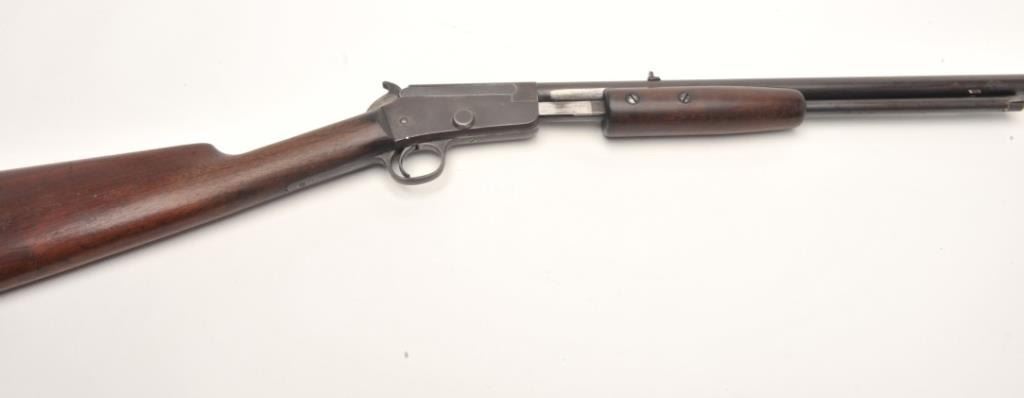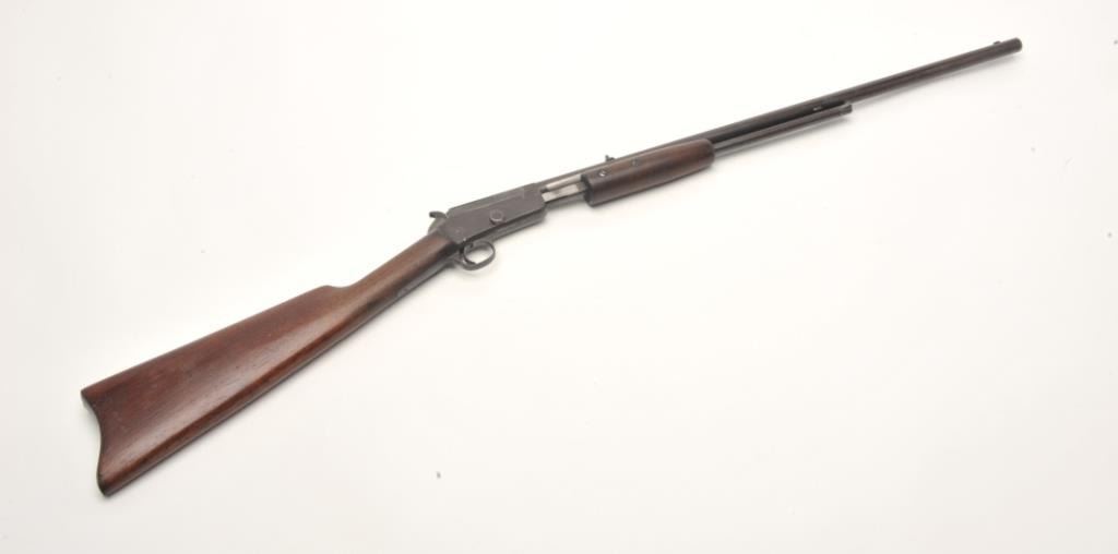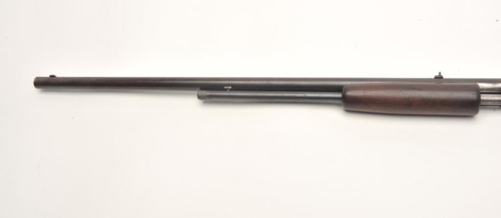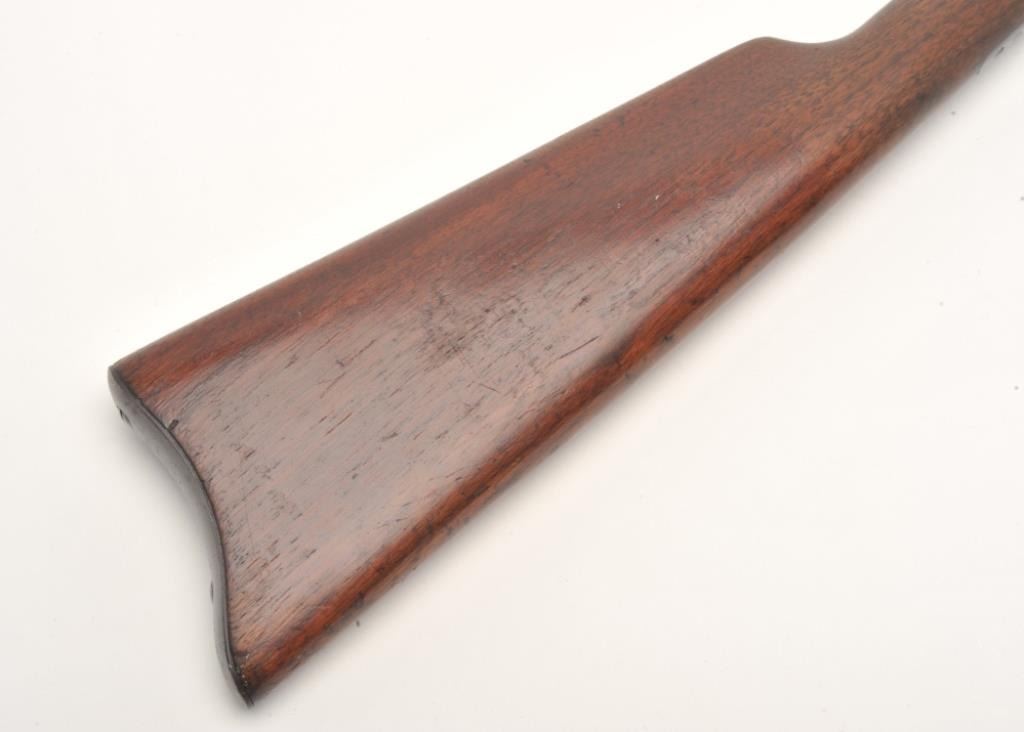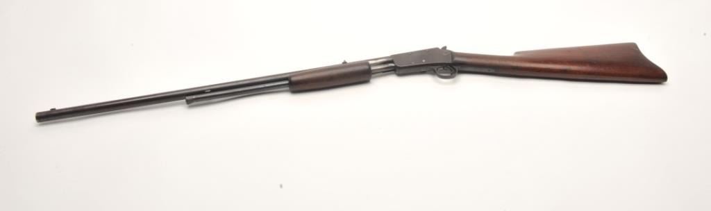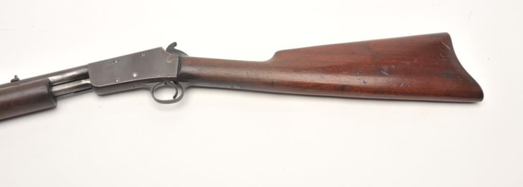 Marlin No.29 takedown pump rifle, .22 S., L. and L.R. caliber, serial #NSNV. The rifle is in fair overall condition with a 23” round barrel. The barrel, ½ magazine and receiver have all gone entirely to a dark patina withlight surface erosion noted. The smooth wood stocks are in good condition with mars and handling marks. There is a small area of damage behind the tang and the butt stock ends with a smooth metal butt plate. The bore is poor, the action works and the markings are legible. (C+R) Est.: $150-$300.