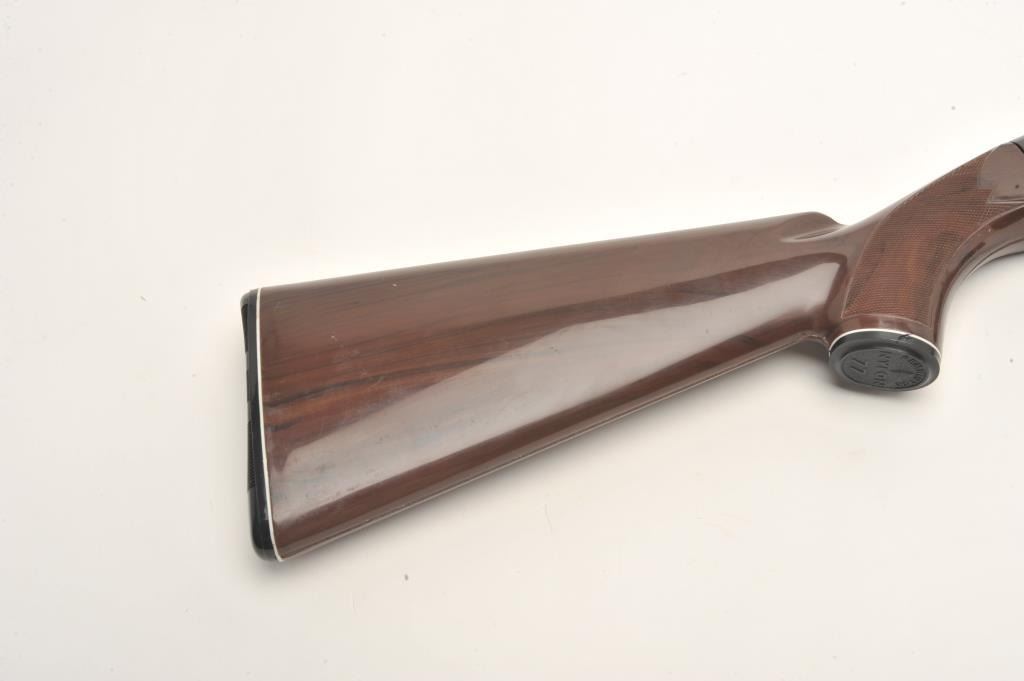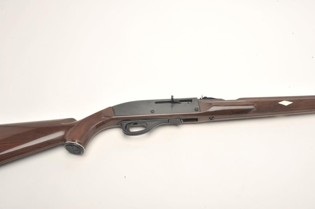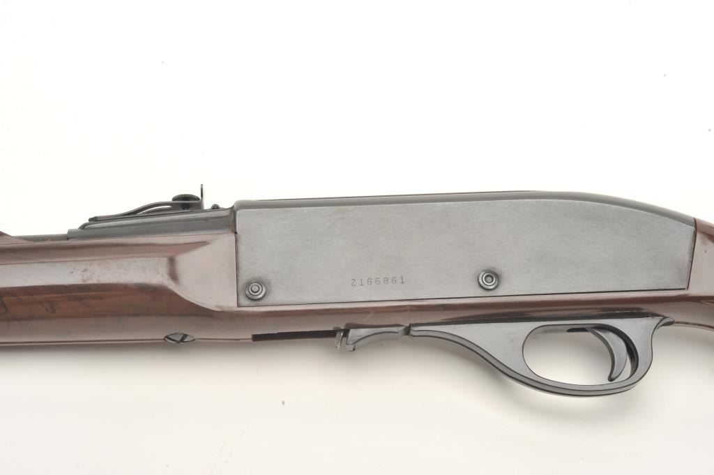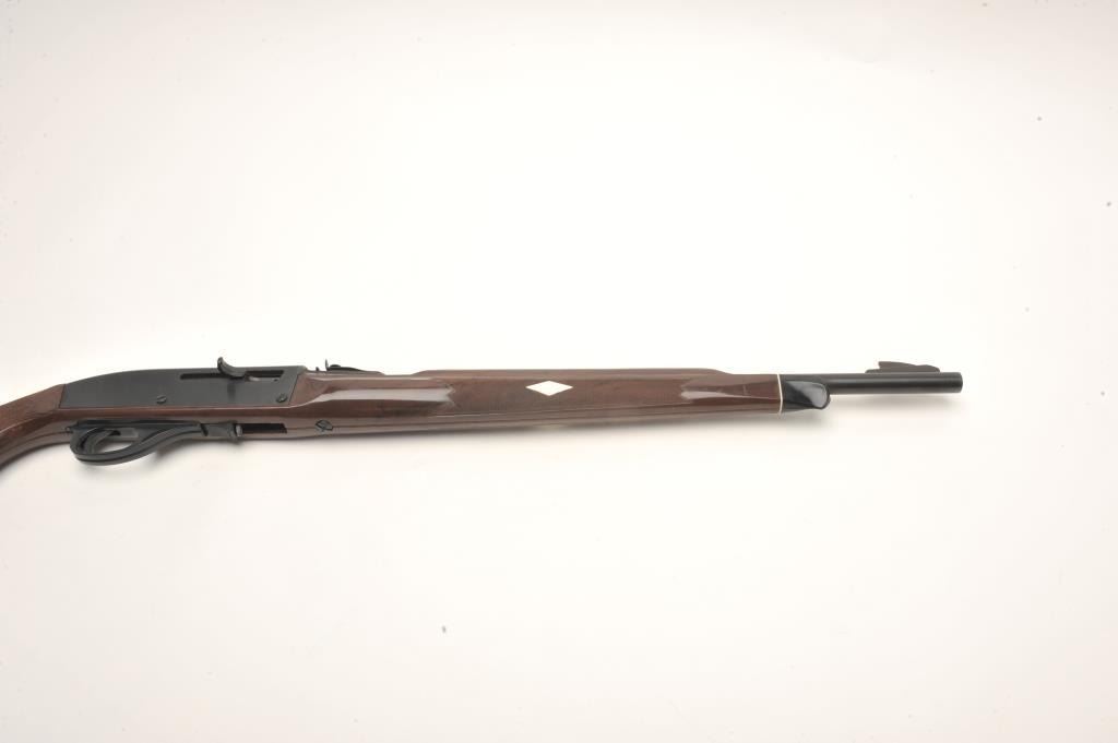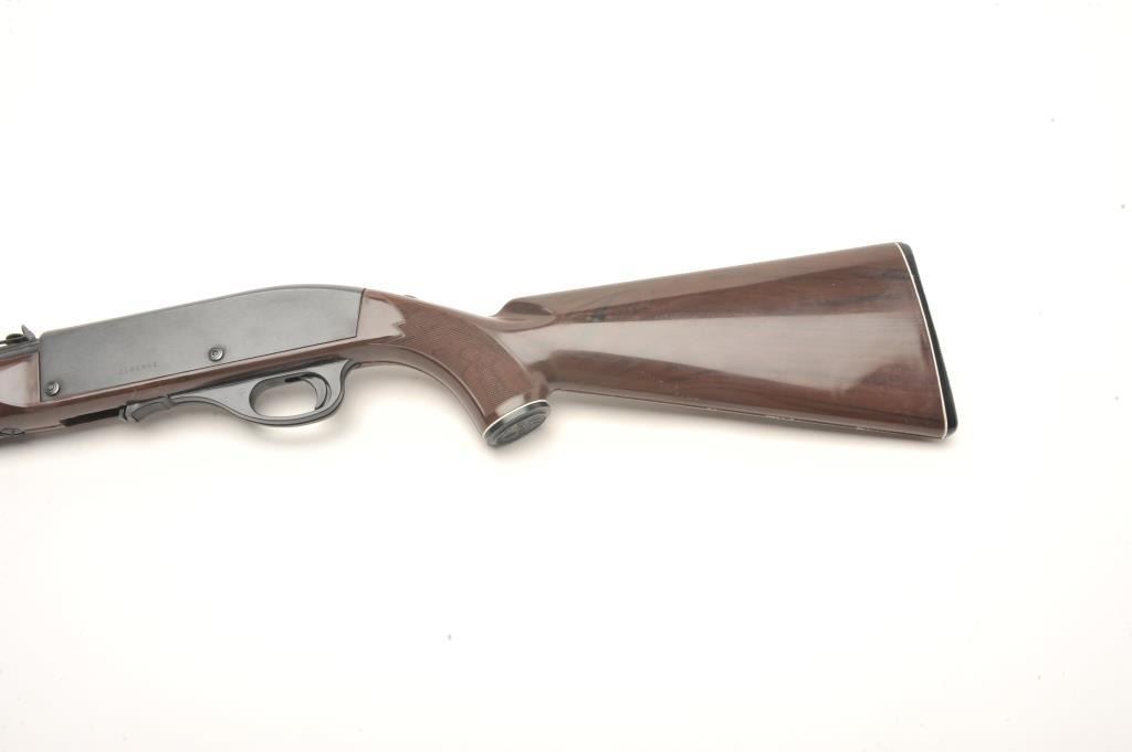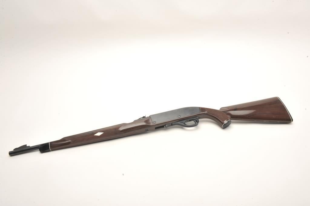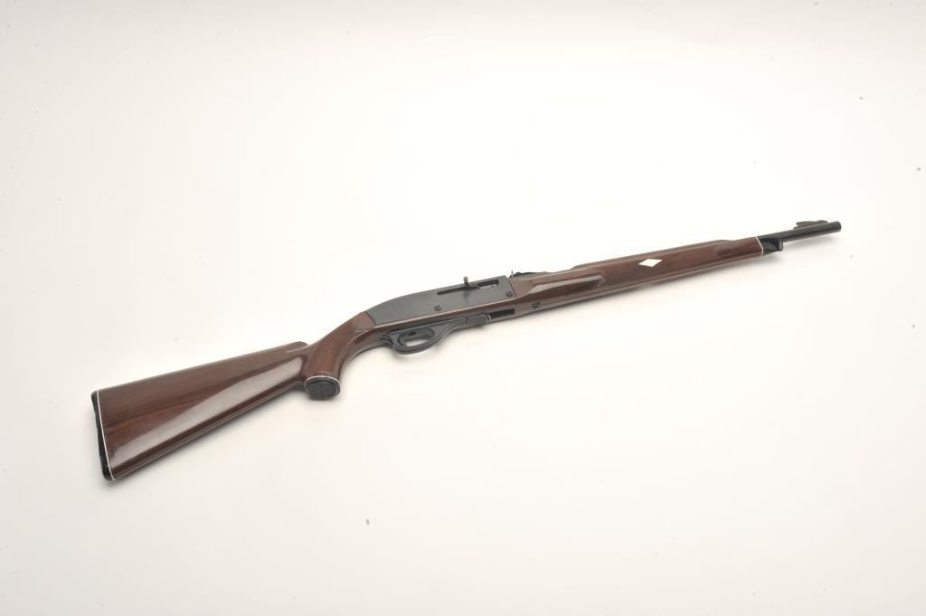 Remington Nylon 77 semi-auto rifle, .22 L.R. caliber, serial #2166861. The rifle is in very good condition with a 20” barrel. The barrel and receiver retain nearly all of their blued finish with only handling marksand light wear at the muzzle. The checkered brown synthetic stock is in very good condition with handling and storage marks noted. The bore is good, the action crisp and markings are sharp on this desirableRemington. The lot does not include a magazine. (Modern) Est.: $200-$400.