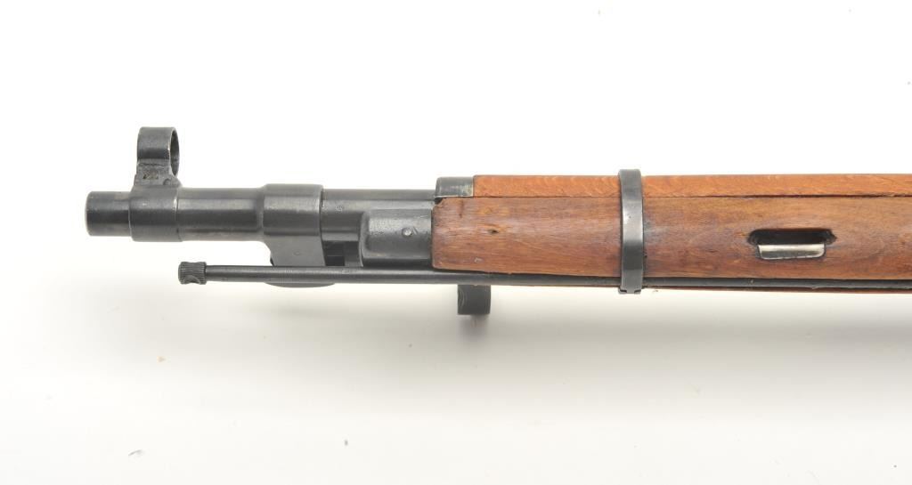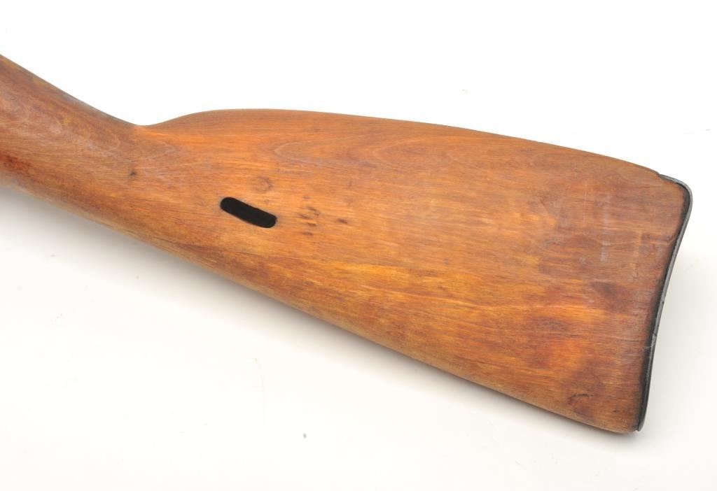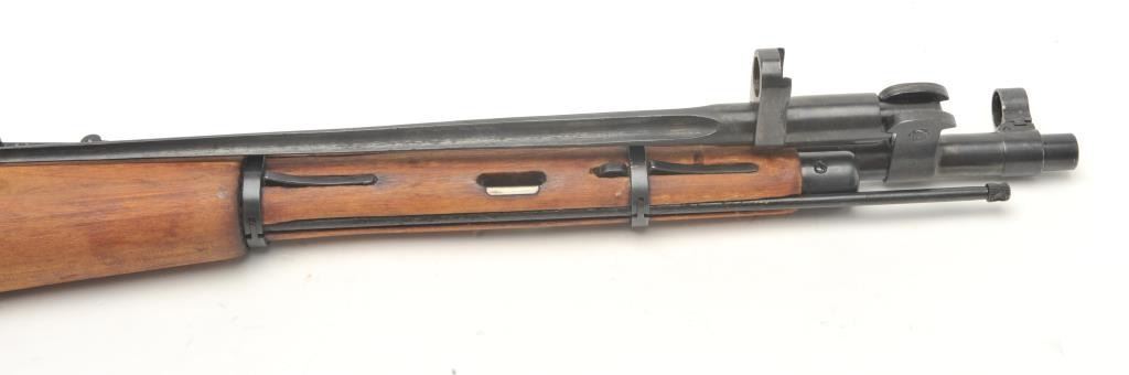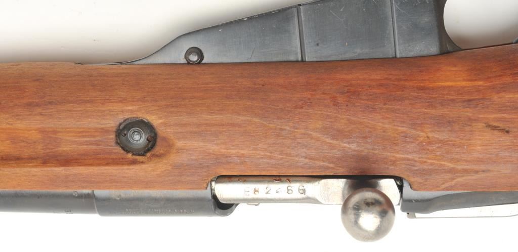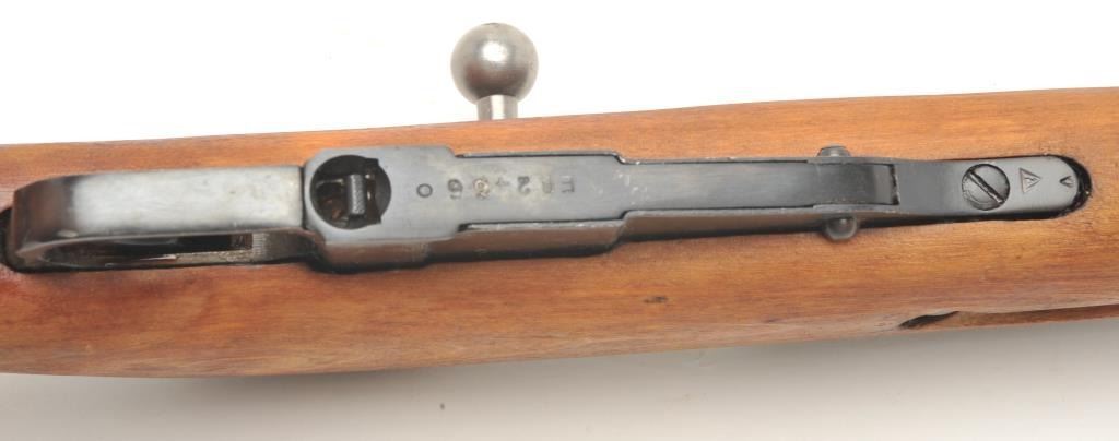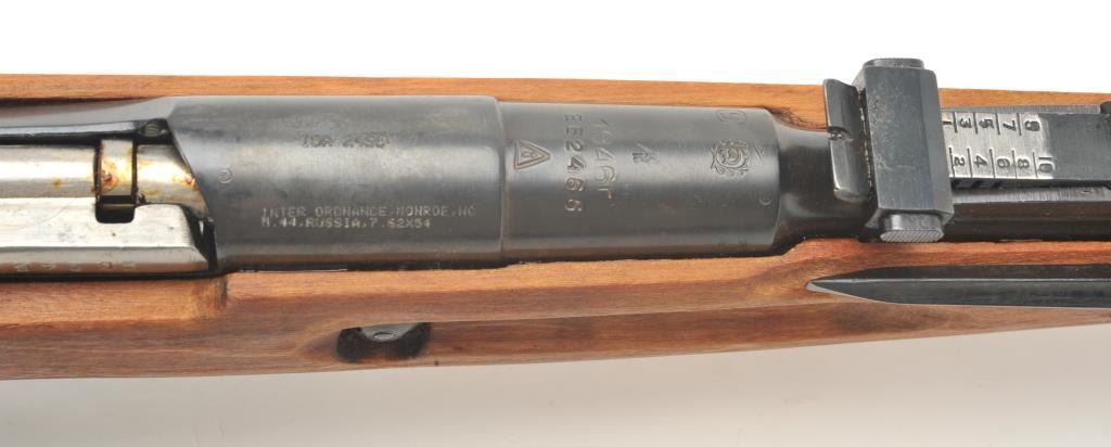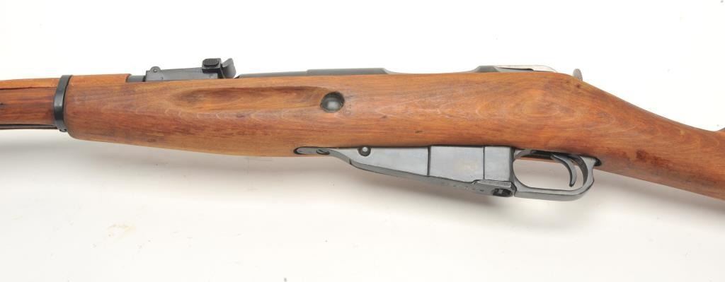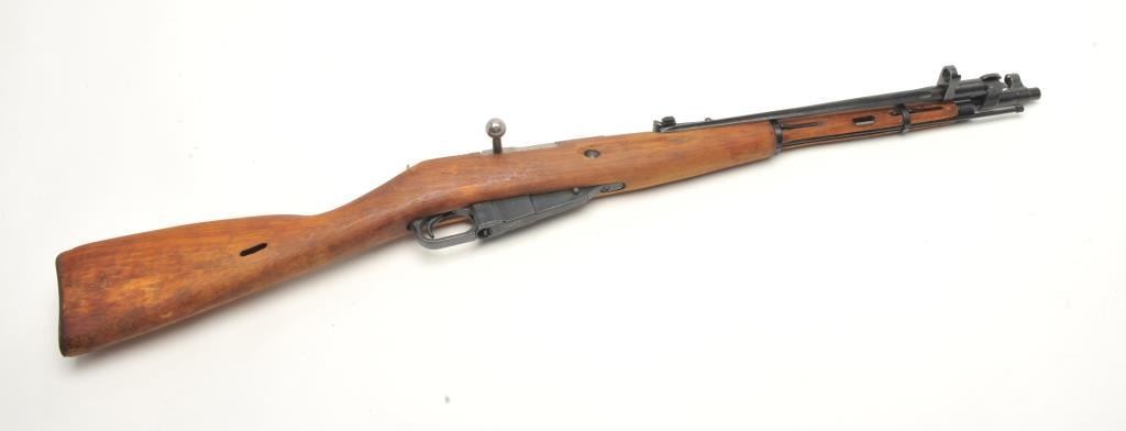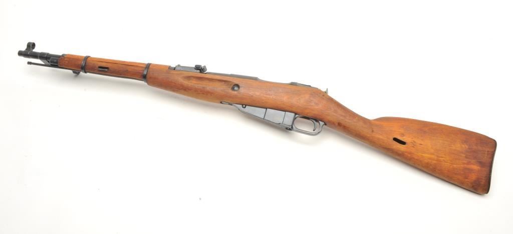 Russian Mosin Nagant Model M38 carbine, 7.62 x 54 caliber, serial #EB2466. The carbine is in very good overall condition with a 21” barrel with a hooded front and military tangent style rear sights. The barrel andreceiver retain the majority of their military finish. The receiver has numerous proofs with the front ring dated 1946. The carbine includes original proprietary folding bayonet and cleaning rod. The smooth woodstock is in very good condition with storage marks, dried cosmoline and a smooth metal butt plate. The action is import marked. The bore is fair, the action crisp and markings are sharp. (C+R) Est.: $175-$350.