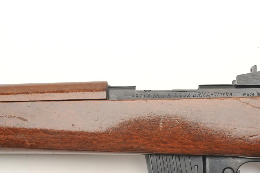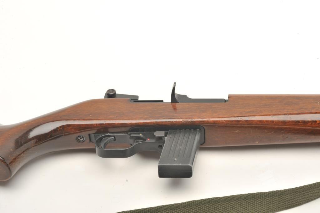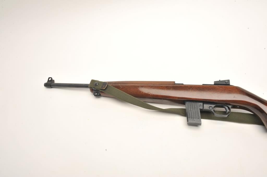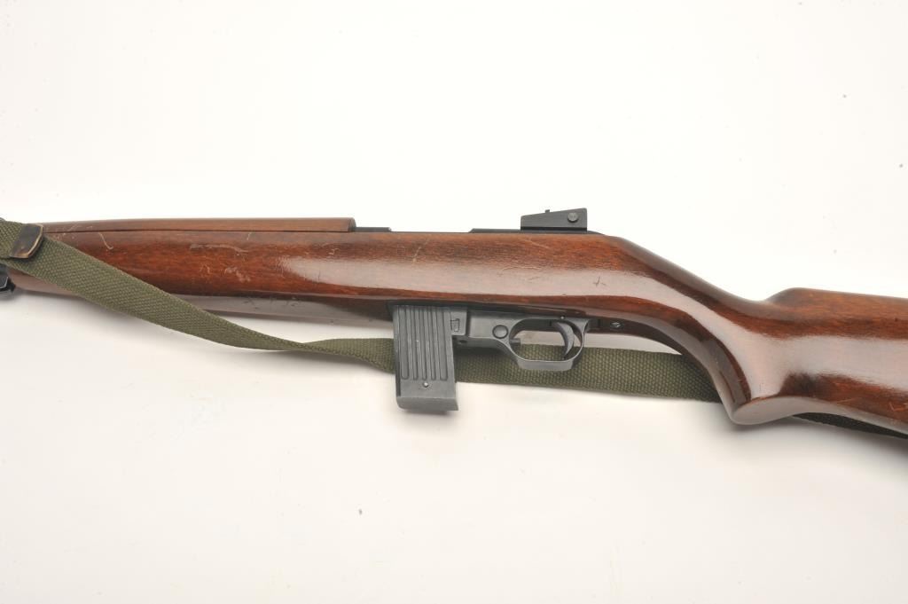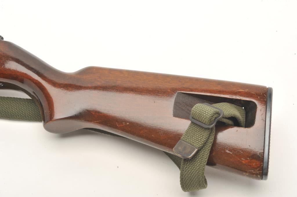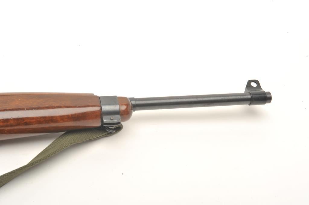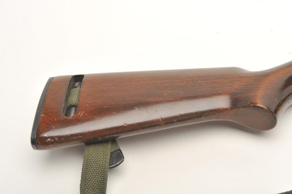 Iver Johnson U.S. M1 carbine, .22 L.R. caliber, serial #000436. The carbine is in very good to nearly fine overall condition with an 18” barrel. The barrel and receiver retain nearly all of their military stylefinish with only handling marks noted and the receiver marked made in Germany. The smooth wood stock is in very good condition with only storage marks. The butt stock ends with a checkered metal butt plate. The bore isgood, the action crisp and markings are sharp. The lot includes an OD green canvas sling. No Magazine. (Modern) Est.: $150-$300.