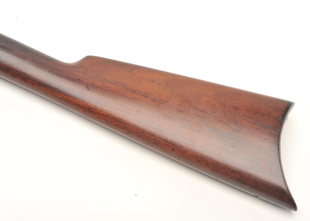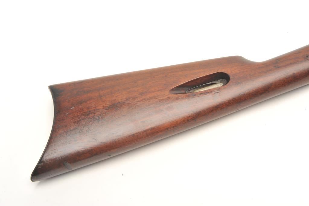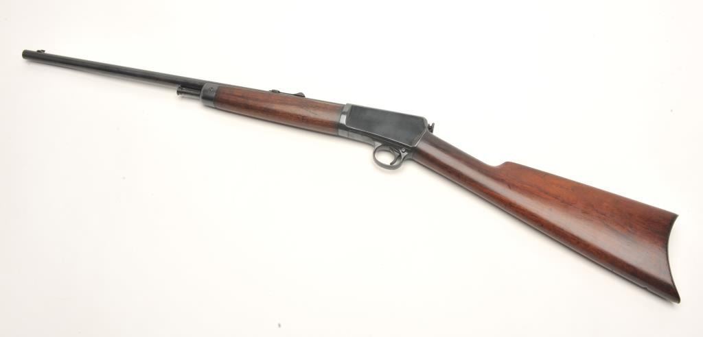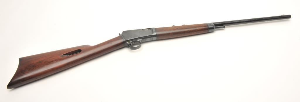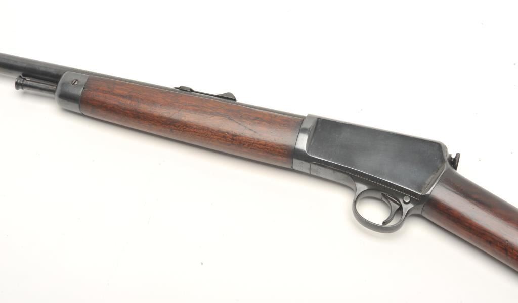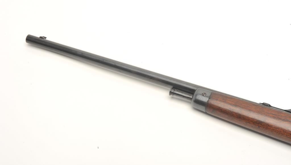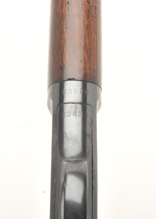 Winchester Model 03 semi-auto rifle, .22 caliber, serial #63820. The rifle is in very good overall condition with a 20” round barrel. The barrel and receiver retain a significant amount of their blued finish with light surface rust on the underside of the barrel. The smooth wood stocks are in very good condition with small mars and compressions. The butt stock ends with a checkered steel butt plate. The bore isgood, the action crisp and the markings are sharp. (Modern) Est.: $200-$400.
