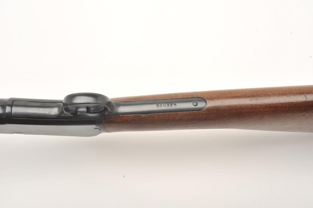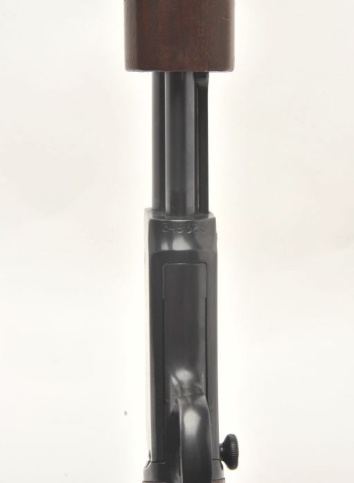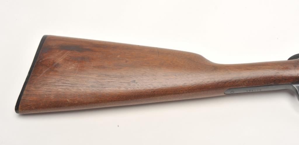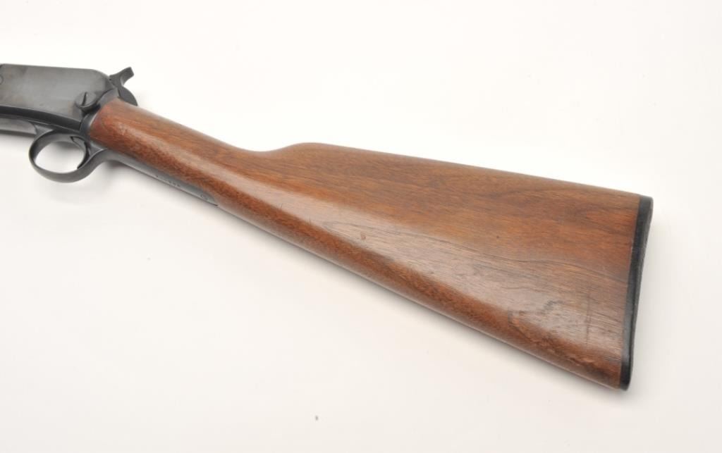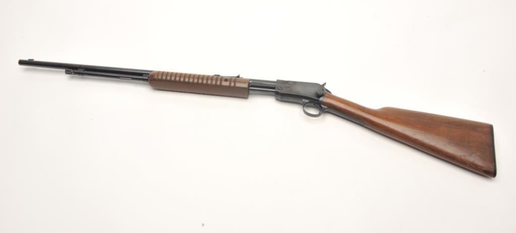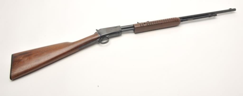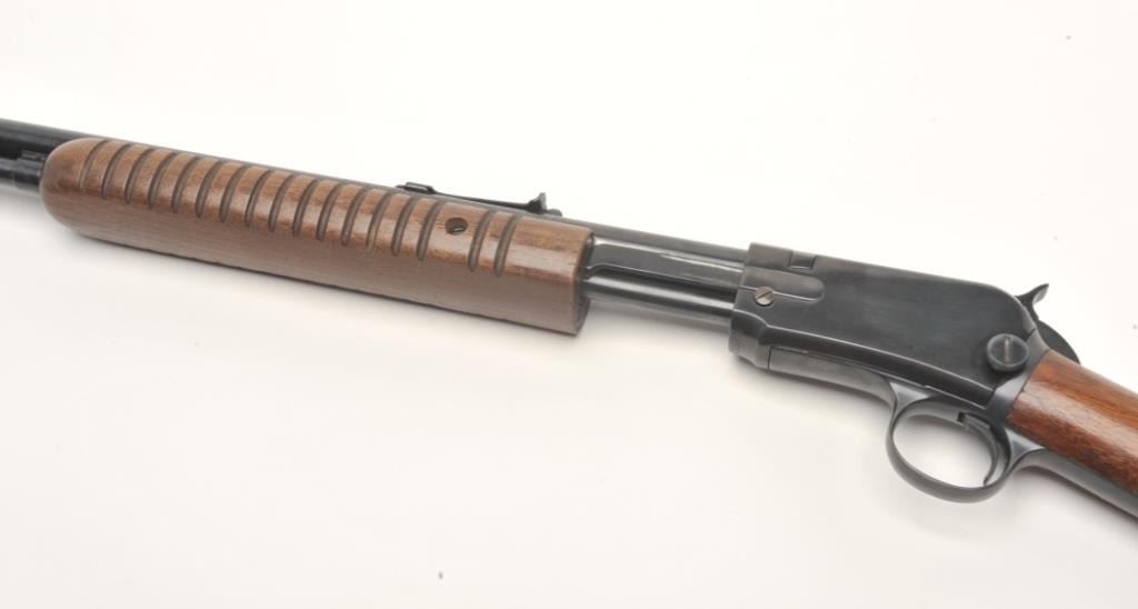 Winchester Model 62A takedown pump rifle, .22 S., L. or L.R. caliber, serial #349325. The rifle is in very good condition with a 23” round barrel. The barrel, ¾ magazine and receiver retain the majority of their bluedfinish. The smooth wood stocks are in very good condition showing small handling marks and slight loss of finish. The butt stock ends with a plastic, Winchester marked butt plate. The bore is good, the action crisp and markings are sharp on this lightly used Winchester. (C+R) Est.: $200-$400.