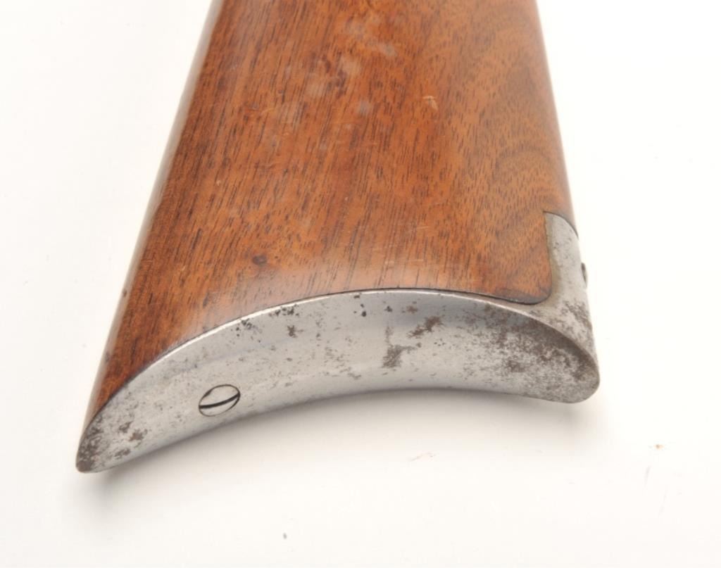 Winchester Model 1890 takedown pump rifle, .22 Long Rifle caliber, serial #486969. The rifle is in good overall condition as re-finished with a 24” octagon barrel. The barrel, magazine and receiver retain asignificant amount of an old, quality re-blue. The trigger guard, tang and butt plate are polished nickel. The smooth wood stocks are in good condition with small mars and compressions consistent with use. Thebutt stock has received an old coat of varnish and ends with a smooth metal crescent butt plate. The bore is fair, the action crisp and markings are sharp. (C+R) Est.: $150-$300.