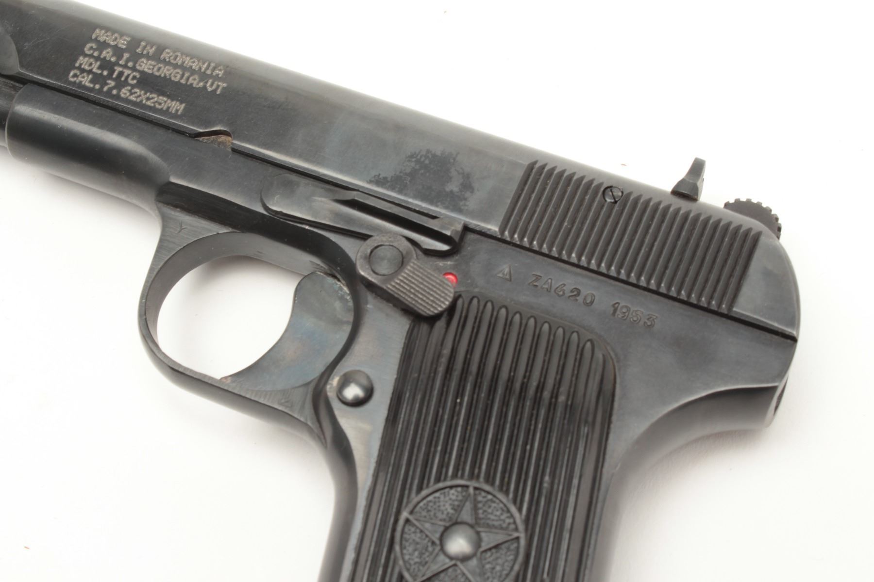 Romanian-made Tokarev Model TTC semi-automatic pistol, import marked (C.A.I.), 7.62mm caliber, 4.5” barrel, blued finish, black plastic grips, S/N ZA620 (1953), in overall good condition asre-furbished, crisp action and markings, fair bore, good grips; accompanied by an extra magazine. (C&R/PPT). Est.: $200-$400.