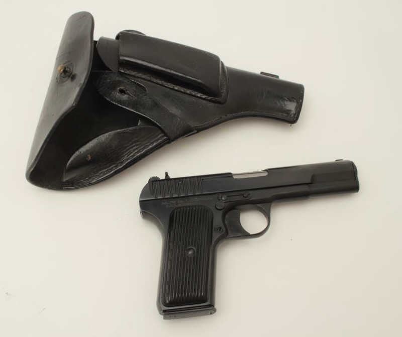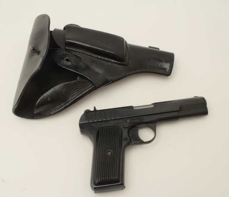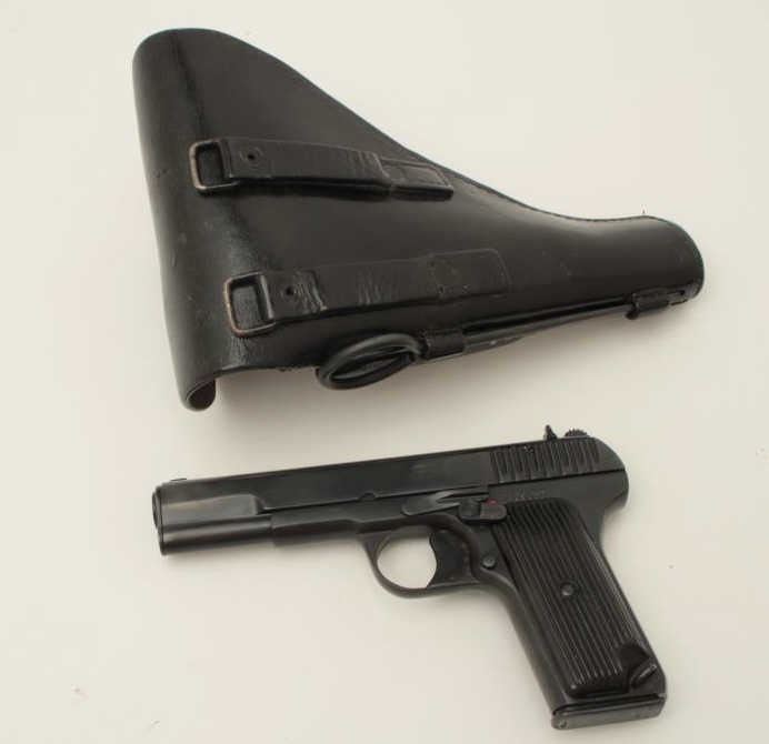 Romanian-made Tokarev Model TTC semi-automatic pistol, import-marked (C.A.I.), 7.62mm caliber, 4.5” barrel, blued finish, black plastic grips, S/N PA09650, in overall very good + condition with crispaction, sharp markings and very good to near fine bore; near fine grips and accompanied by a flap leather holster, cleaning rods, an extra magazine and cardboard shipping box with owner’s manual. (Modern/PPT). Est.: $200-$400.